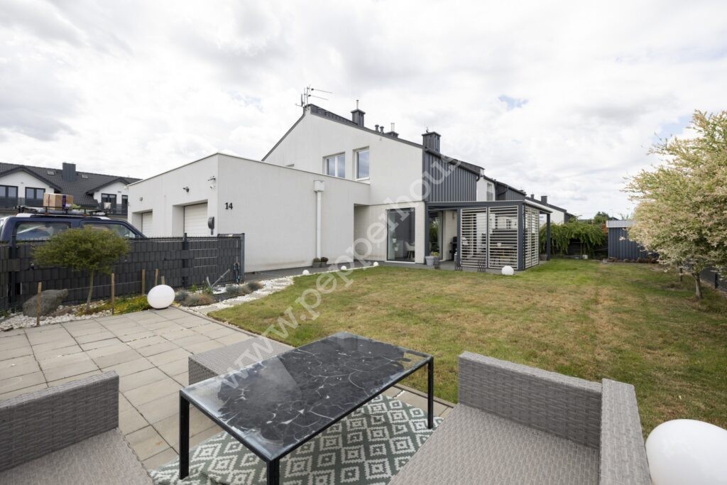 Przestronny dom o łącznej powierzchni użytkowej 118,37m2 został posadowiony na działce o powierzchni 312m2. Wnętrze domu zostało wykończone w nowoczesnym stylu, z dbałością o każdy detal. Serce domu stanowi przestronny salon z aneksem kuchennym, łącznie prawie 34m2 – ponad 11m2 funkcjonalnej i w pełni wyposażonej kuchni, która zadowoli nawet najbardziej wymagających domowników. Duże przeszklenia zapewniają doskonałe oświetlenie wnętrza, a otwarta przestrzeń stwarza idealne warunki do codziennego relaksu oraz przyjmowania gości.