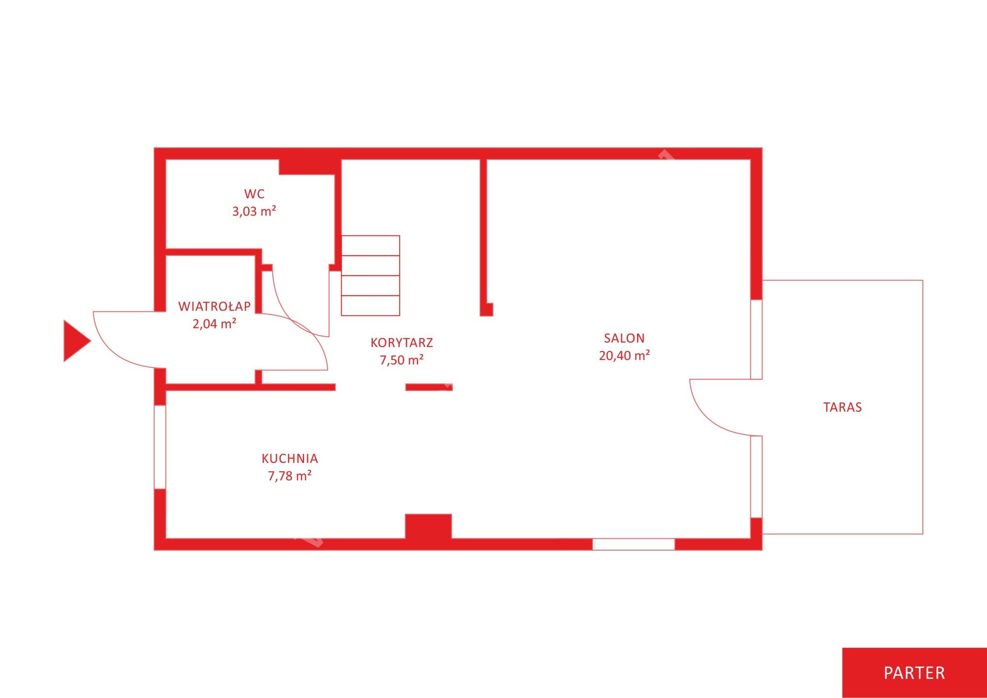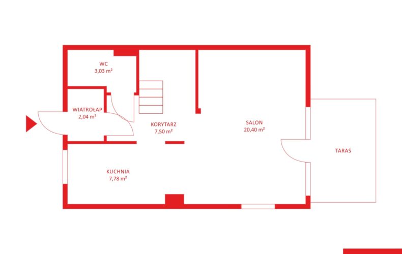 PARTER: wiatrołap (2,04m2); korytarz (7,5m2), kuchnia (7,78m2); salon (20,40m2), toaleta (3,03m2) – łącznie 40,76m2