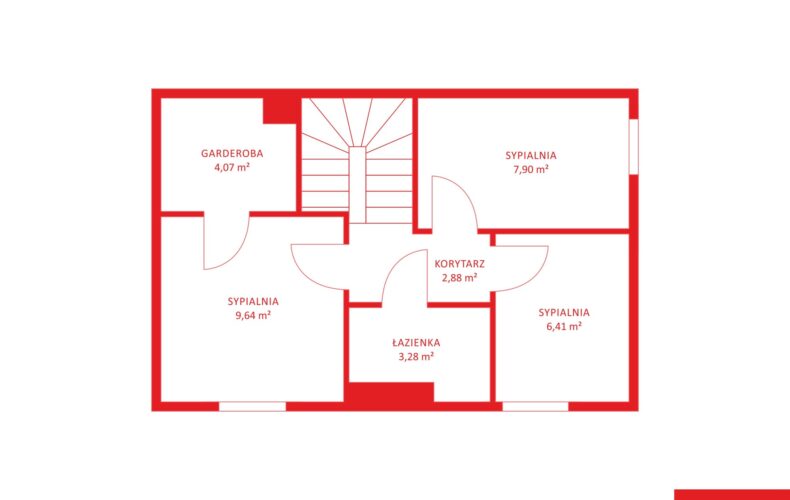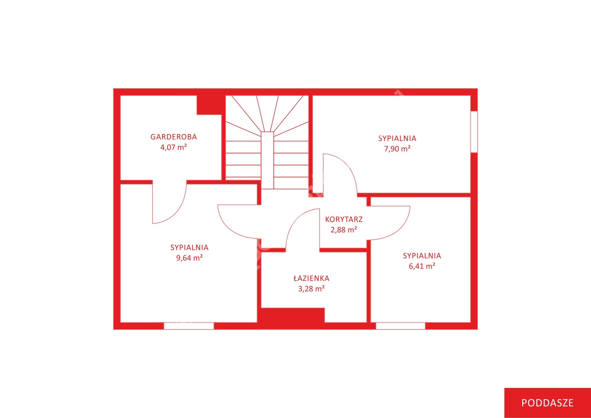 PODDASZE: korytarz (2,88m2); pokój (6,41m2); pokój (7,90m2); pokój (9,64m2), łazienka (3,27m2), garderoba (4,07m2) – łącznie 34,18m2