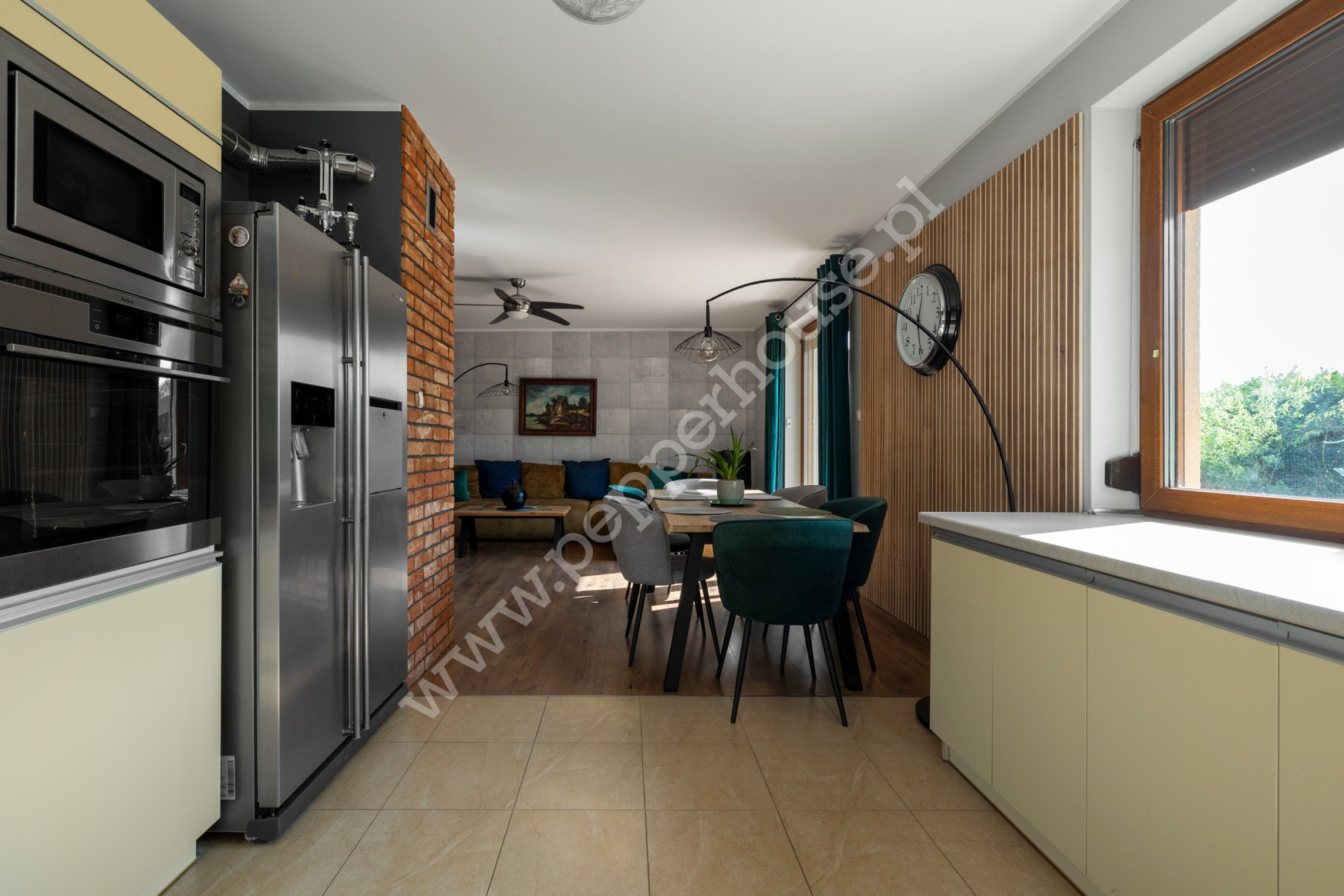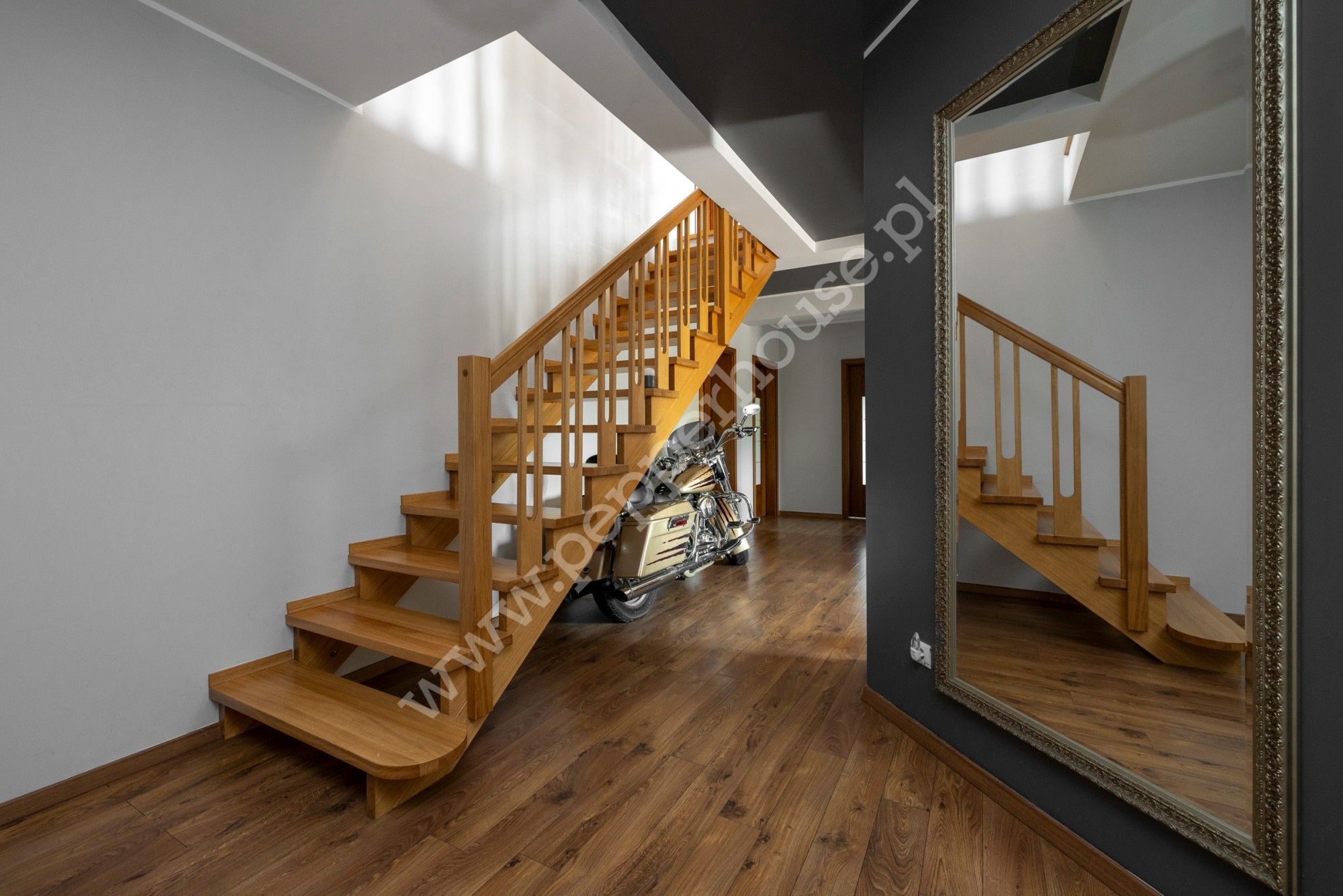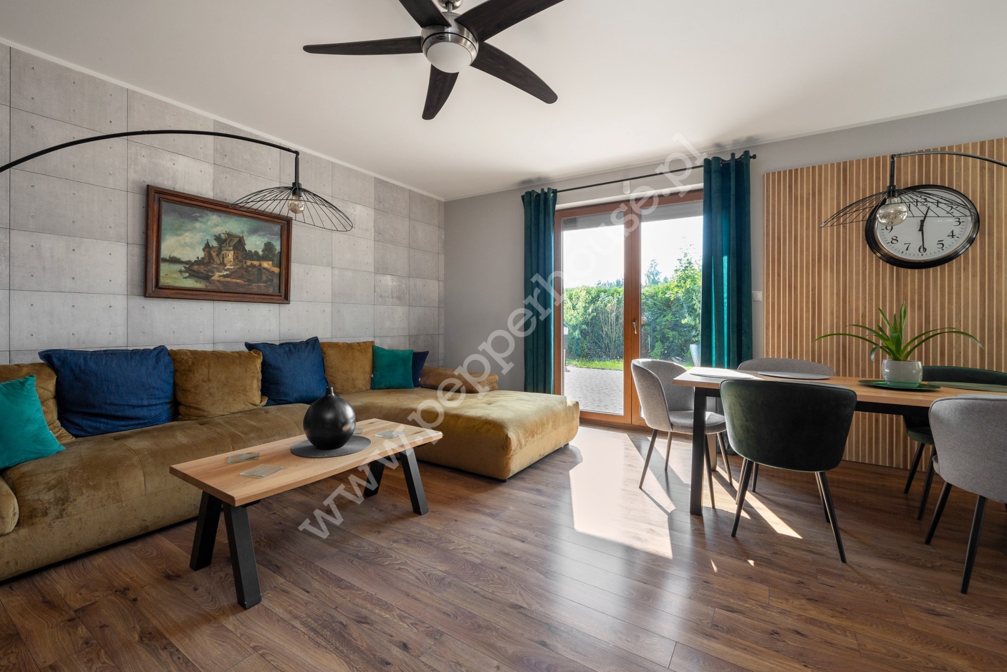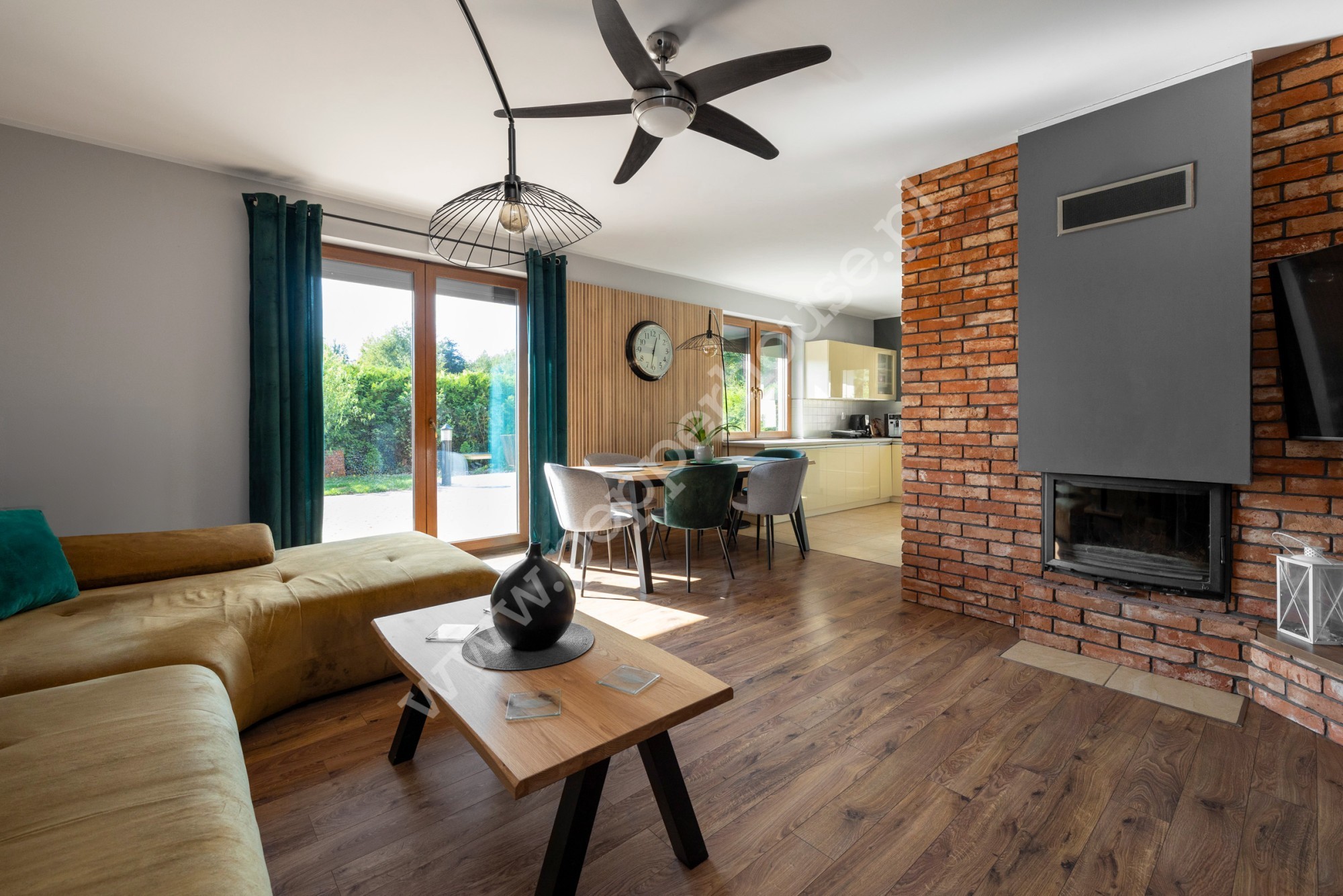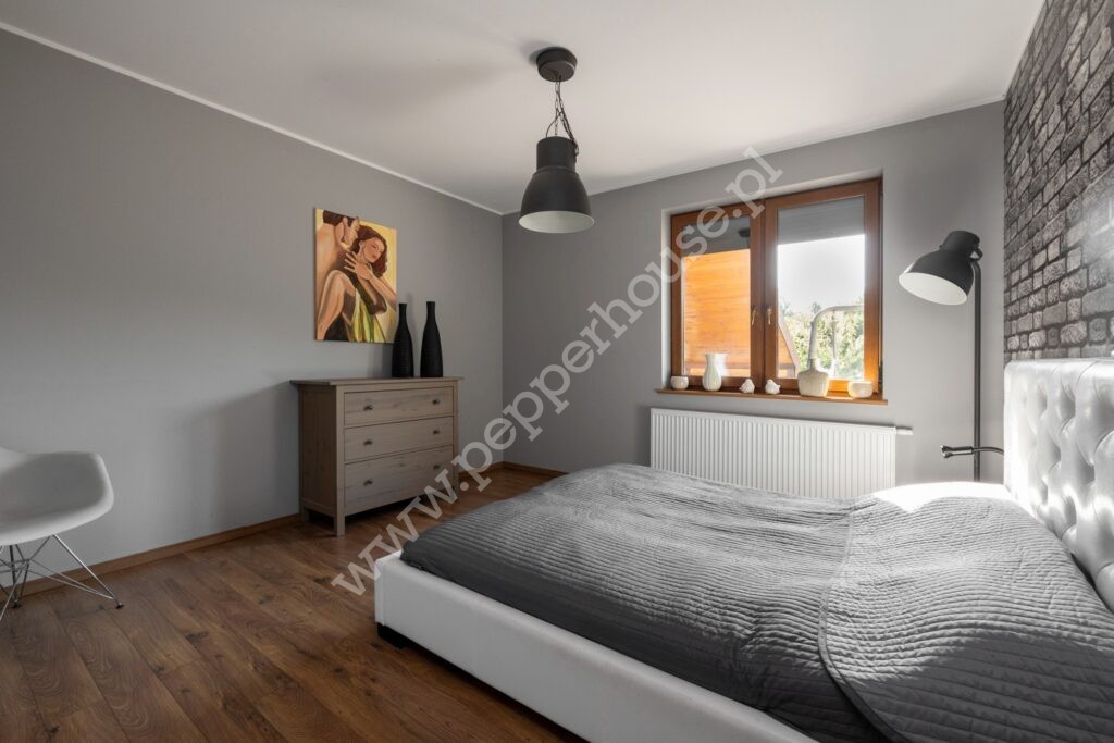 Na parterze znajduje się przestronny salon z wyjściem na urządzony ogród, nowoczesna kuchnia połączona z jadalnią. W salonie dodatkowo zainstalowany został w kominek, który otuli swoim ciepłem zarówno w zimniejsze, jak i romantyczne wieczory. Znajdują się również tutaj dwie sypialnie urządzone w jasnych, ciepłych barwach. Atutem jest dwustanowiskowy garaż, który znajduje się w bryle budynku.