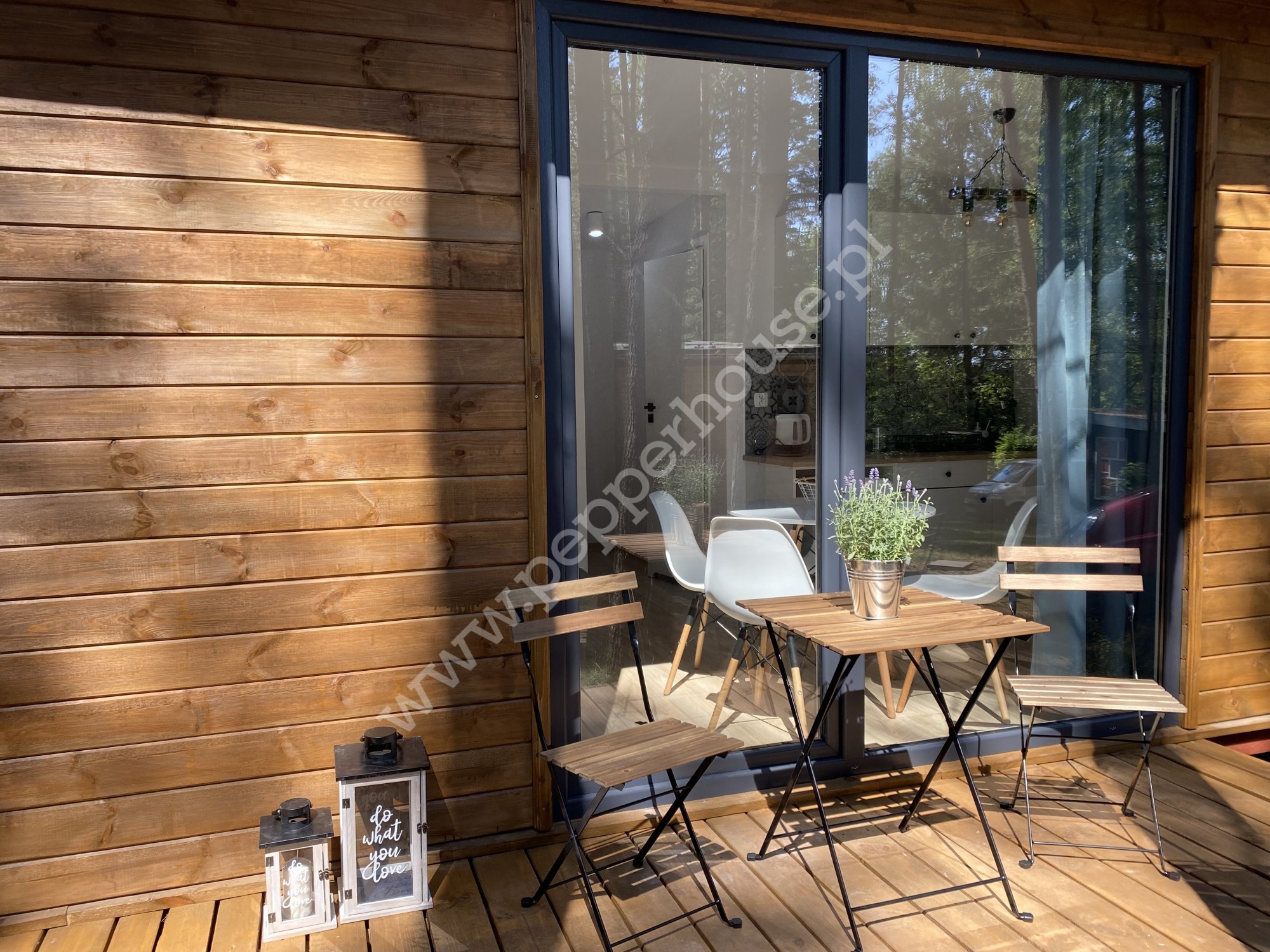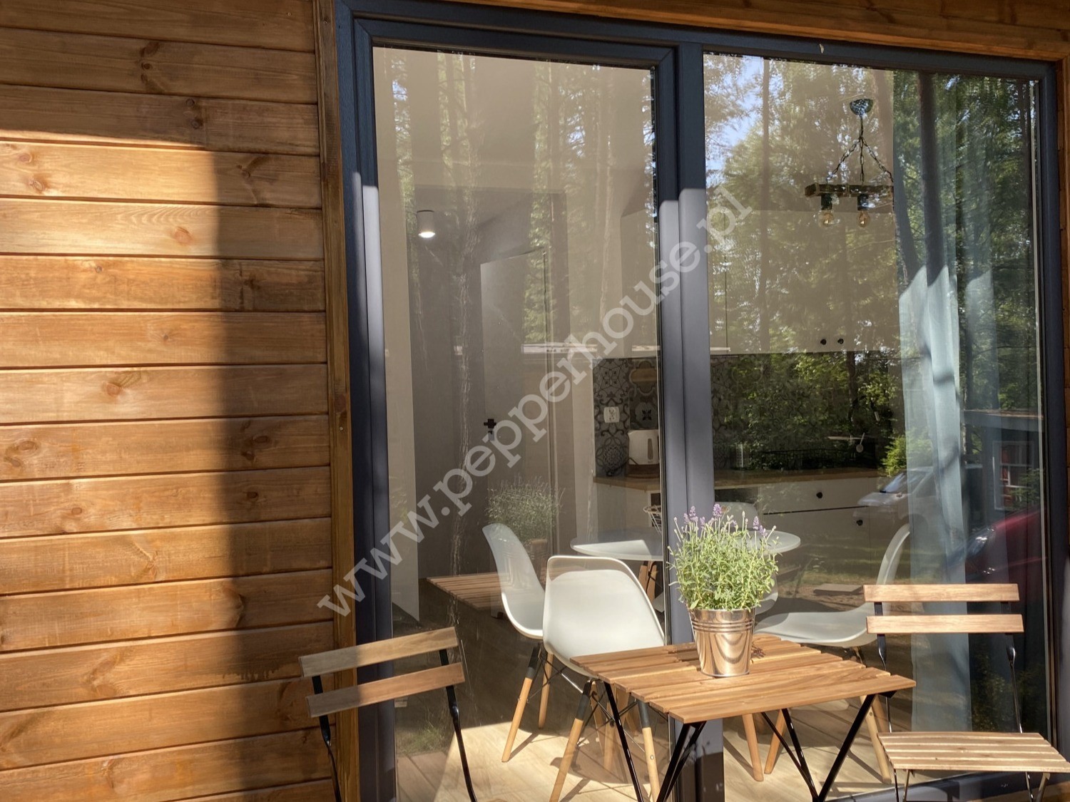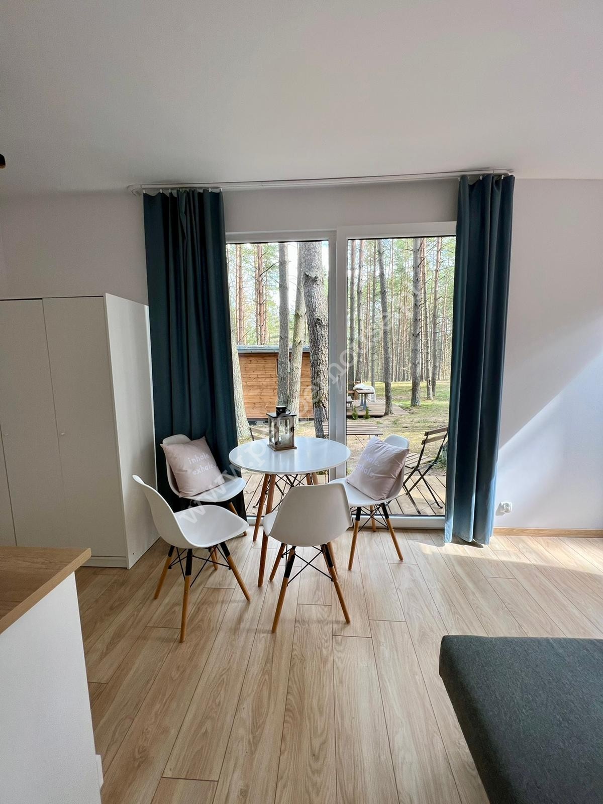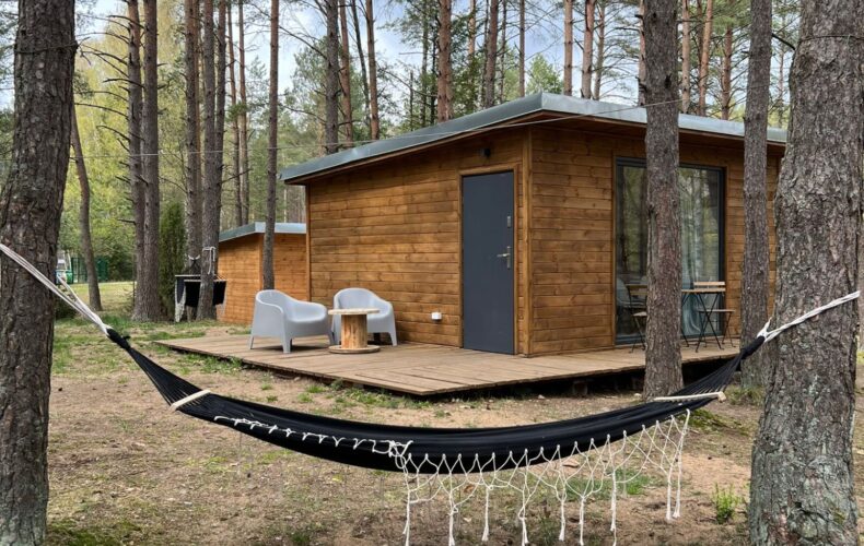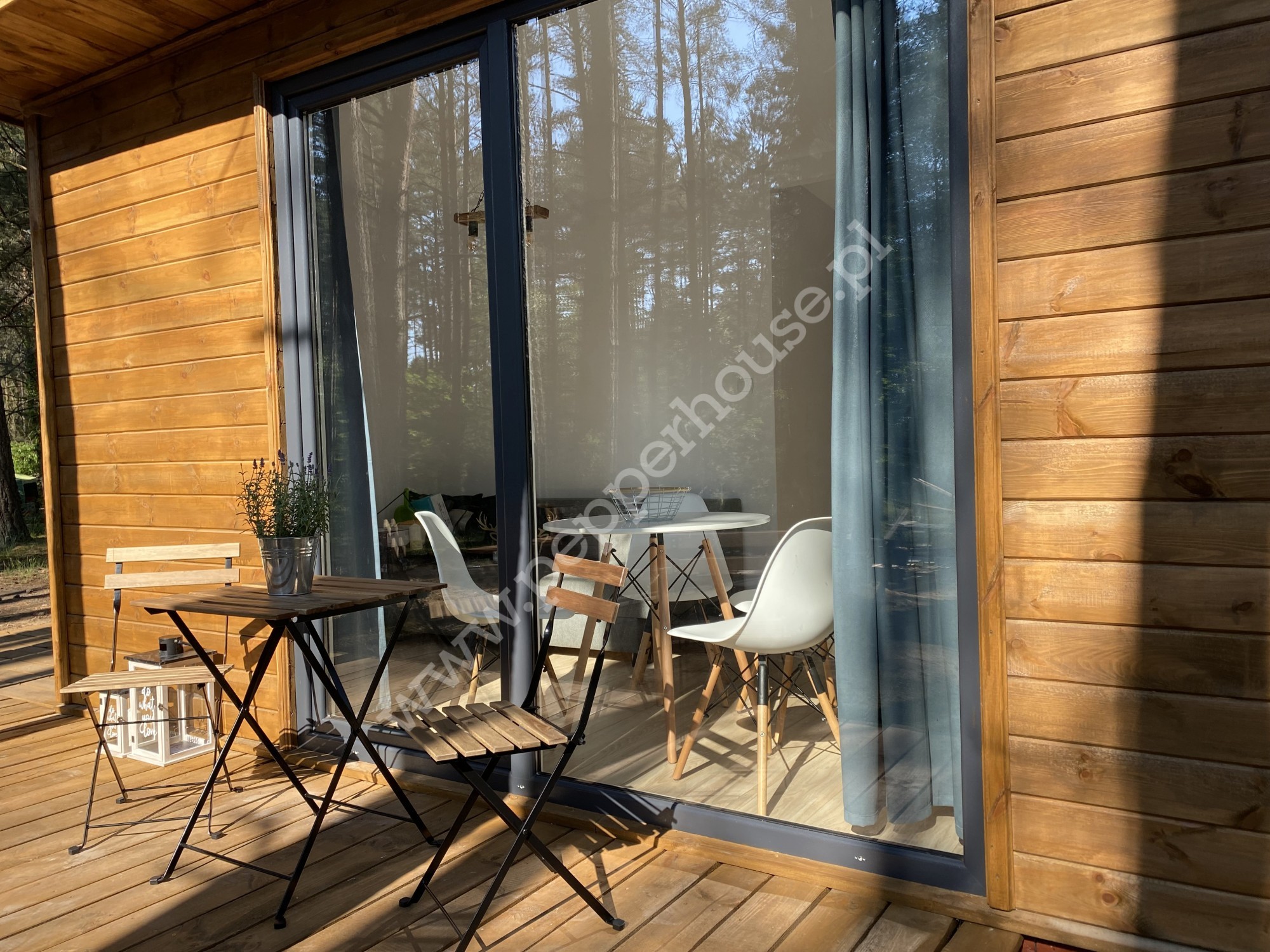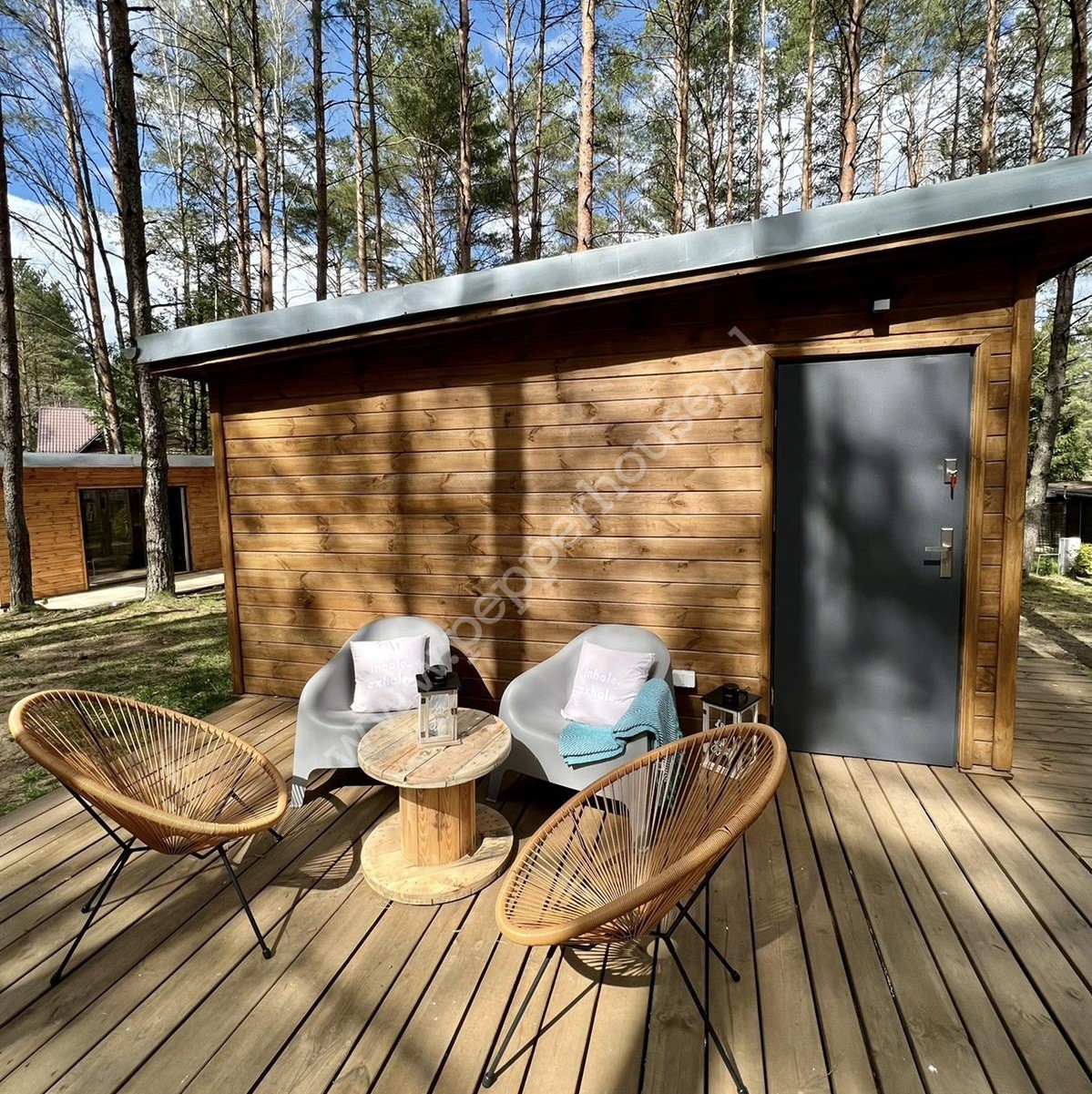 Drewniane domki rekreacyjne ocieplone wełną mineralną. W pomieszczeniach znajdują się panele podłogowe, w łazience wykładzina PCV. W domkach instalacja elektryczna, wodno-kanalizacyjna oraz grzejniki elektryczne. Każdy domek składa się z salonu z aneksem kuchennym, pokoju, łazienki, korytarza oraz drewnianego tarasu.