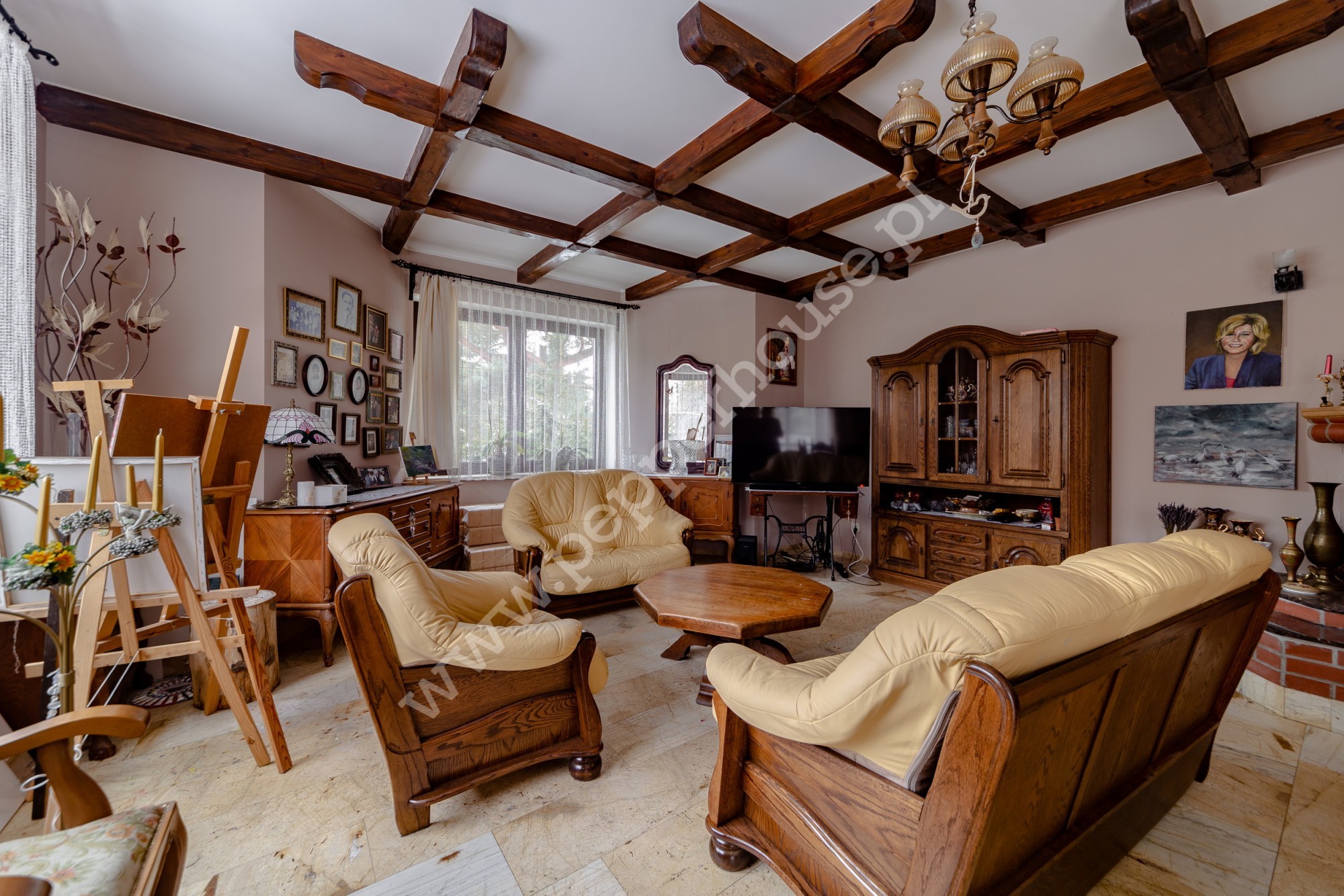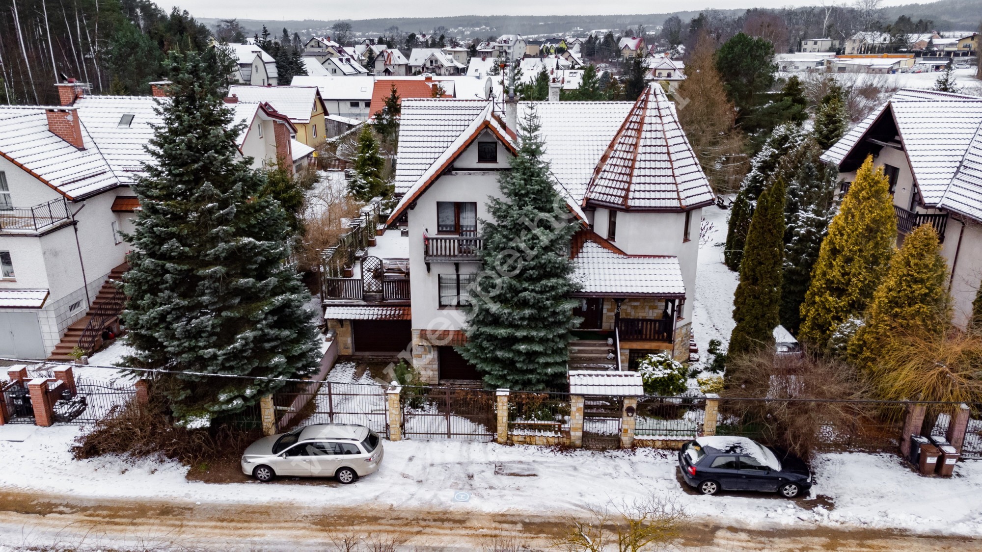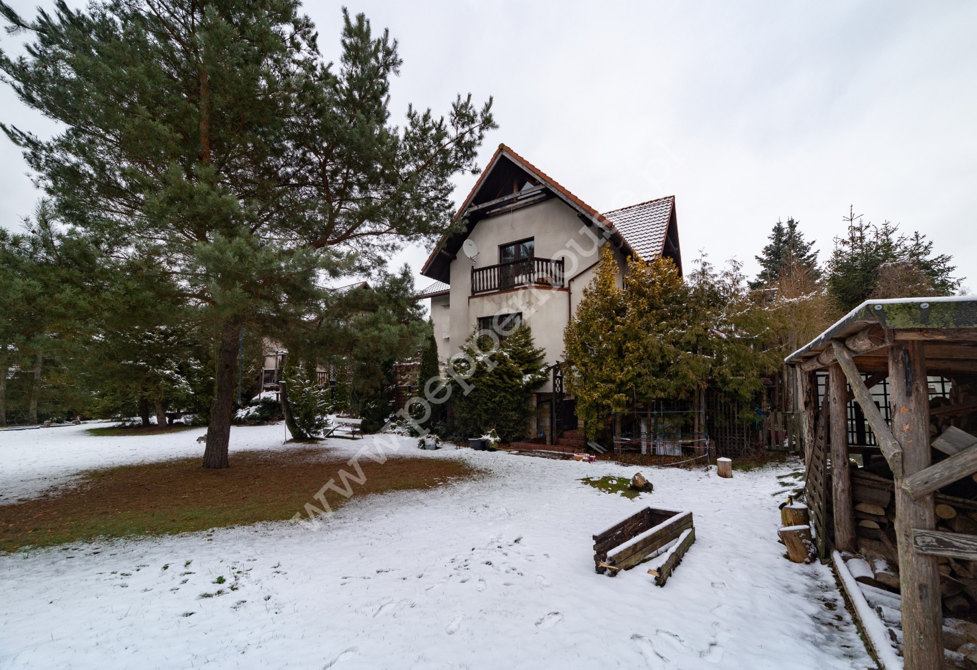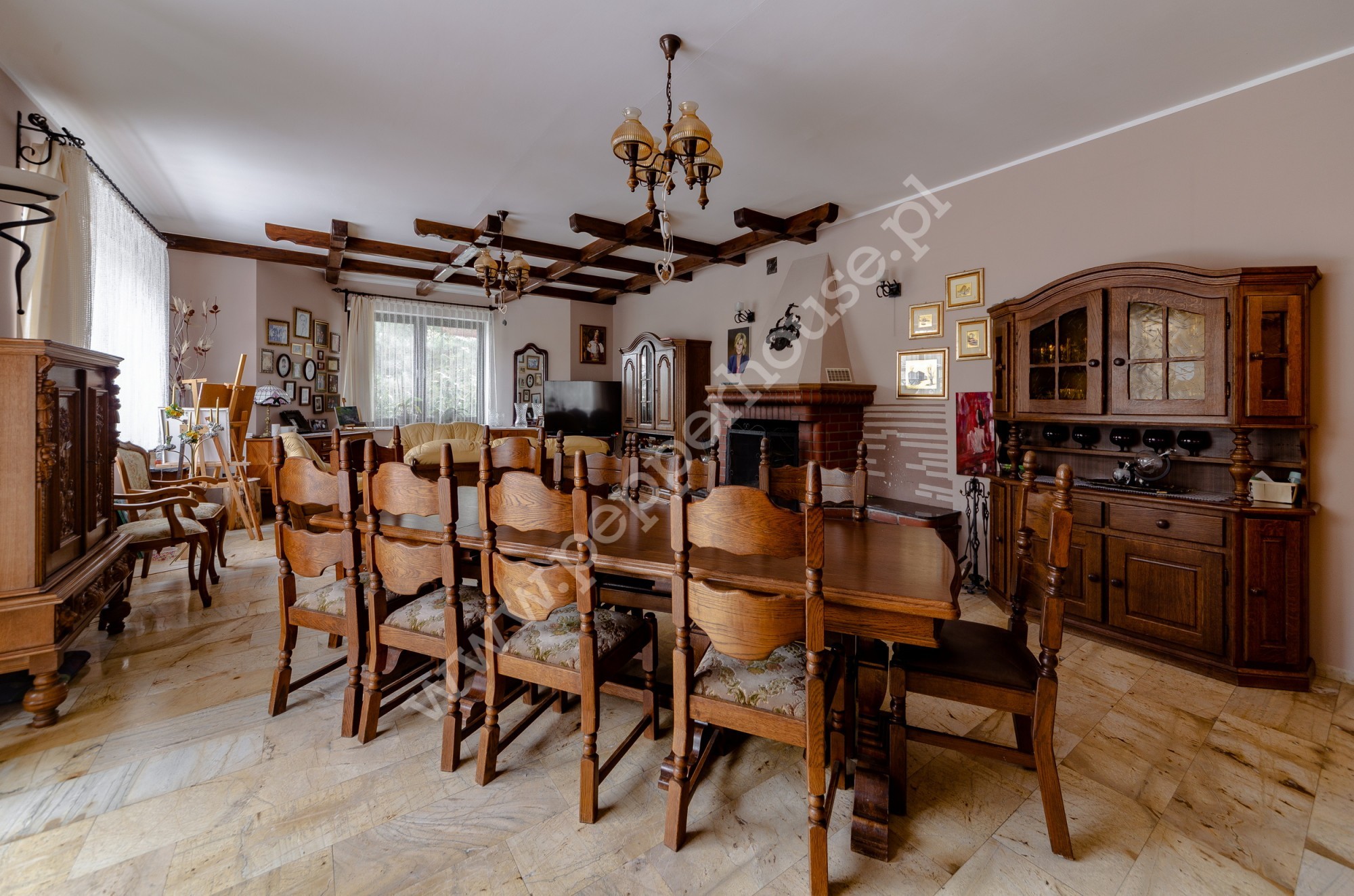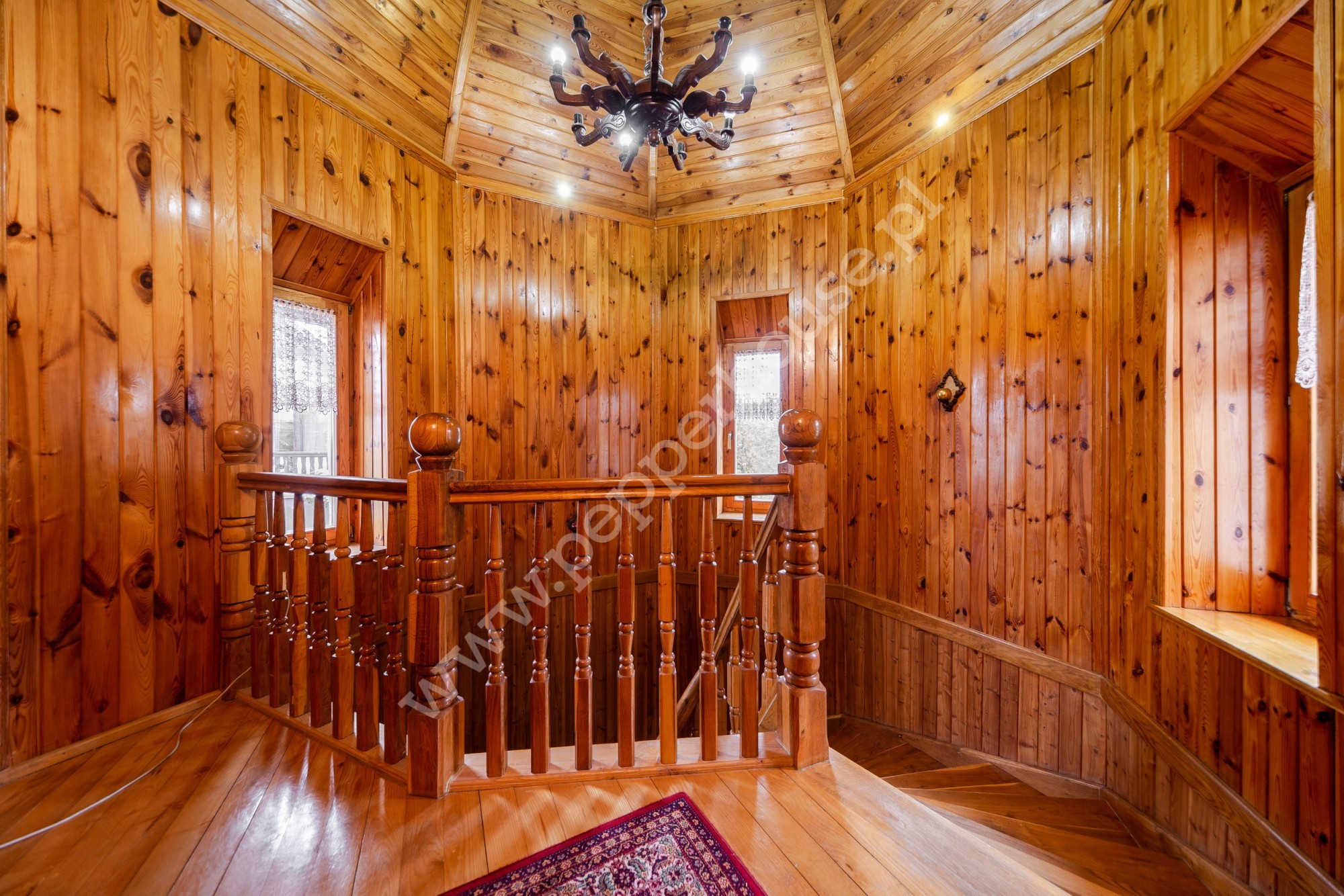 Budynek o powierzchni użytkowej 291,97 m2 (dodatkowo podpiwniczenie ok. 120 m2) jest usytuowany na działce o powierzchni 1217 m2. Niebywałym atutem domu z pięknie zagospodarowanym ogrodem jest bliskość lasu iglastego. Na parterze nieruchomości znajduje się przestronny hol, łazienka, przytulny salon urządzony w myśliwskim stylu, elegancki gabinet oraz ustawna kuchnia. Zarówno z kuchni jak i z pokoju dziennego mamy wyjścia na piękne 2 tarasy (w tym jeden o powierzchni aż 60 m2), z których schody zaprowadzą do ogrodu. Dodatkowo na całym parterze zamontowano ogrzewanie podłogowe, a podłogę wyłożono kamieniem, który latem chłodzi, a zimą świetnie oddaje ciepło.