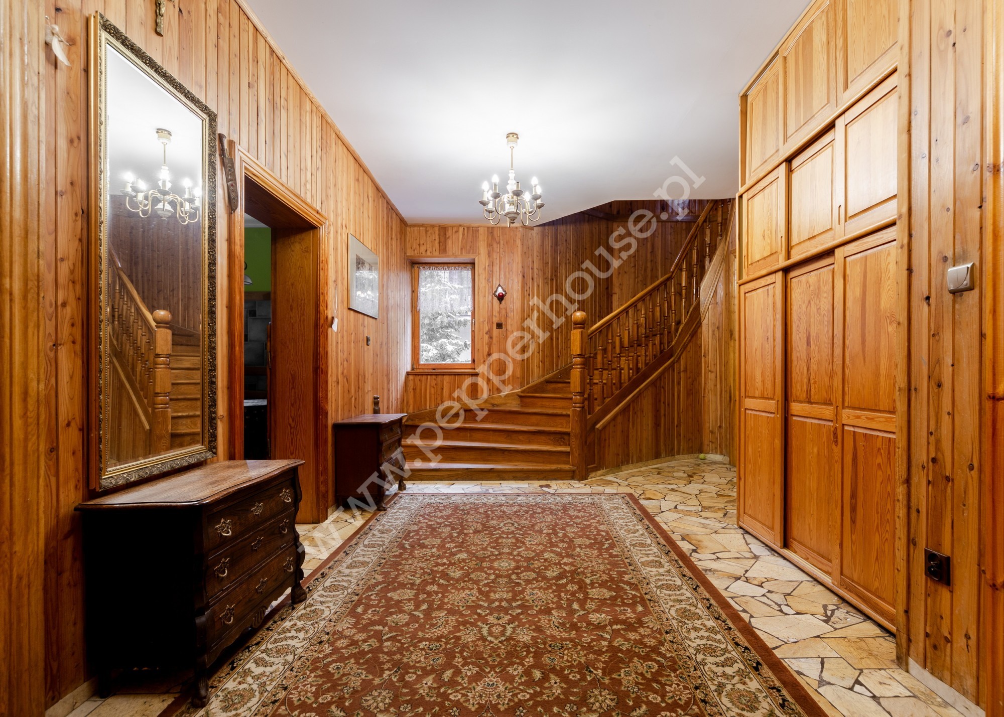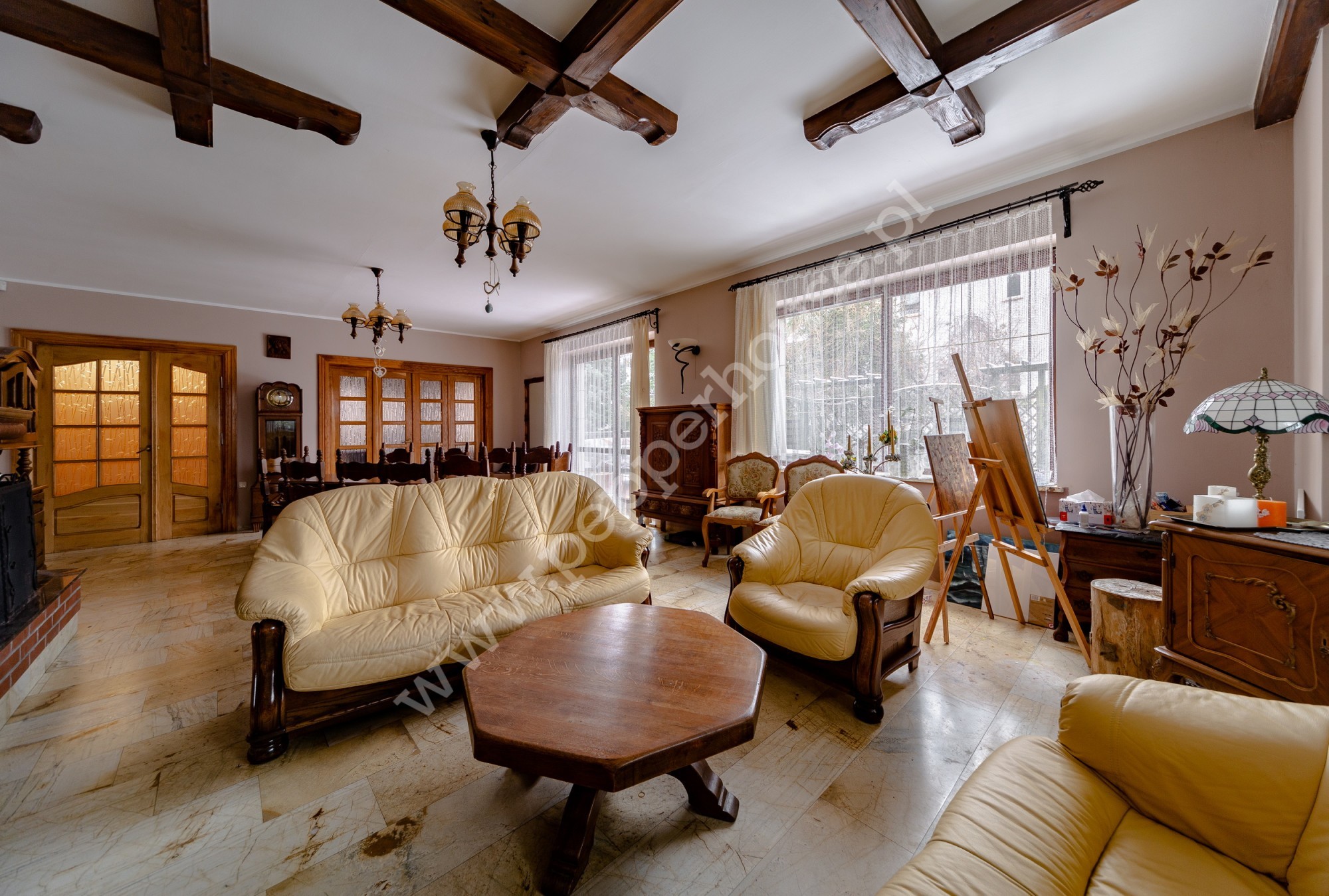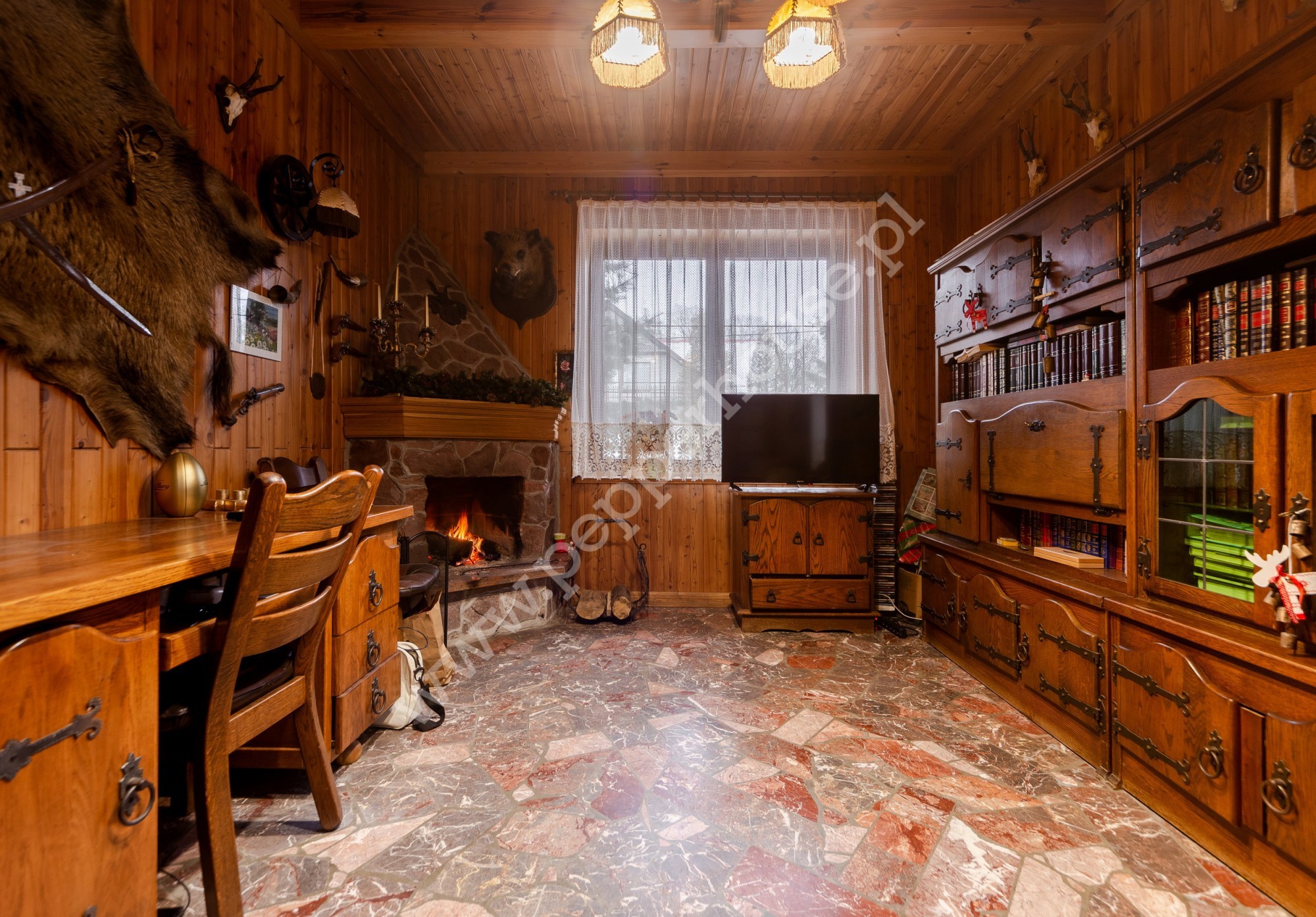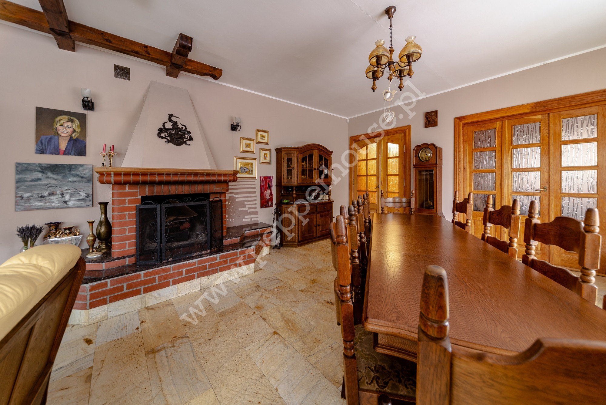 Budynek o powierzchni użytkowej 291,97 m2 (dodatkowo podpiwniczenie ok. 120 m2) jest usytuowany na działce o powierzchni 1217 m2. Niebywałym atutem domu z pięknie zagospodarowanym ogrodem jest bliskość lasu iglastego. Na parterze nieruchomości znajduje się przestronny hol, łazienka, przytulny salon urządzony w myśliwskim stylu, elegancki gabinet oraz ustawna kuchnia. Zarówno z kuchni jak i z pokoju dziennego mamy wyjścia na piękne 2 tarasy (w tym jeden o powierzchni aż 60 m2), z których schody zaprowadzą do ogrodu. Dodatkowo na całym parterze zamontowano ogrzewanie podłogowe, a podłogę wyłożono kamieniem, który latem chłodzi, a zimą świetnie oddaje ciepło.