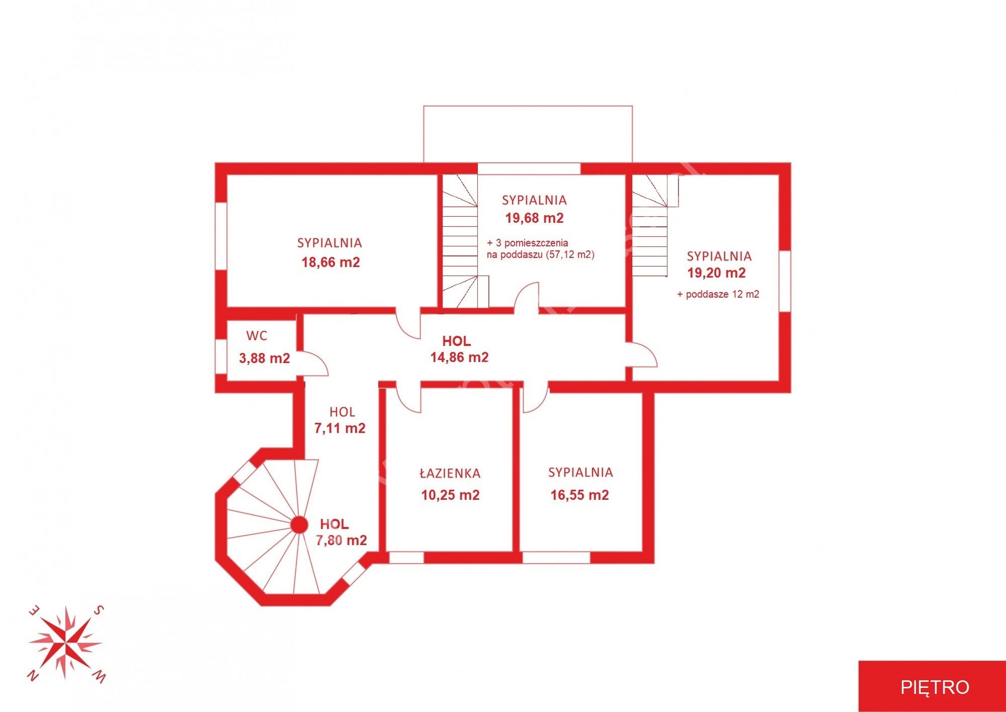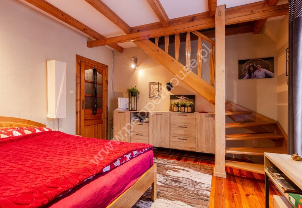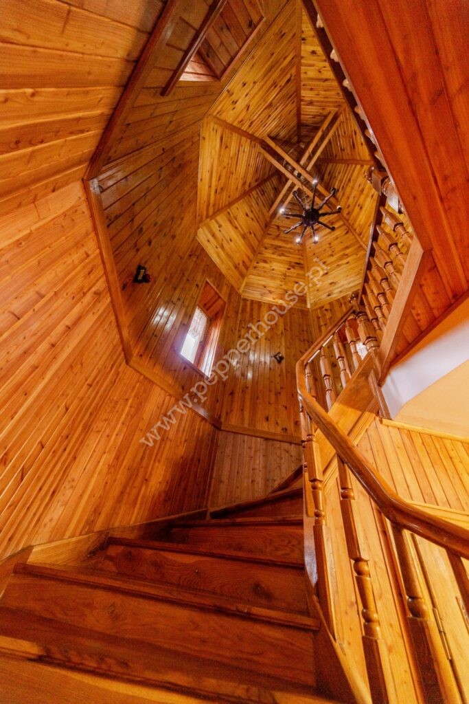 Na górę domu zabiorą nas piękne dębowe schody z modrzewiową barierką. Jak wiadomo schody dębowe mają bardzo wysoką odporność na ścieranie, zarysowanie i inne uszkodzenia mechaniczne. Ponadto mają one bardzo ciekawy i niebanalny design, który doskonale sprawdza się zarówno w tradycyjnej, jak i w nowoczesnej aranżacji wnętrz. Na piętrze domu znajdują się cztery sypianie (w tym dwie z antresolami, które tworzą dodatkową przestrzeń), łazienka oraz wc.
