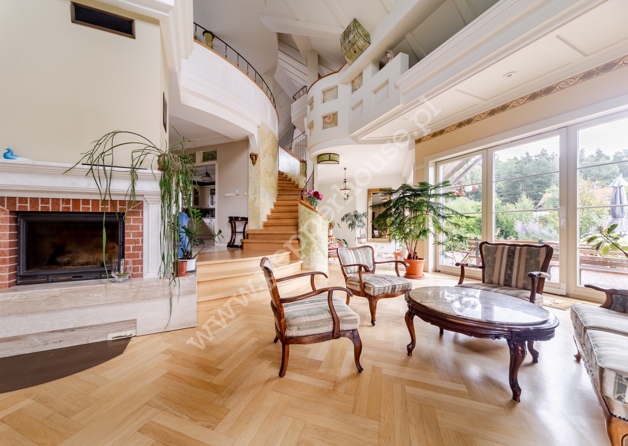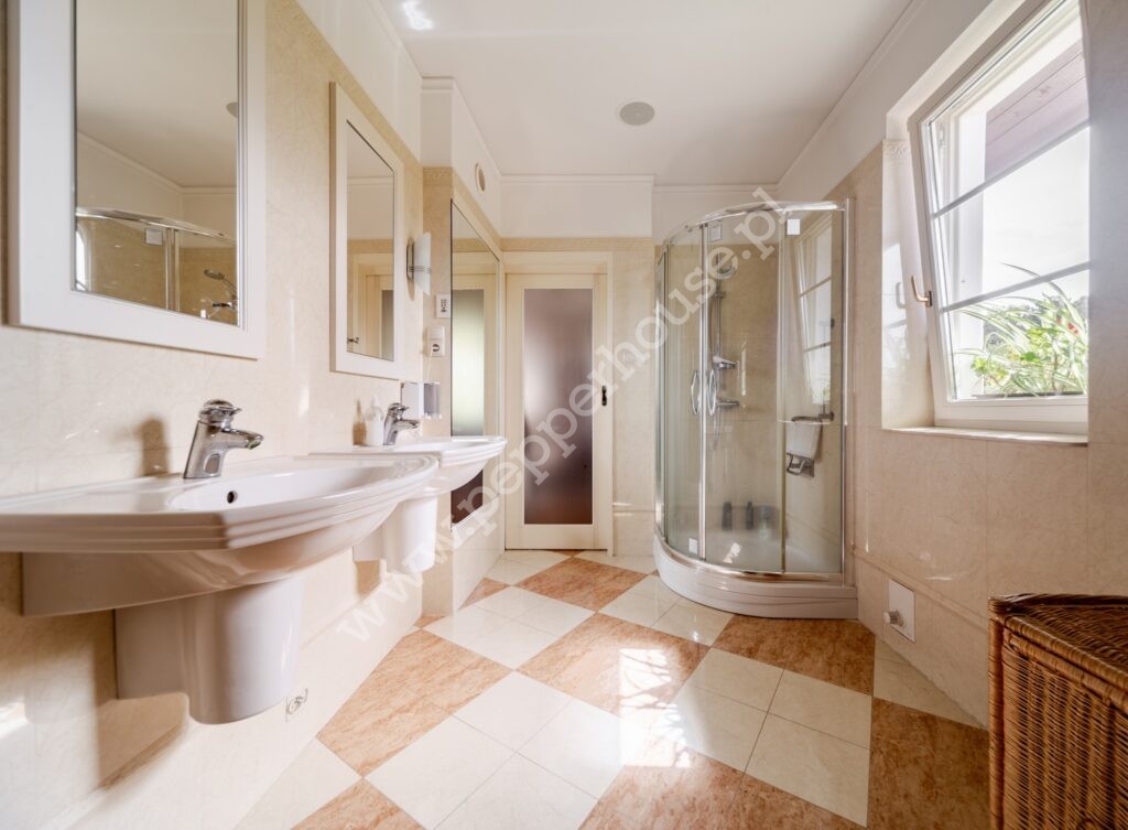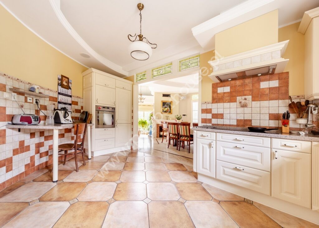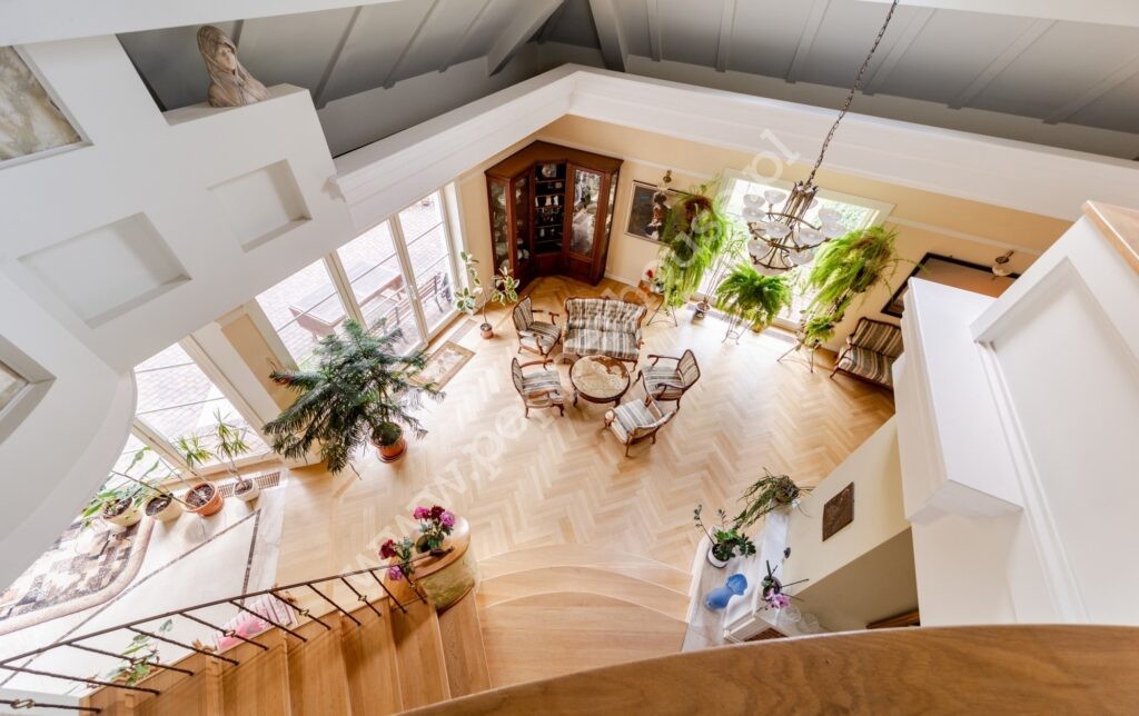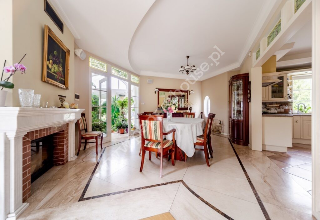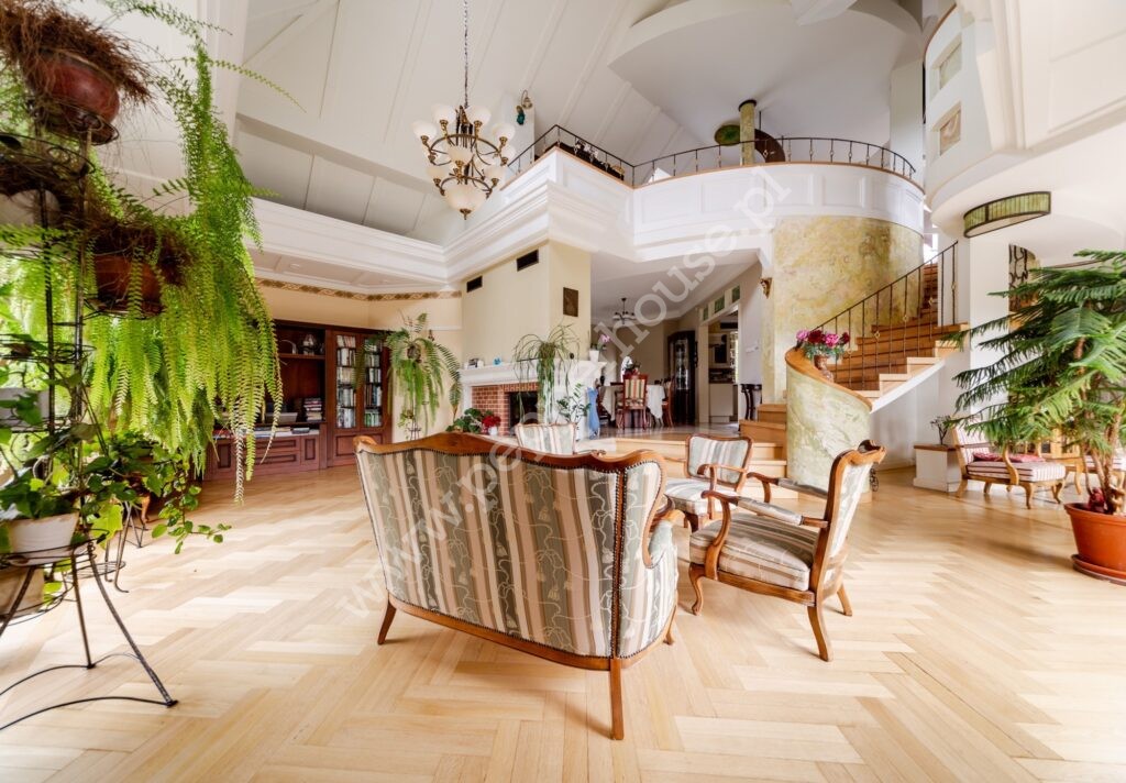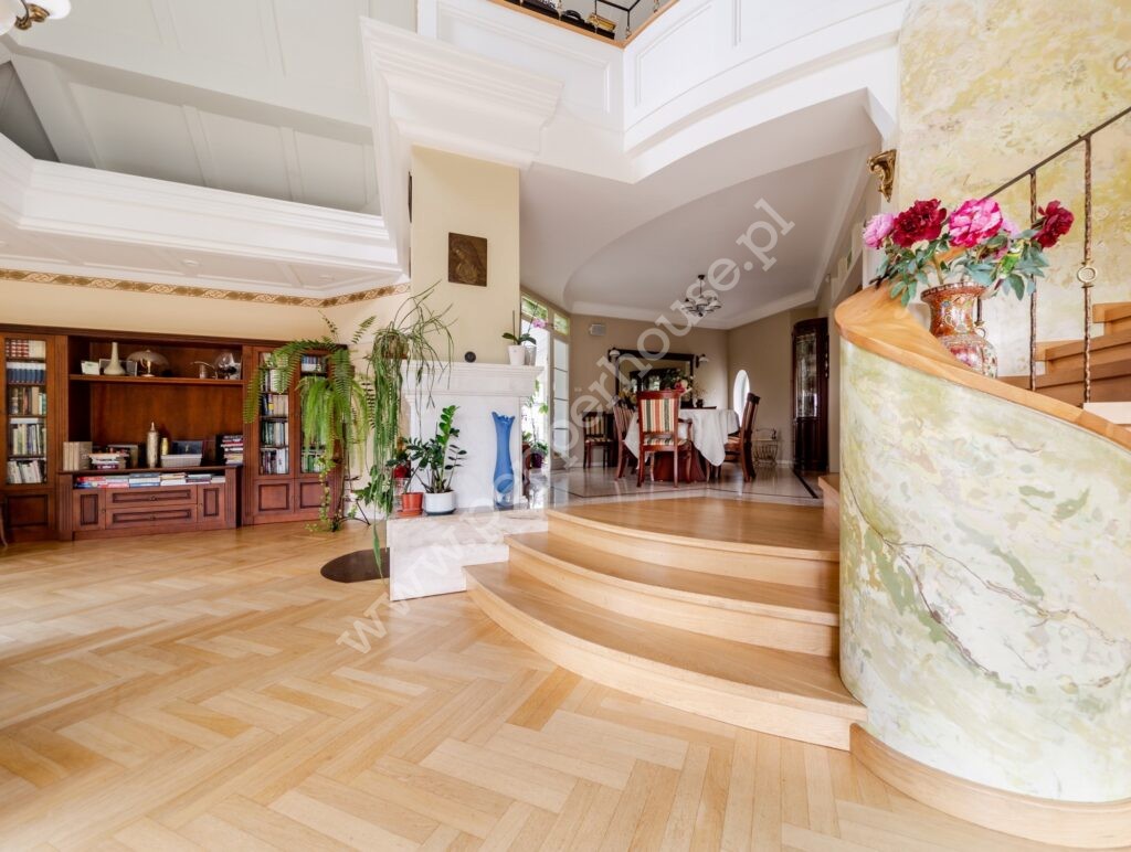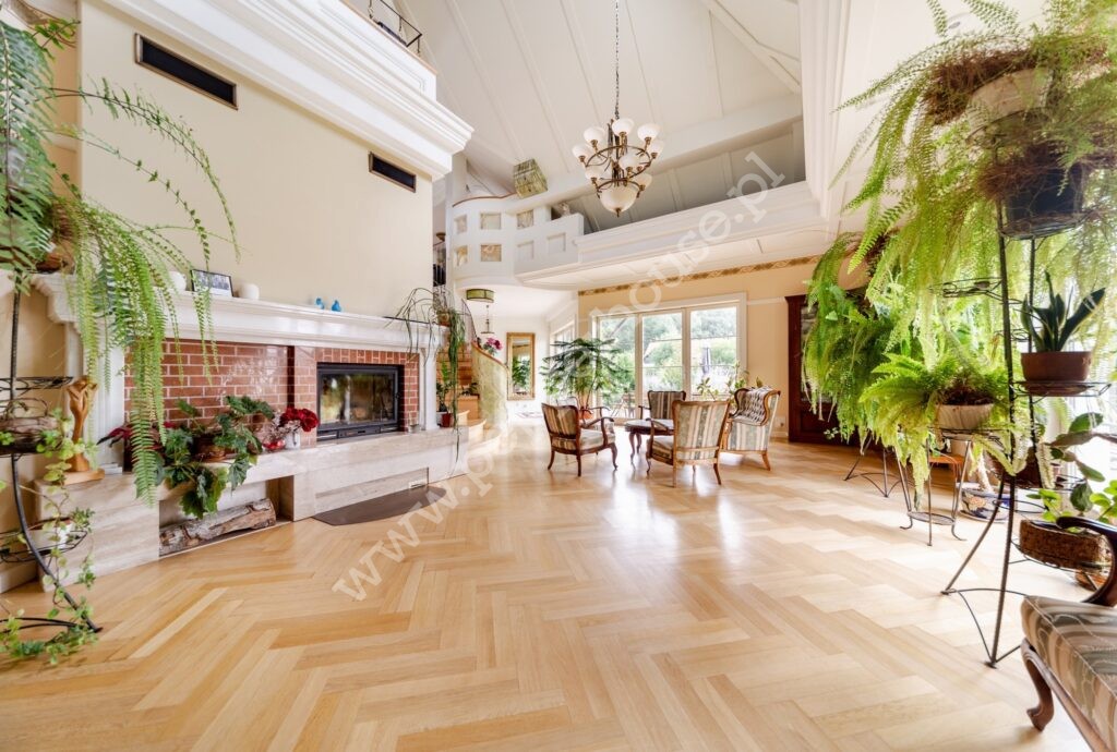 Standard wykończenia: podłogi: w salonie deski dębowe, w jadalni i części salonu wraz ze schodami, części ogrodu zimowego – marmur, w łazienkach, kuchniach, wiatrołapie- terakota, parkiet orientalny w gabinecie i sypialni, w pozostałych pomieszczeniach deska barlinecka.