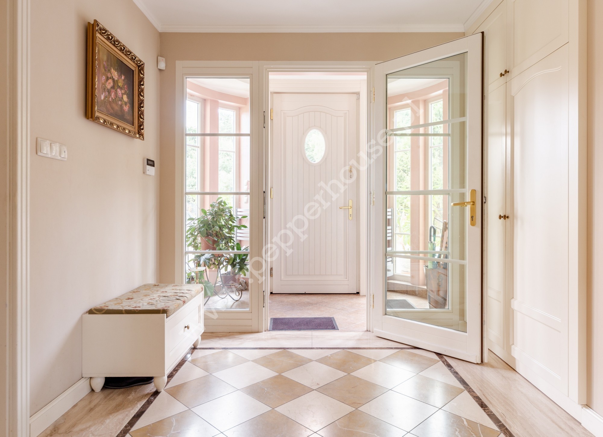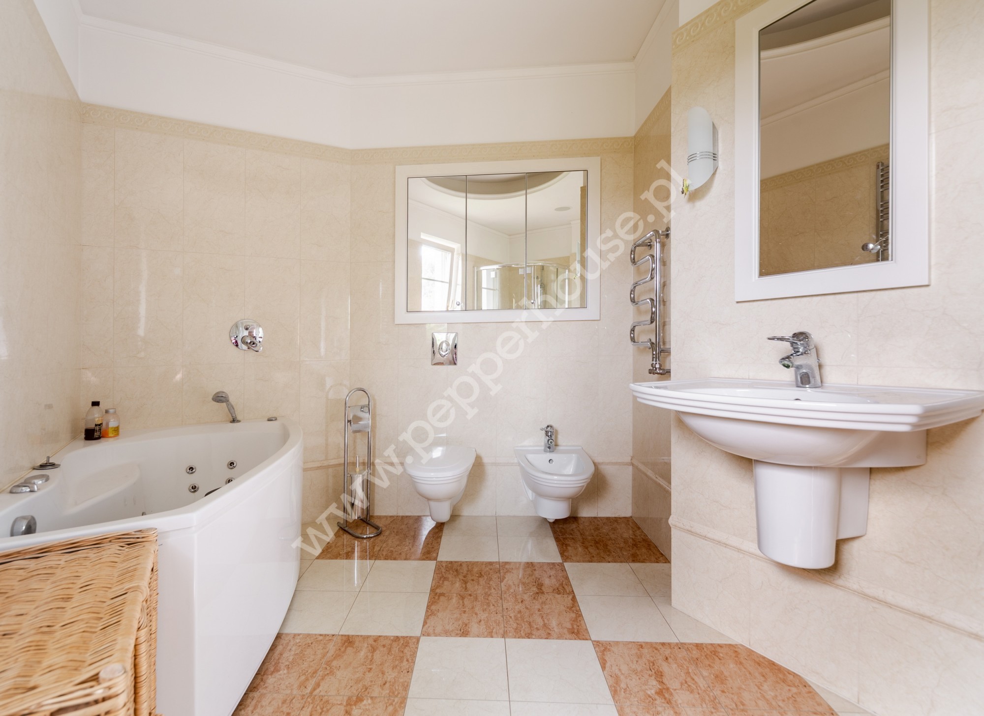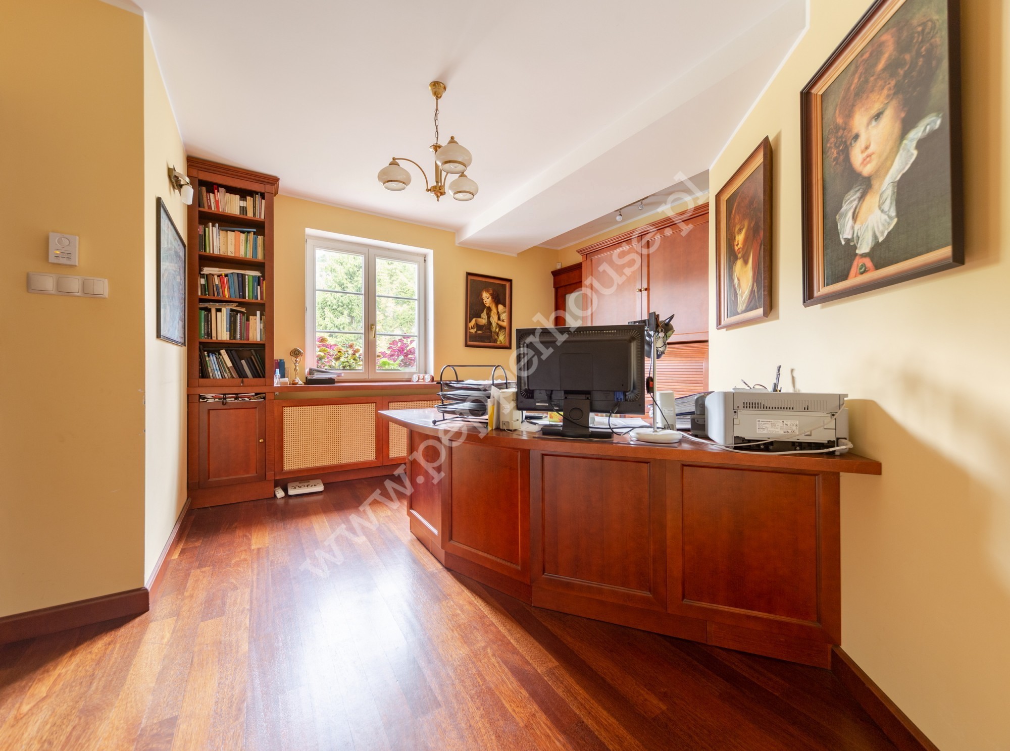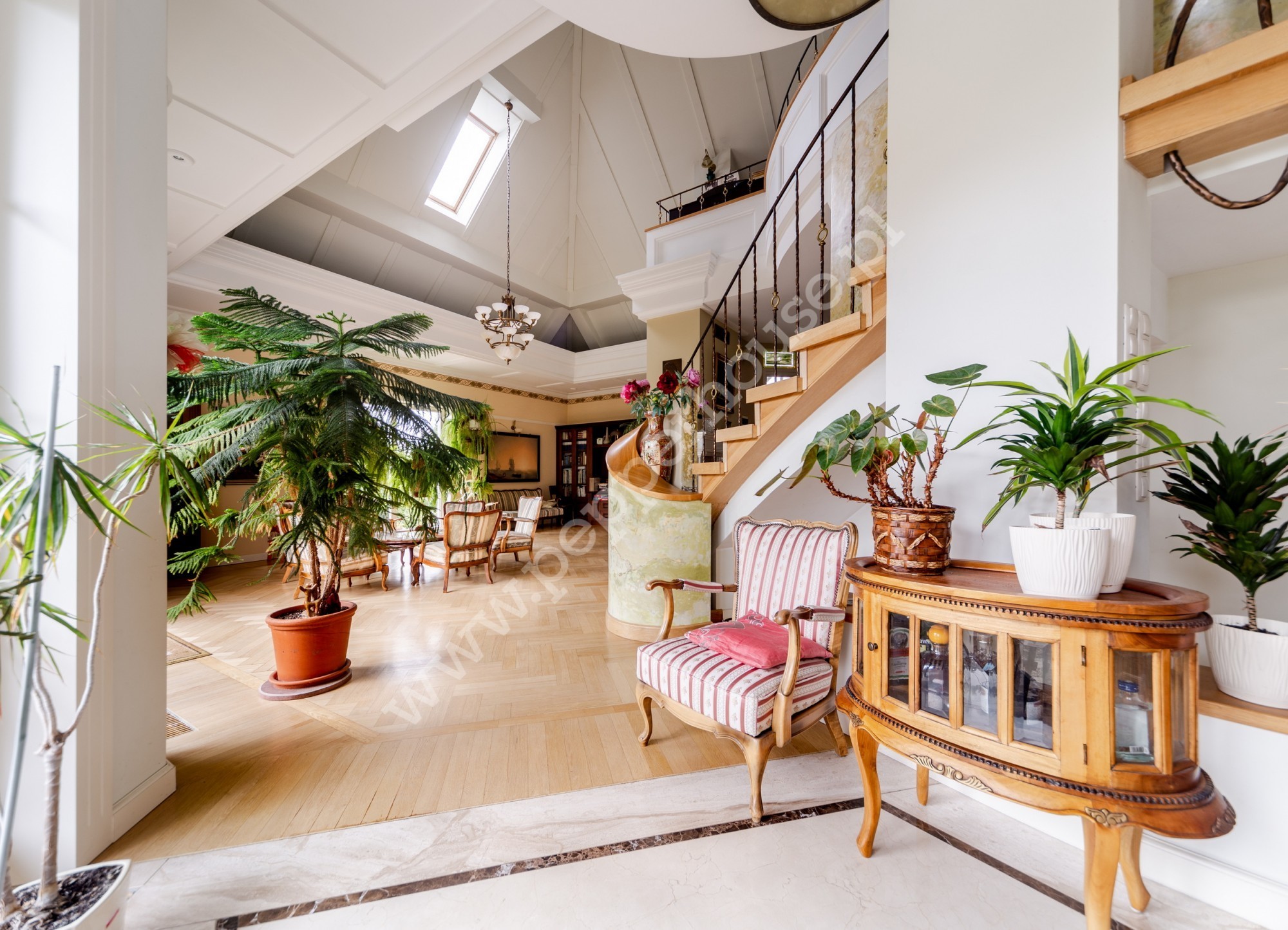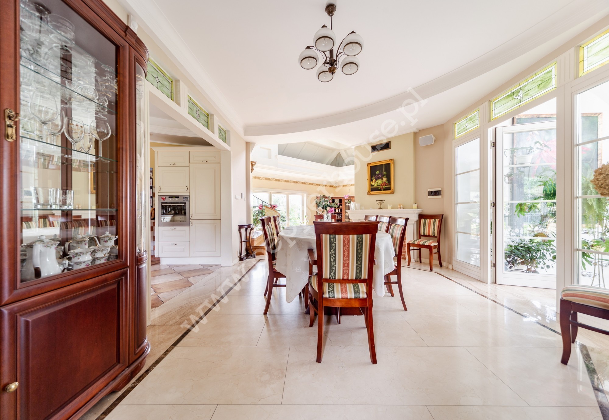 Standard wykończenia: podłogi: w salonie deski dębowe, w jadalni i części salonu wraz ze schodami, części ogrodu zimowego – marmur, w łazienkach, kuchniach, wiatrołapie- terakota, parkiet orientalny w gabinecie i sypialni, w pozostałych pomieszczeniach deska barlinecka.