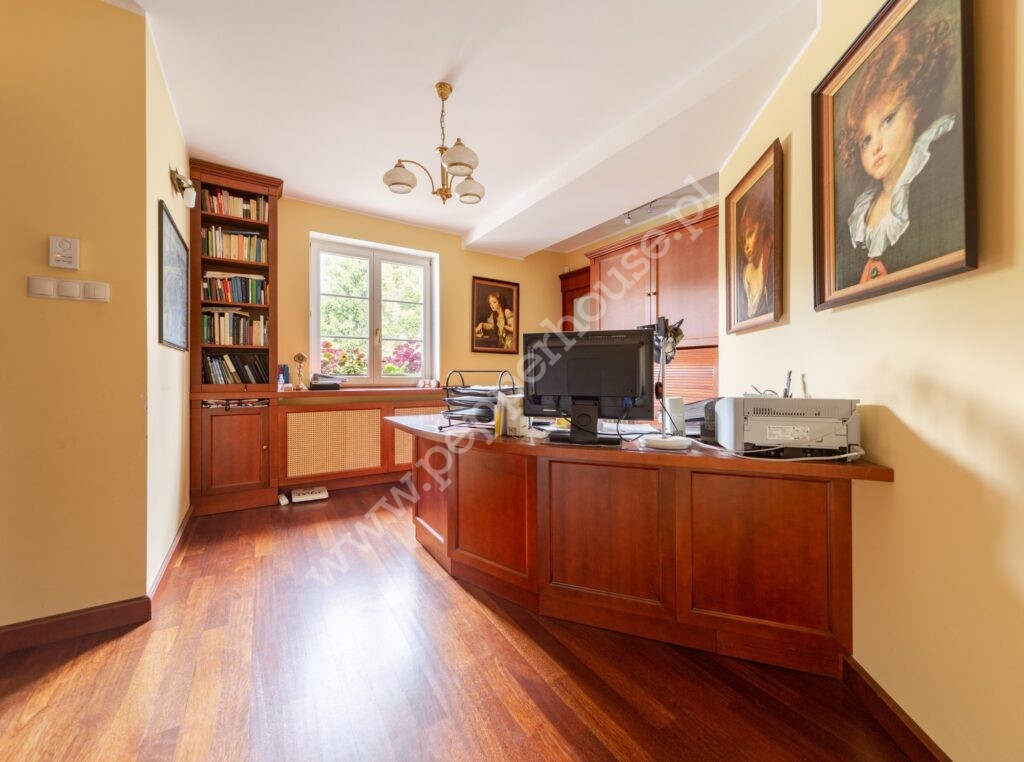 Na parterze mamy przestronny salon z dwustronnym kominkiem, jadalnię, kuchnię wraz ze spiżarnią (gdzie umiejscowiona jest centralka), ogród zimowy, przedpokój z wiatrołapem, łazienka, sypialnia z łazienką, garaż na 2 samochody jak i 2 pokojowy gabinet przygotowany jako miejsce pracy biurowej, usytuowany nieopodal wejścia do domu, dzięki czemu nie zakłóca komunikacji w domu.
