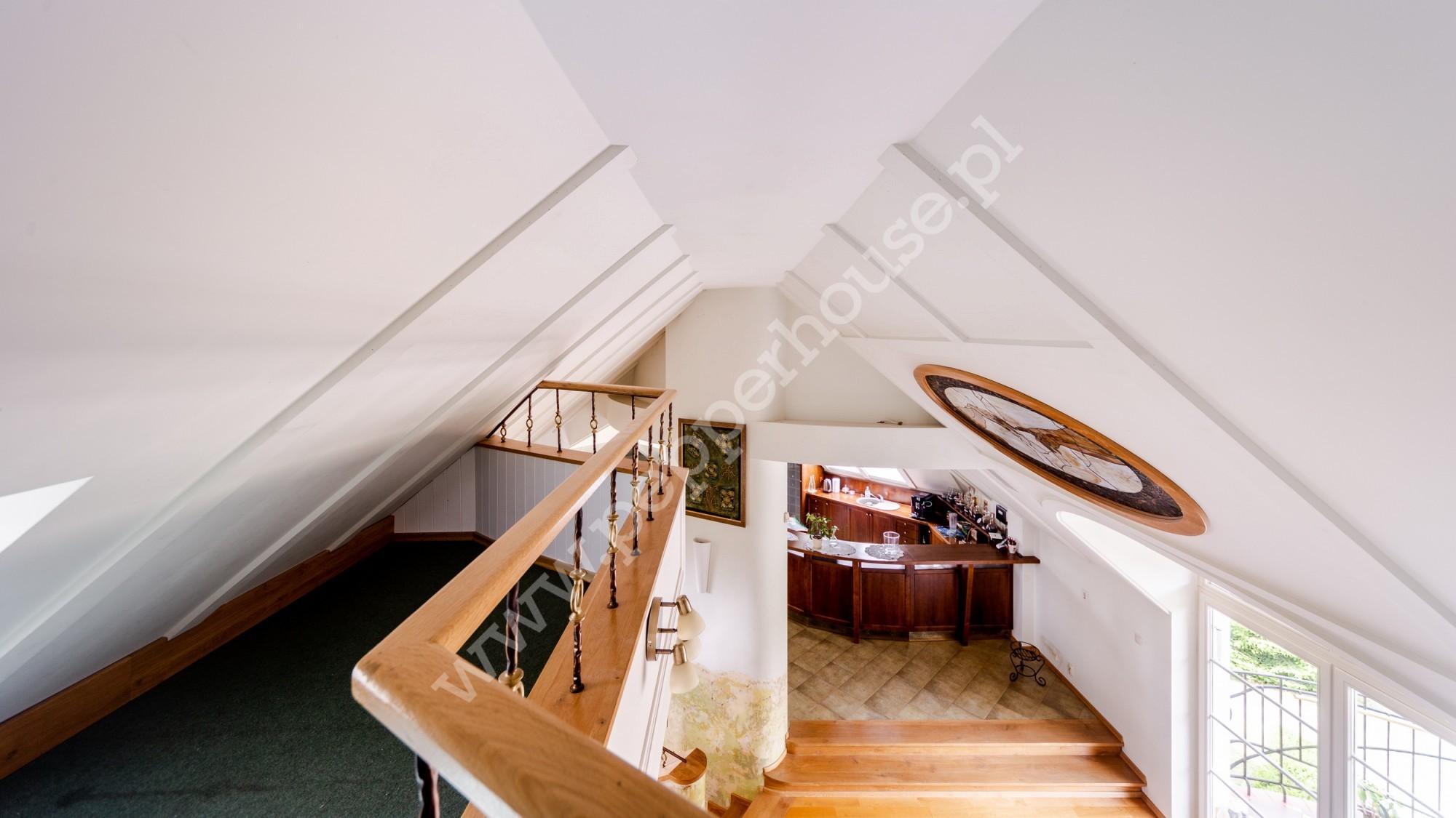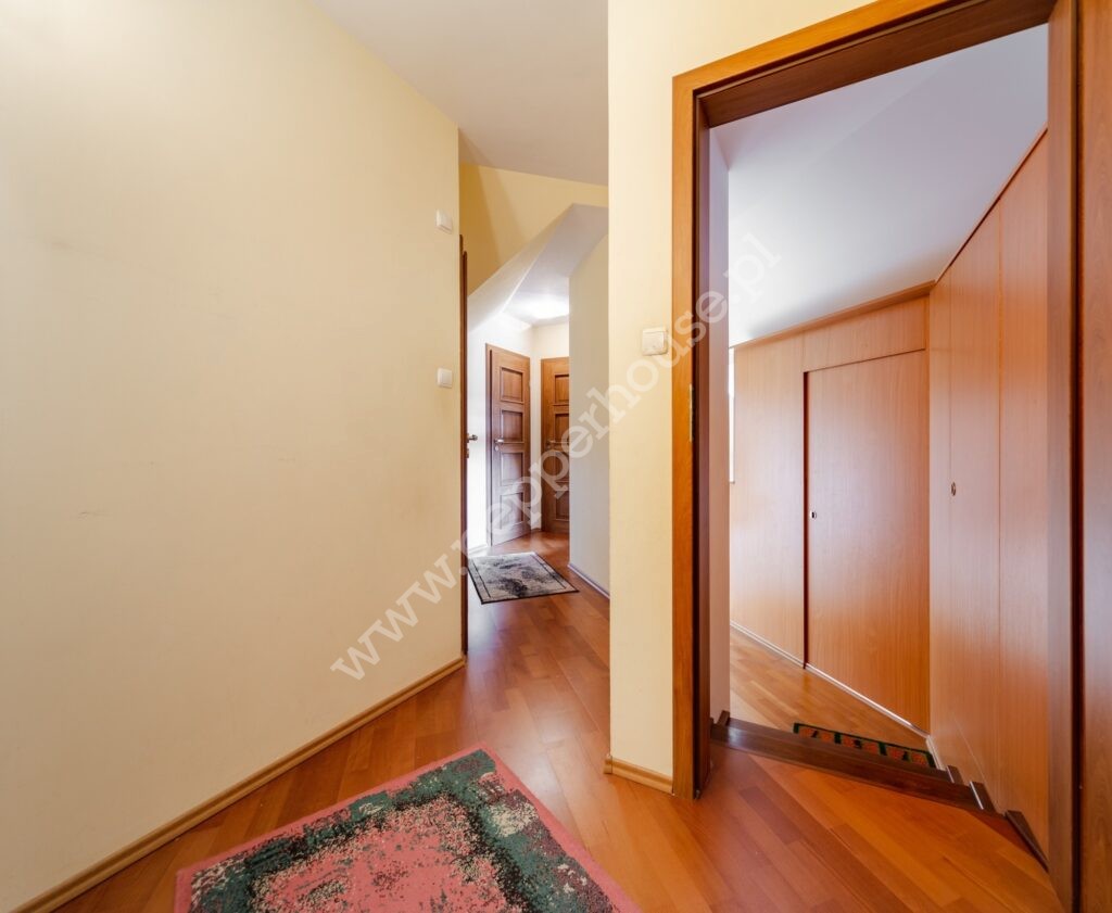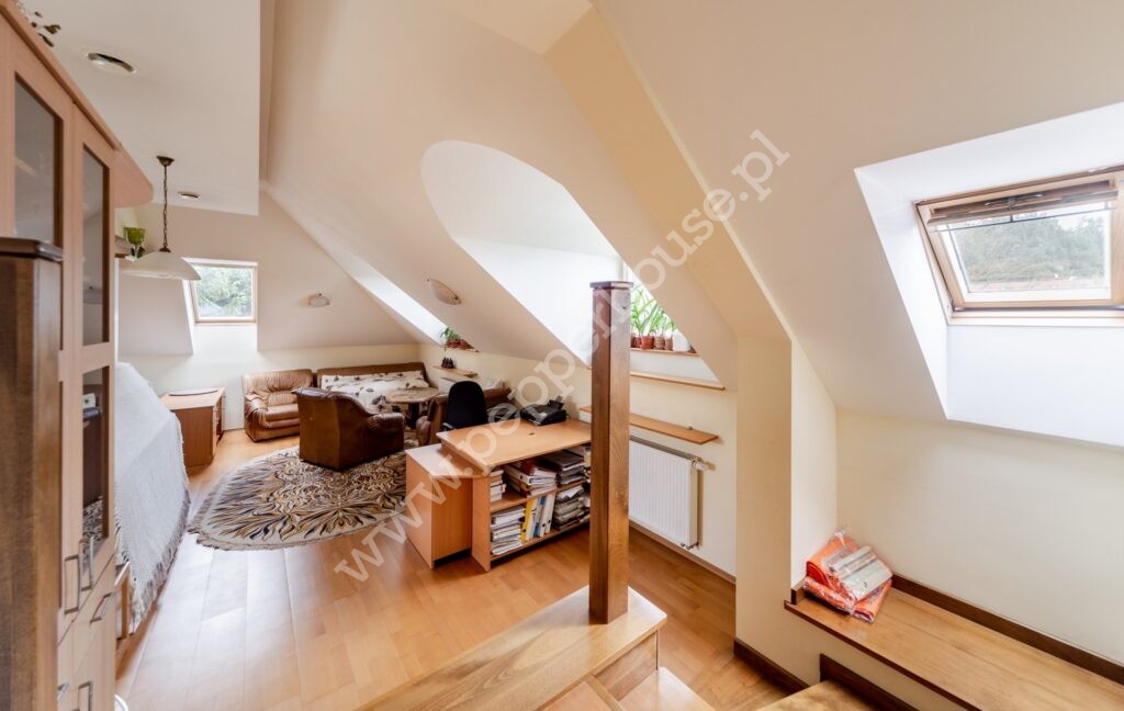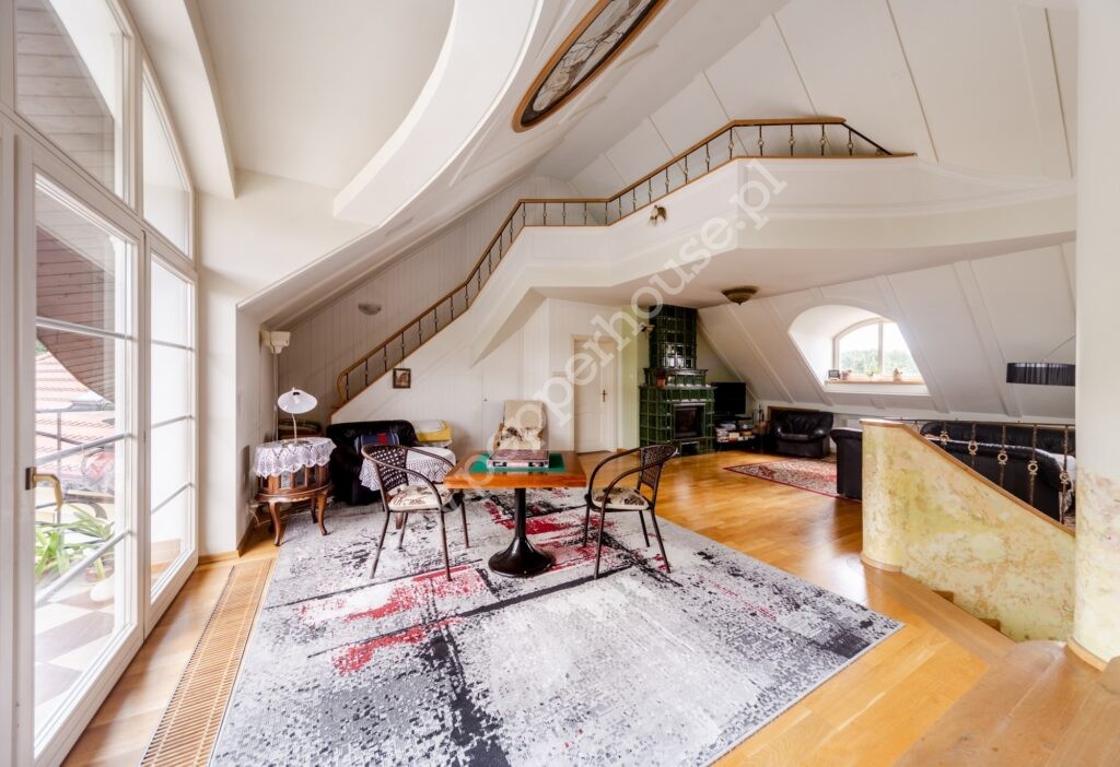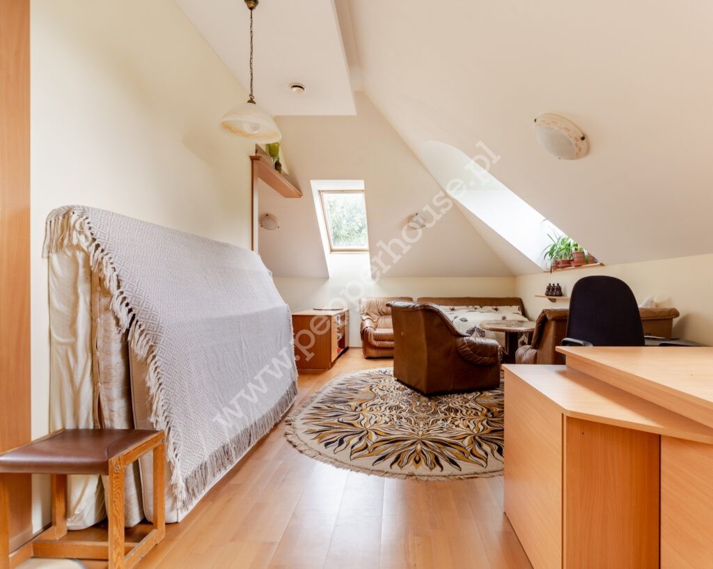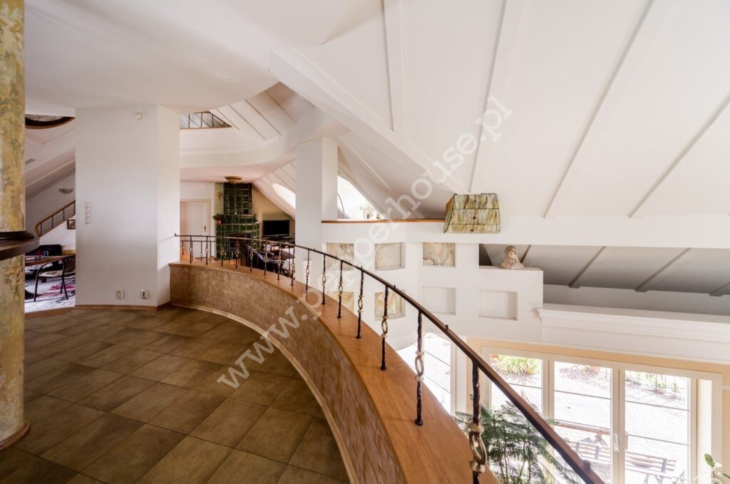 Na piętrze znajduje się rozległe pomieszczenie otwarte wraz z aneksem zabudowanym barem, antresola z aneksem kominkowo-rekreacyjnym, garderoba, pokój gościnny, łazienka. Na tym samym piętrze mamy apartament o samodzielnej funkcji mieszkalnej (dwa pokoje, kuchnia, łazienka) oraz pomieszczenie gospodarcze.