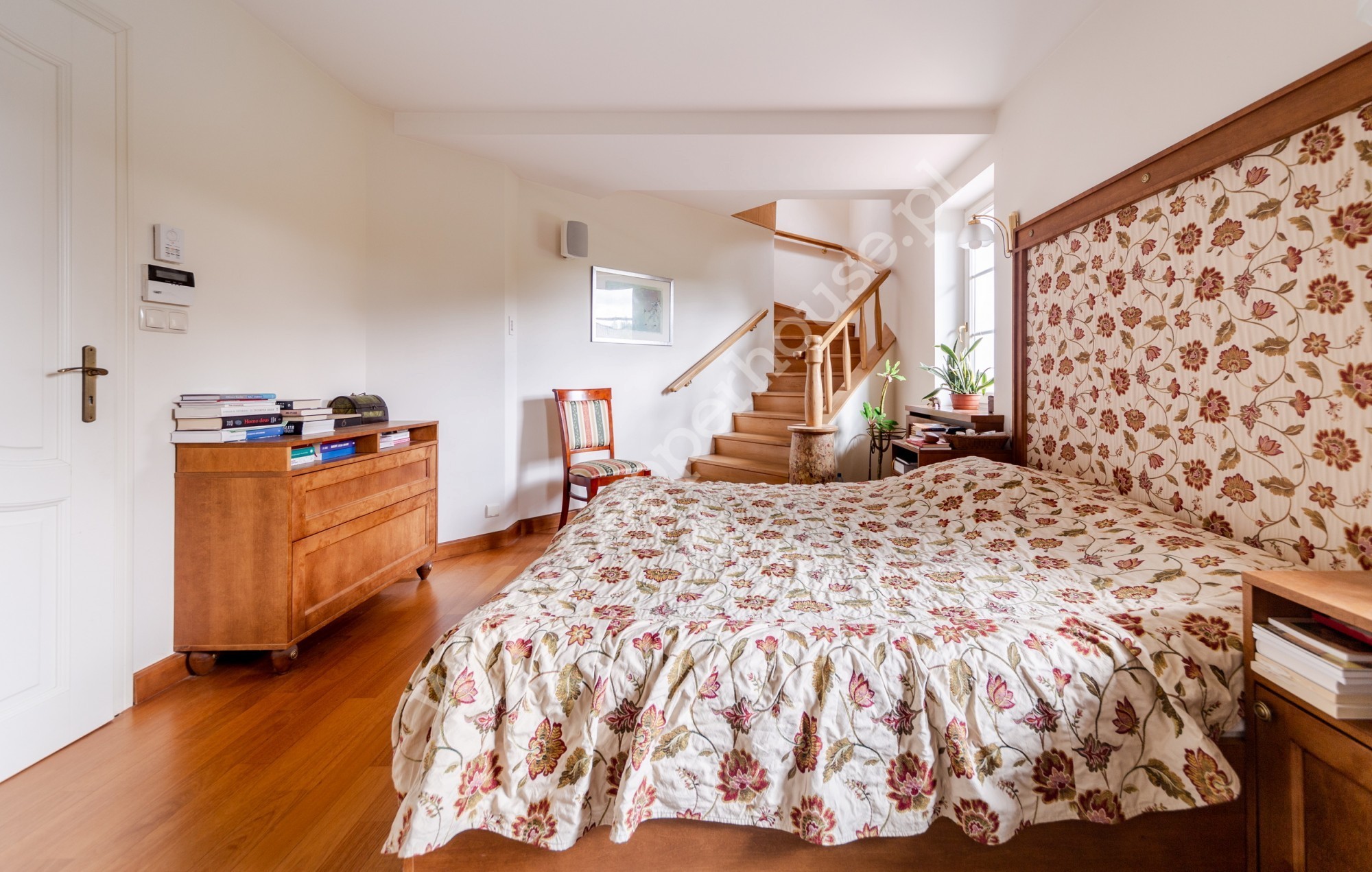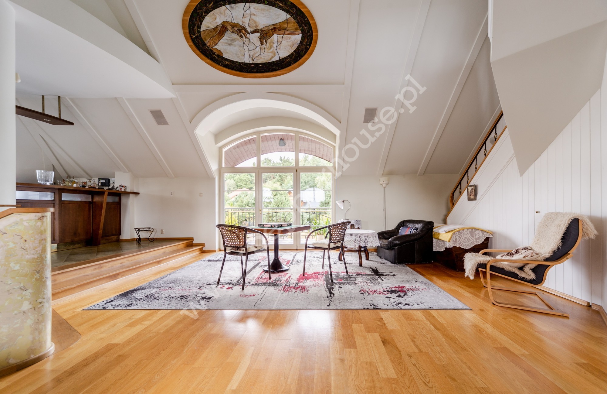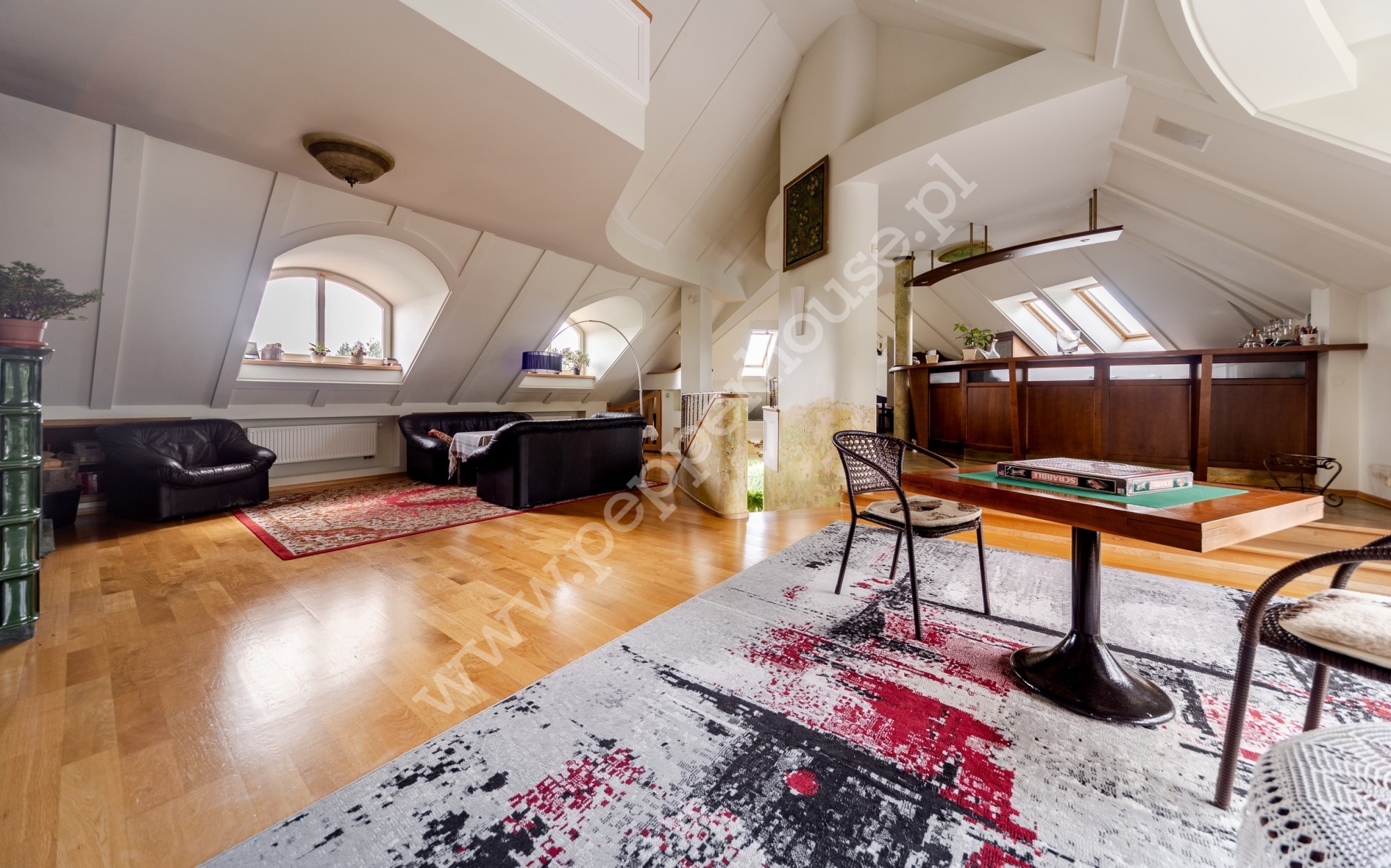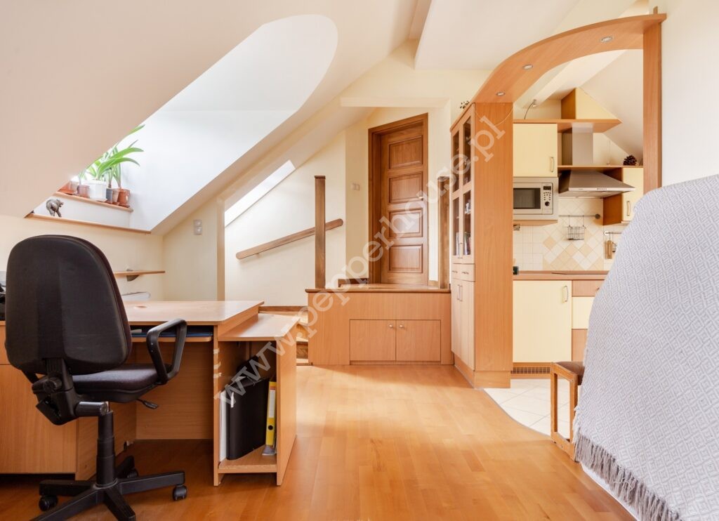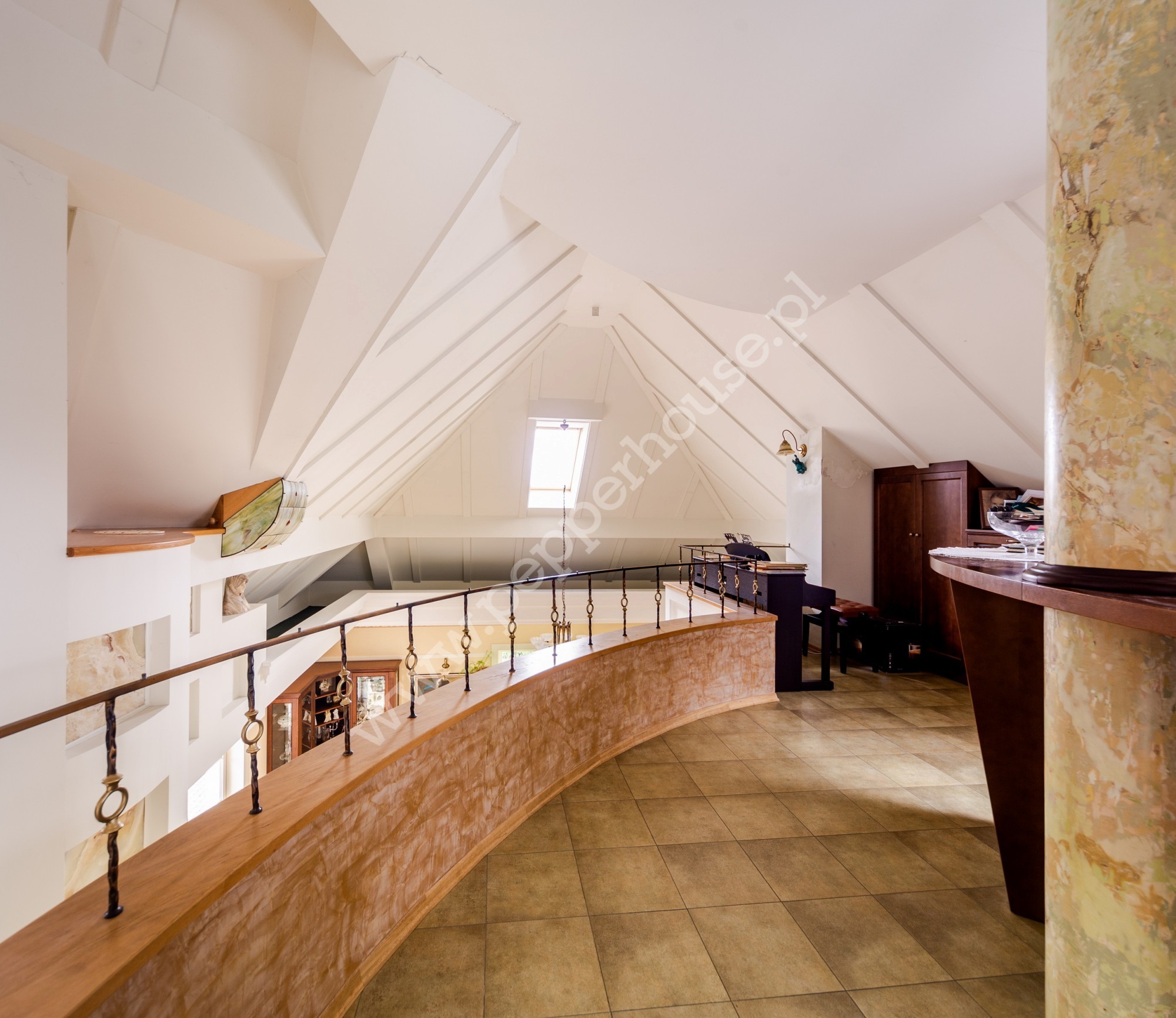 Na piętrze znajduje się rozległe pomieszczenie otwarte wraz z aneksem zabudowanym barem, antresola z aneksem kominkowo-rekreacyjnym, garderoba, pokój gościnny, łazienka. Na tym samym piętrze mamy apartament o samodzielnej funkcji mieszkalnej (dwa pokoje, kuchnia, łazienka) oraz pomieszczenie gospodarcze.