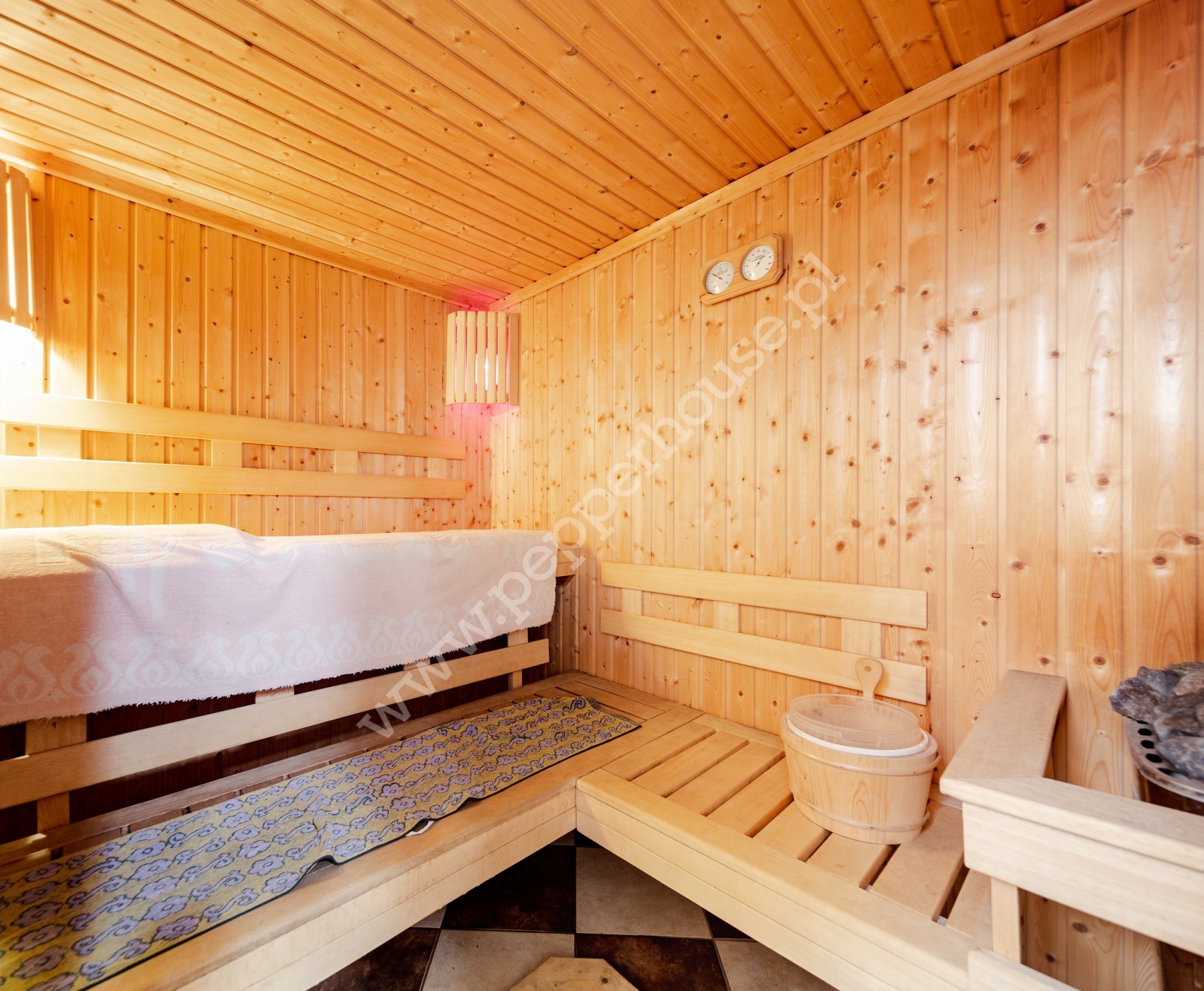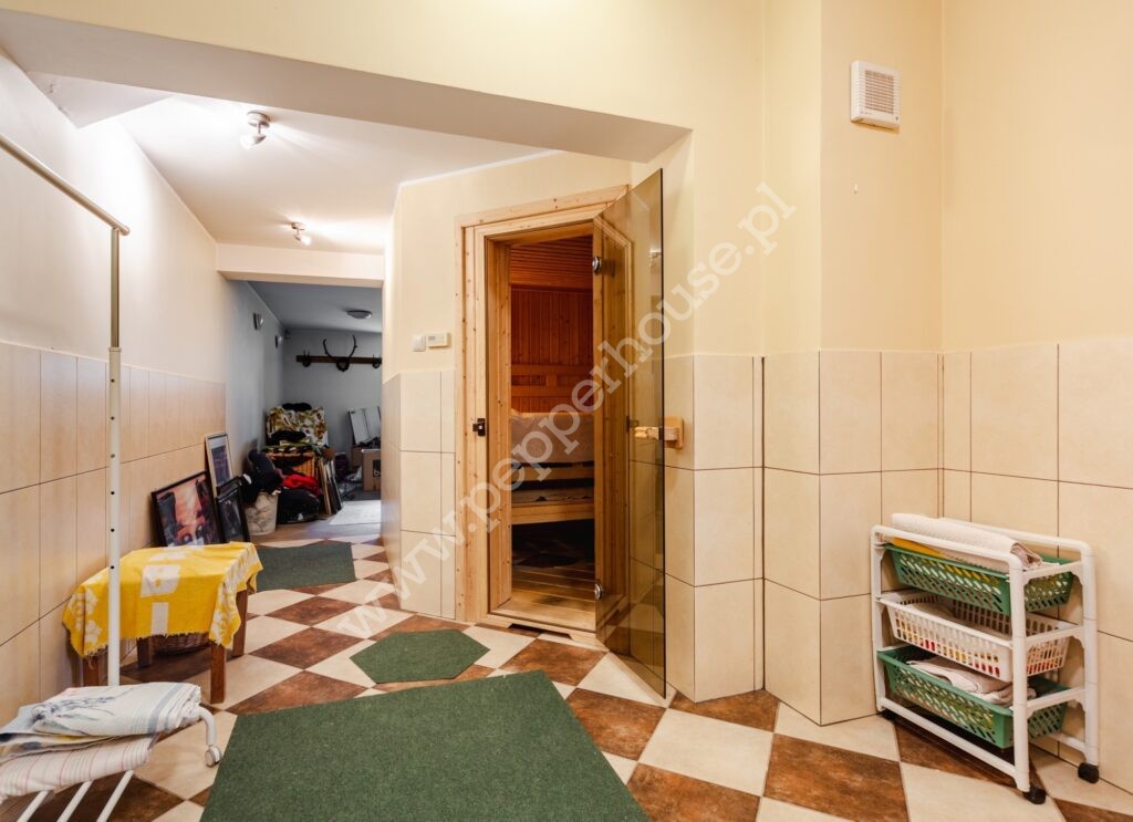 W piwnicy kotłownia wraz z pralnią, piec gazowy Viessmann, piec na brykiet trocinowy, bojler ciepłej wody- całość sterowana zintegrowanym systemem automatyki firmy Viessmann, odkurzacz centralny z 12 punktami przyłączeniowymi, aparat prądotwórczy, sauna wraz z zapleczem (prysznic, WC), letnia kuchnia, pomieszczenie rekreacyjne oraz gospodarcze.