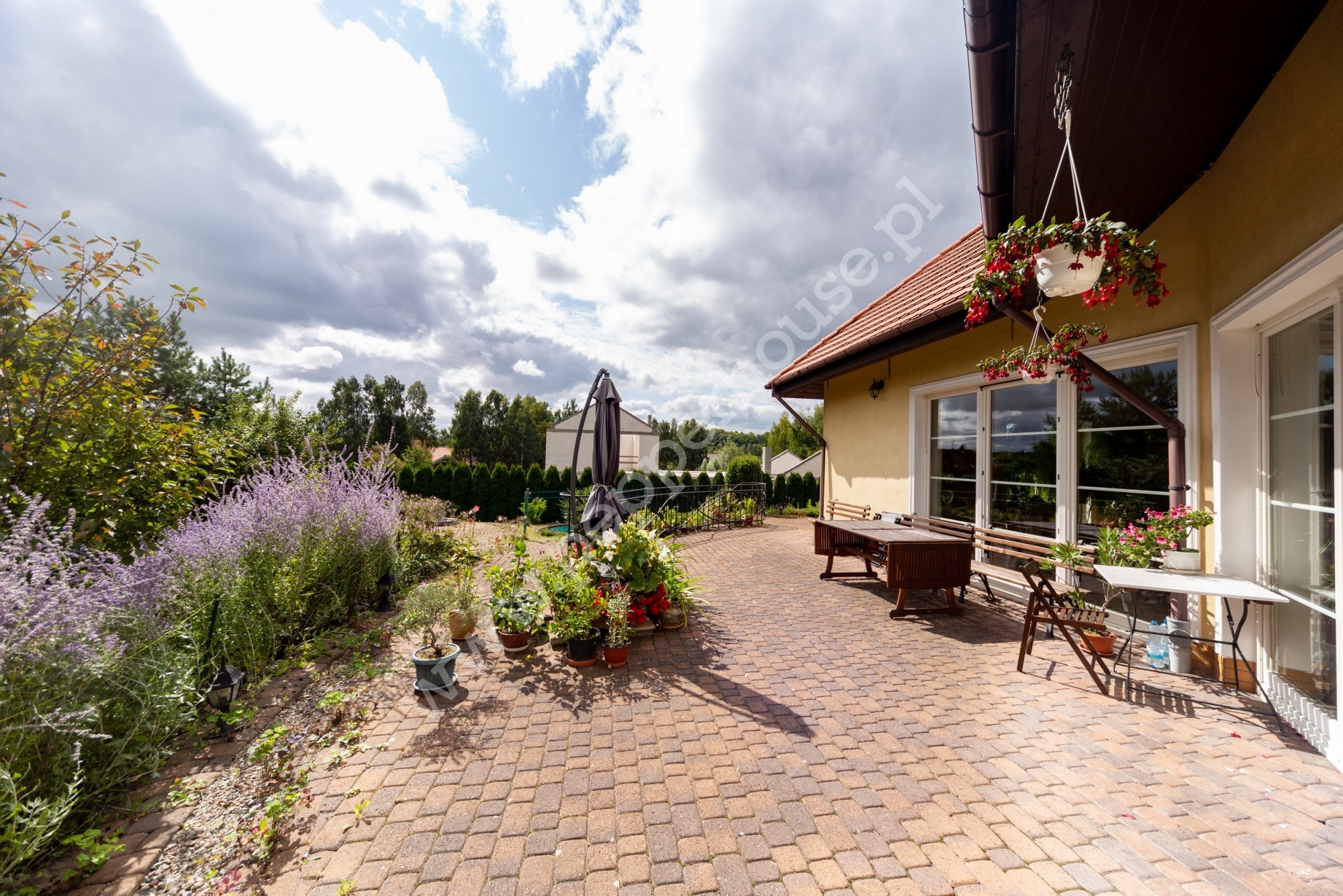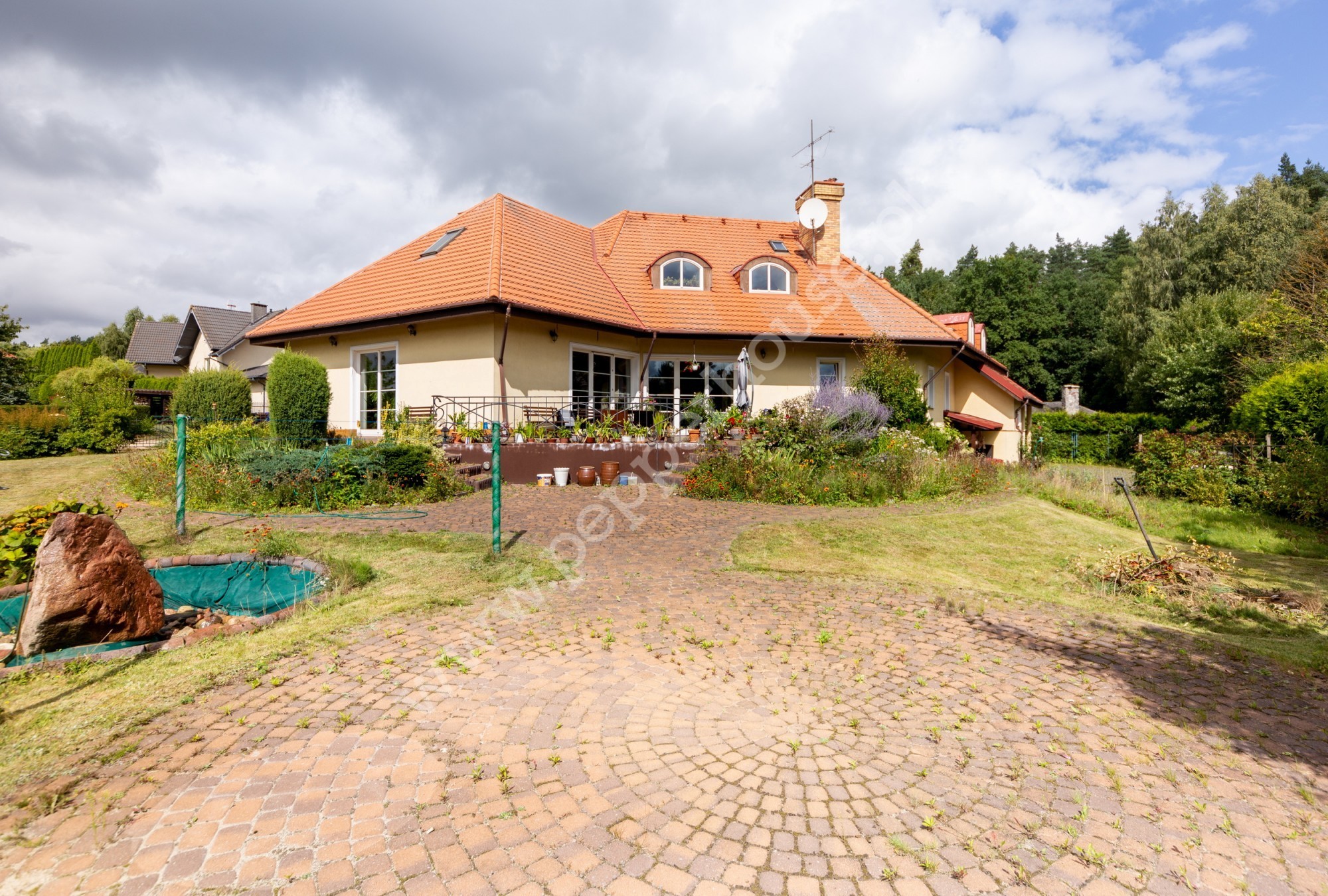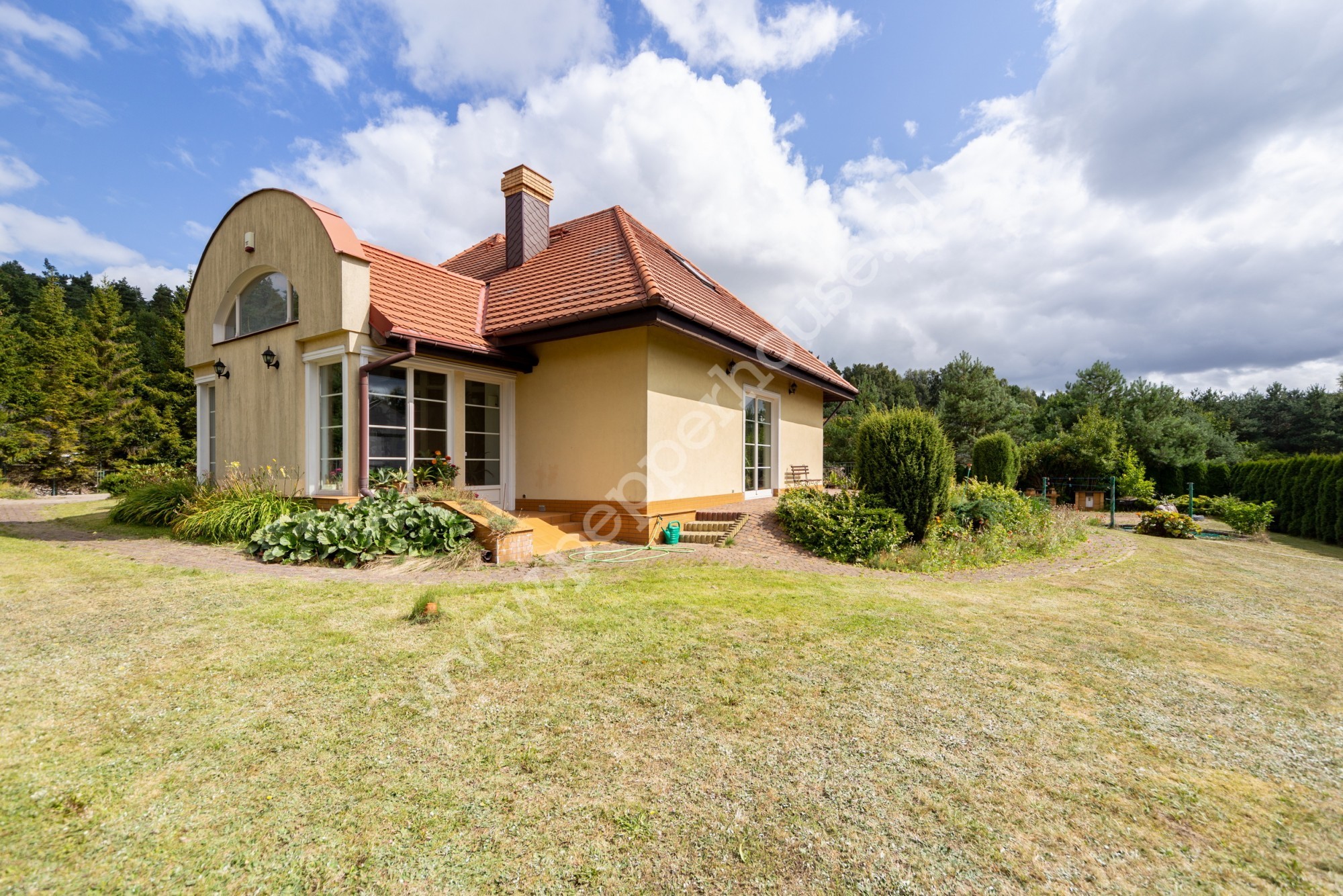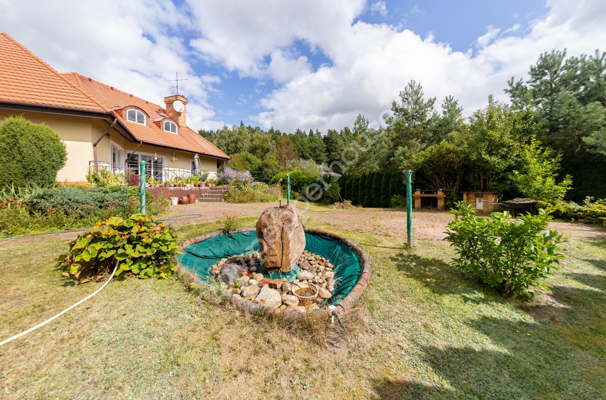 Ogród wspaniale prowadzony w ekologiczny sposób, zagospodarowany iglakami wraz bogatymi nasadzenia. Na terenie działki posadowiona została stylowa fontanna, kijki do hamaka oraz klinkierowy grill wraz ze stolikiem. W ogrodzie zastosowano system sterowania oświetleniem (35 sztuk lamp).