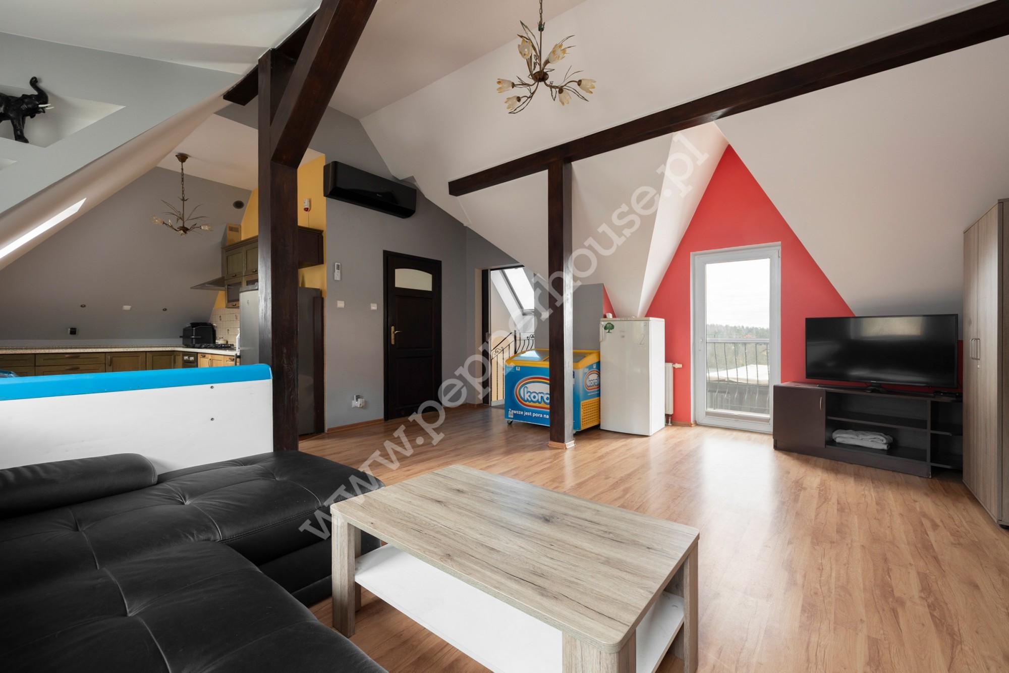 Piętro o powierzchni 69,28 m² to komfortowy lokal mieszkalny z salonem z aneksem kuchennym, osobną kuchnią, łazienką, dwoma pokojami i korytarzem. Istnieje możliwość wykorzystania tej części jako zaplecza dla działalności – np. gabinetu, pomieszczenia socjalnego lub biura – zapewniając jednocześnie prywatność i wygodę codziennego życia.