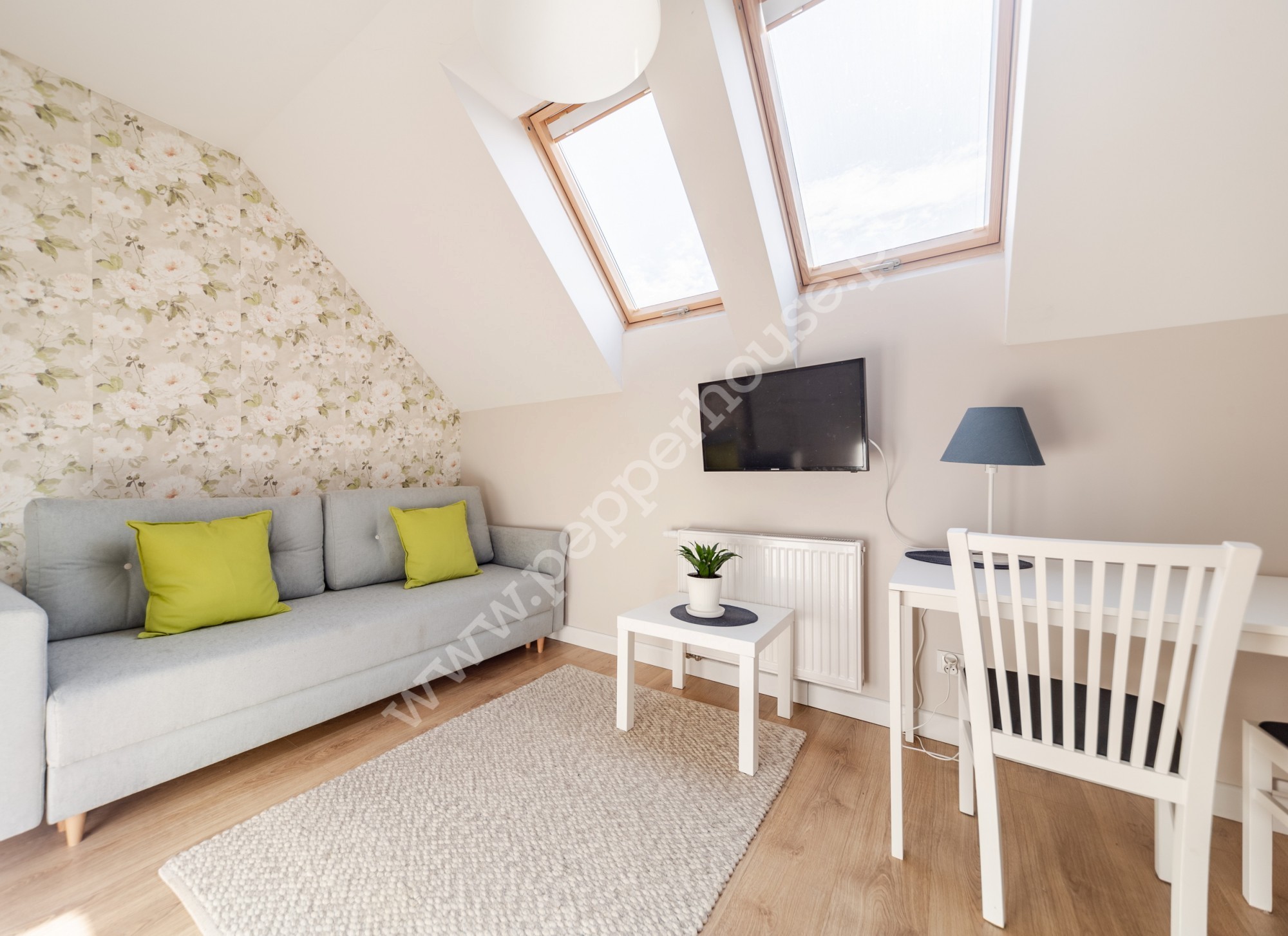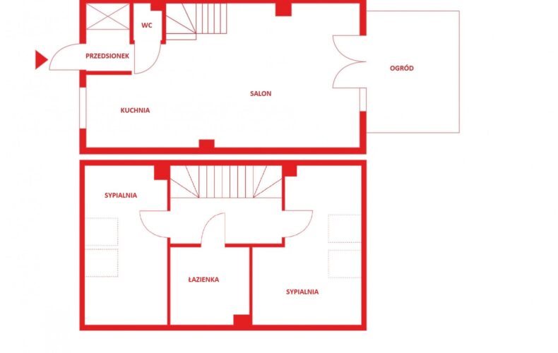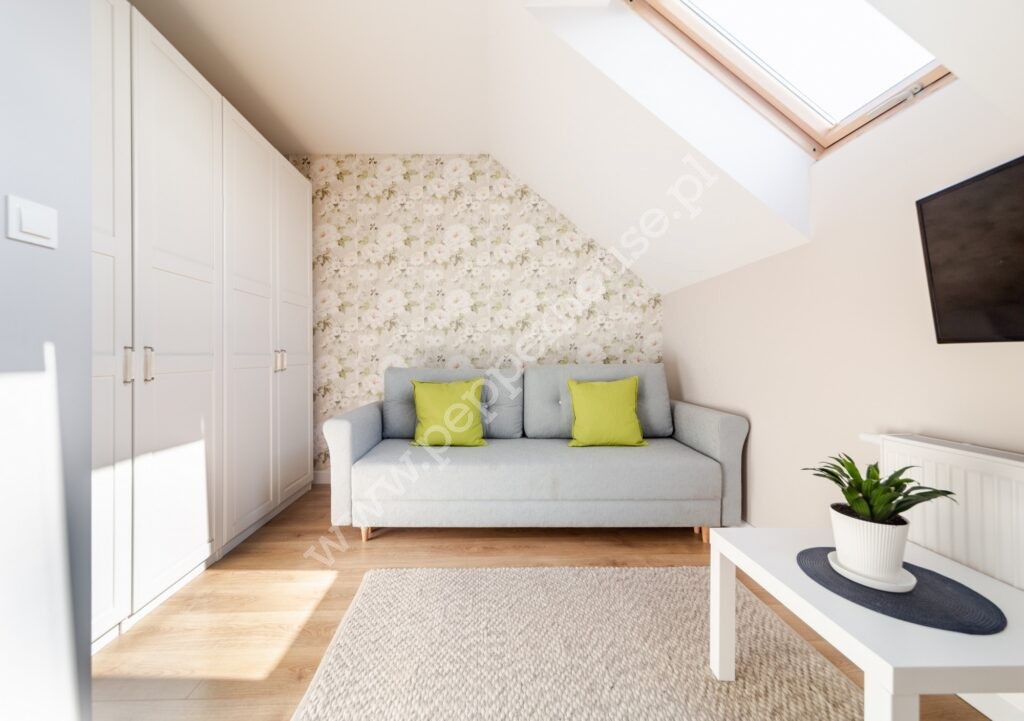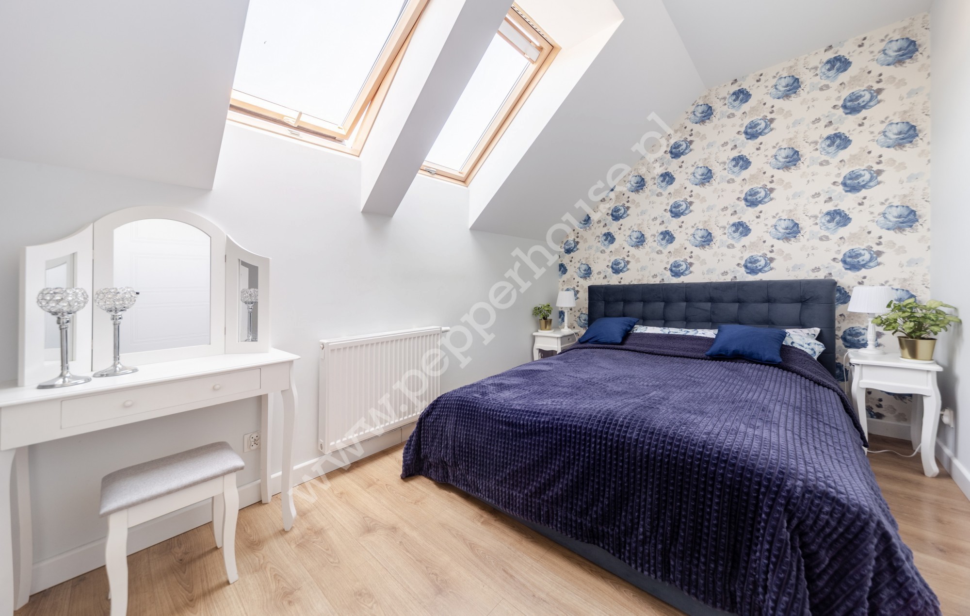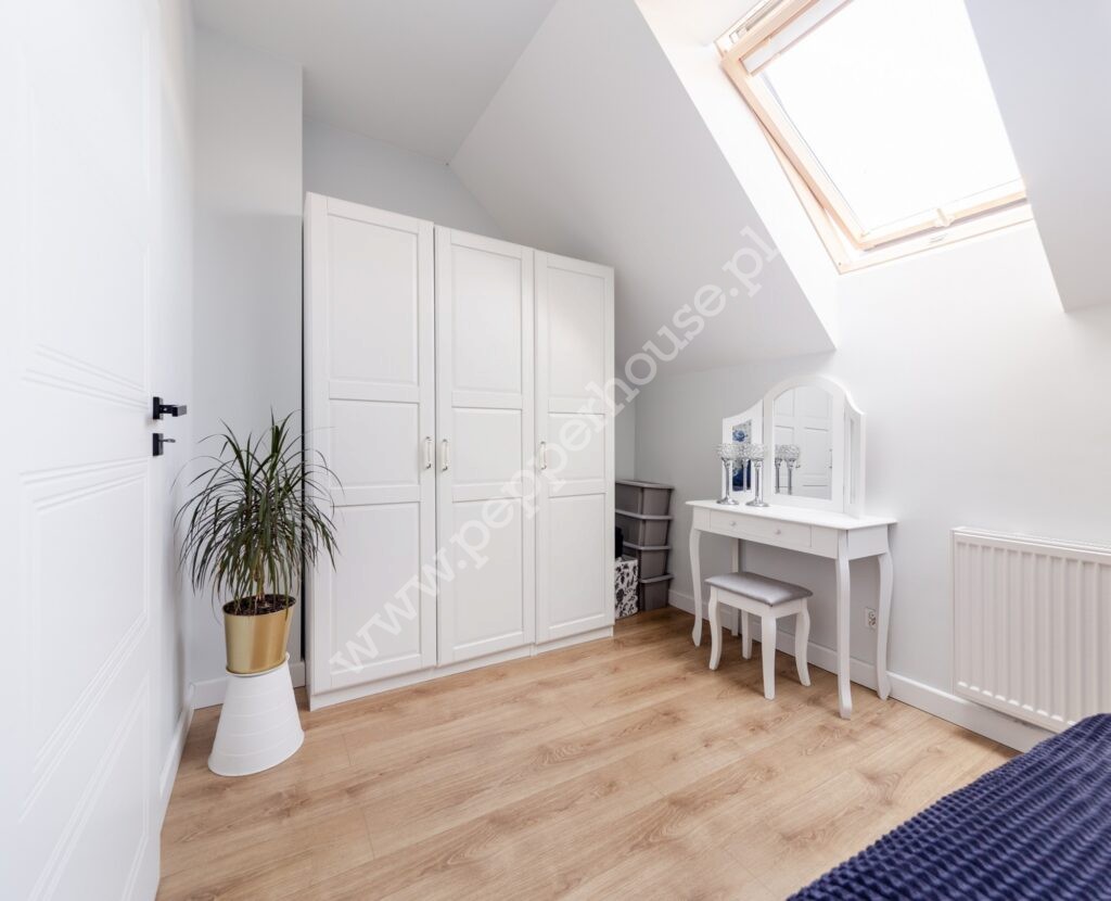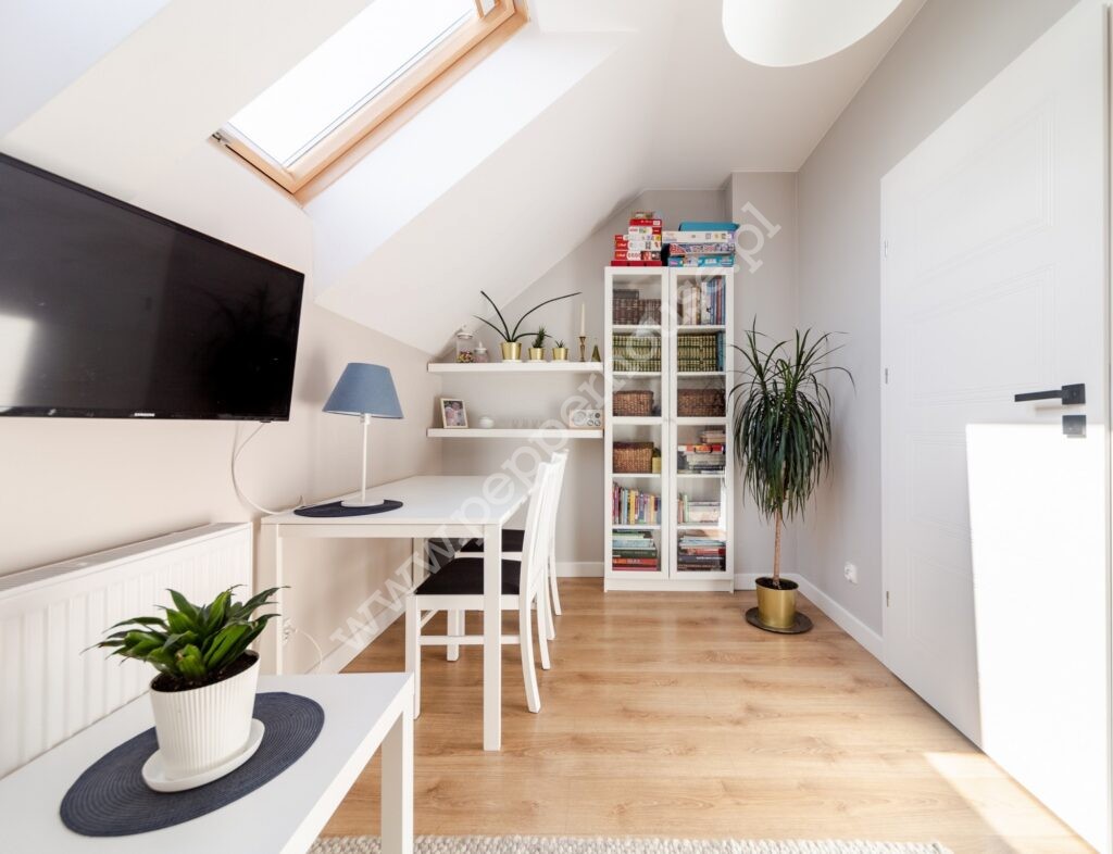 Na piętrze mamy do dyspozycji dwie przestronne sypialnie oraz dużą łazienkę z kabiną typu walk-in. Dużym atutem lokalu są możliwości aranżacyjne. Poziom 2 to poddasze, które w prosty sposób możemy zaadoptować na pełnoprawną sypialnię. Dzięki niej powierzchnia zwiększa się do prawie 90 m2. Istnieje także możliwość wydzielenia osobnej kuchni z oknem.