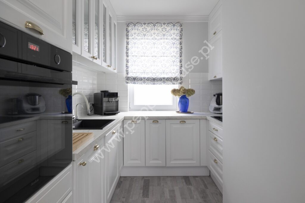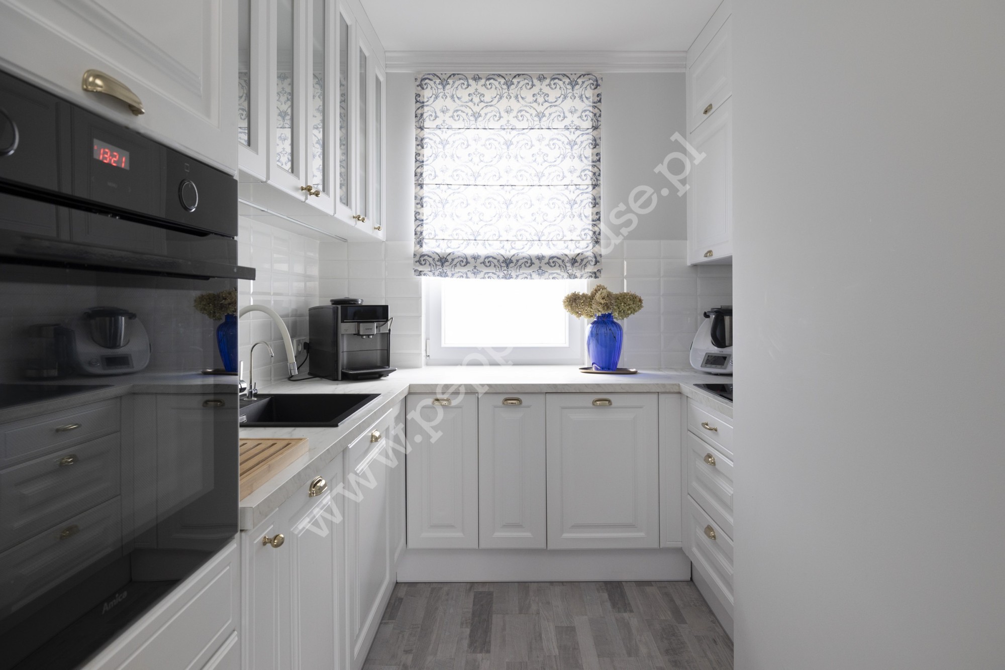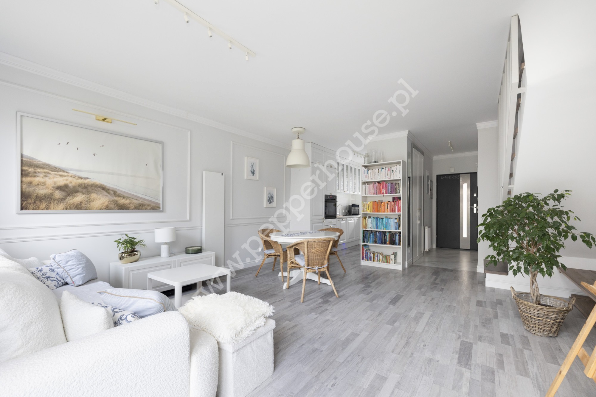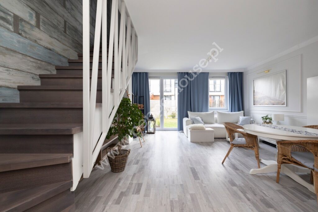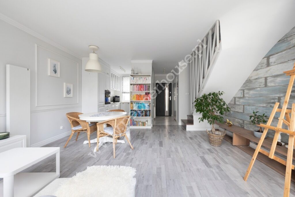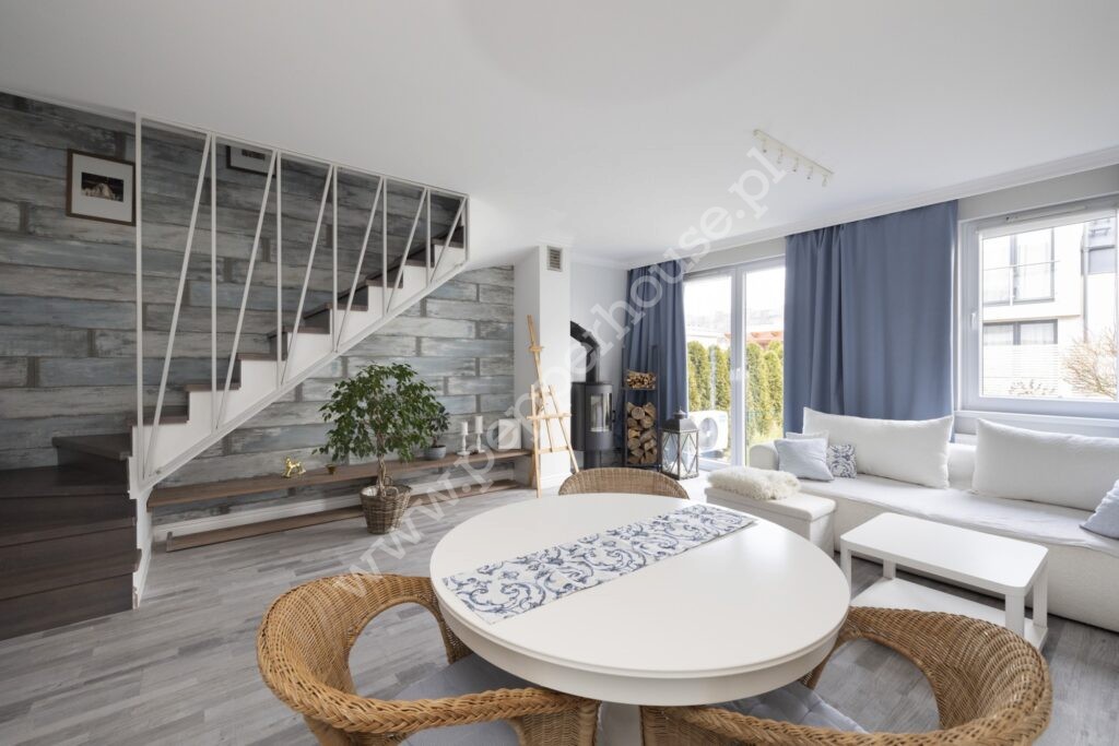 W salonie dodatkowo zainstalowana została kominek wolnostojący, który otuli swoim ciepłem zarówno w zimniejsze, jak i romantyczne wieczory. Całość wykończona w jasnych, spójnych barwach. Nowoczesna kuchnia zachwyca ponadczasowymi rozwiązaniami.