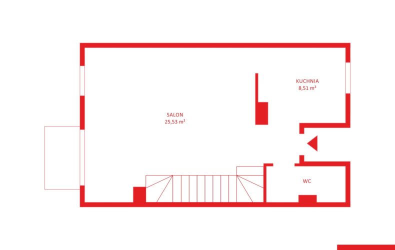 Na parterze znajduje się przestronny salon z aneksem kuchennym oraz toaleta (wygospodarowane miejsce na zabudowaną pralkę, suszarkę).