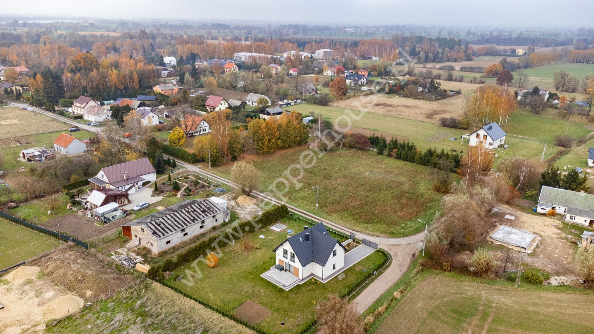Dojazd do działki krótką drogą z płyt betonowych, prowadzącą bezpośrednio do głównej drogi asfaltowej.