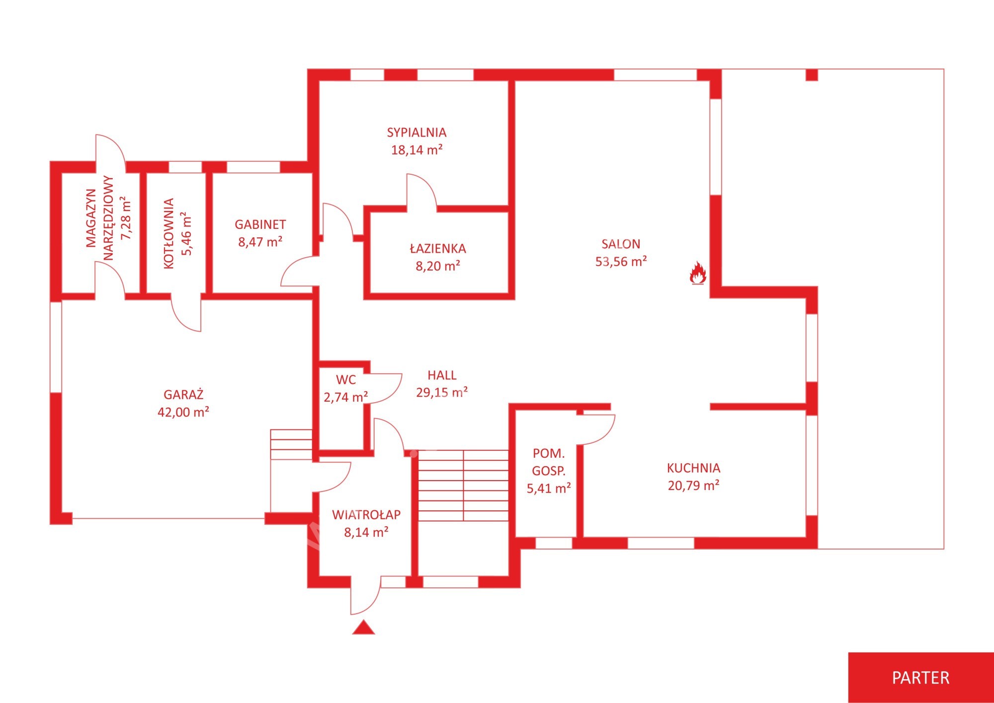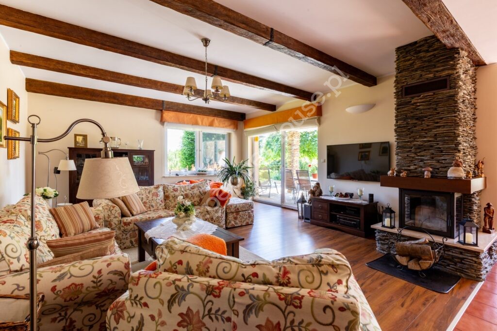 – Przestronny salon z dużymi oknami, wyjściem na taras z widokiem na ogród, połączony z jadalnią – idealnym miejscem z przestrzenią do spotkań rodzinnych i przyjęć. Salon wyposażony jest w kominek, który nadaje wnętrzu ciepły i przytulny charakter (53,56 m2)