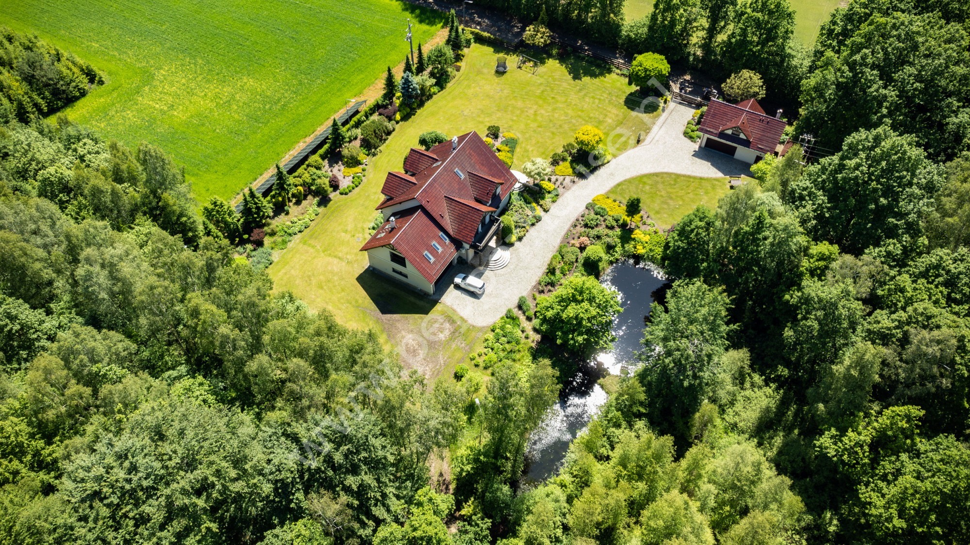 Na posesji znajduje się przepięknie zagospodarowany ogród z systemem nawadniającym, na co dzień pielęgnowany przez profesjonalną ekipę ogrodniczą, na którym znajduje się staw. Działka oświetlana jest przez 5 dużych energooszczędnych lamp LED, zasilanych z własnego źródła energii oraz monitorowana licznymi kamerami zewnętrznymi. Olbrzymi taras wyposażony został w kominek zewnętrzny, część do grillowania oraz strefę wypoczynkową. Działka jest ogrodzona, dając tym samym poczucie intymności, a wjazd na posesję jest przez bramę z automatycznym napędem.