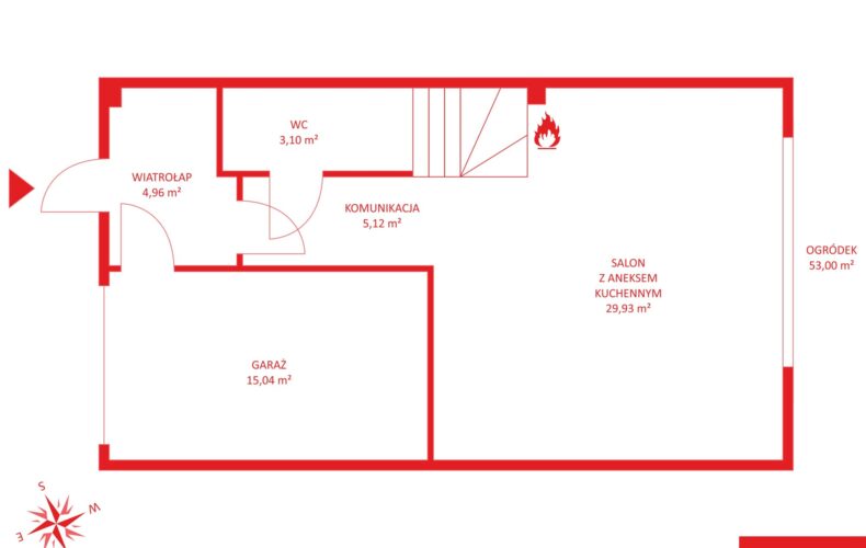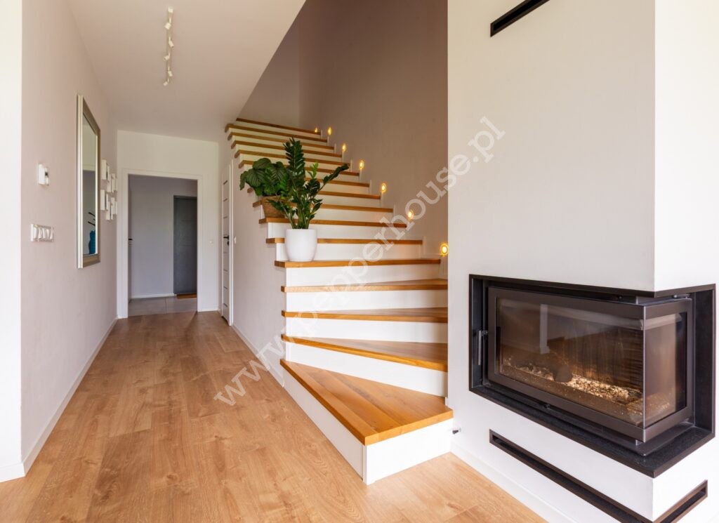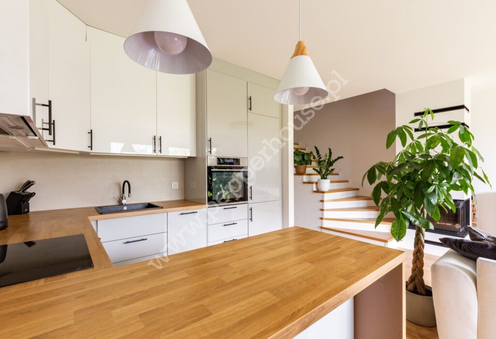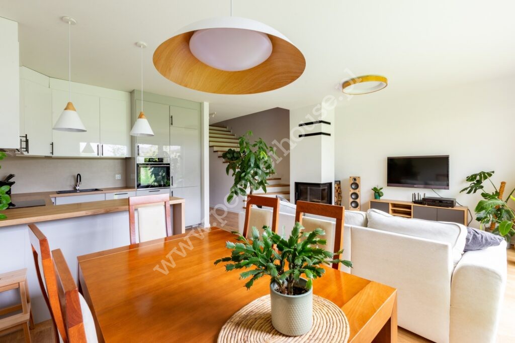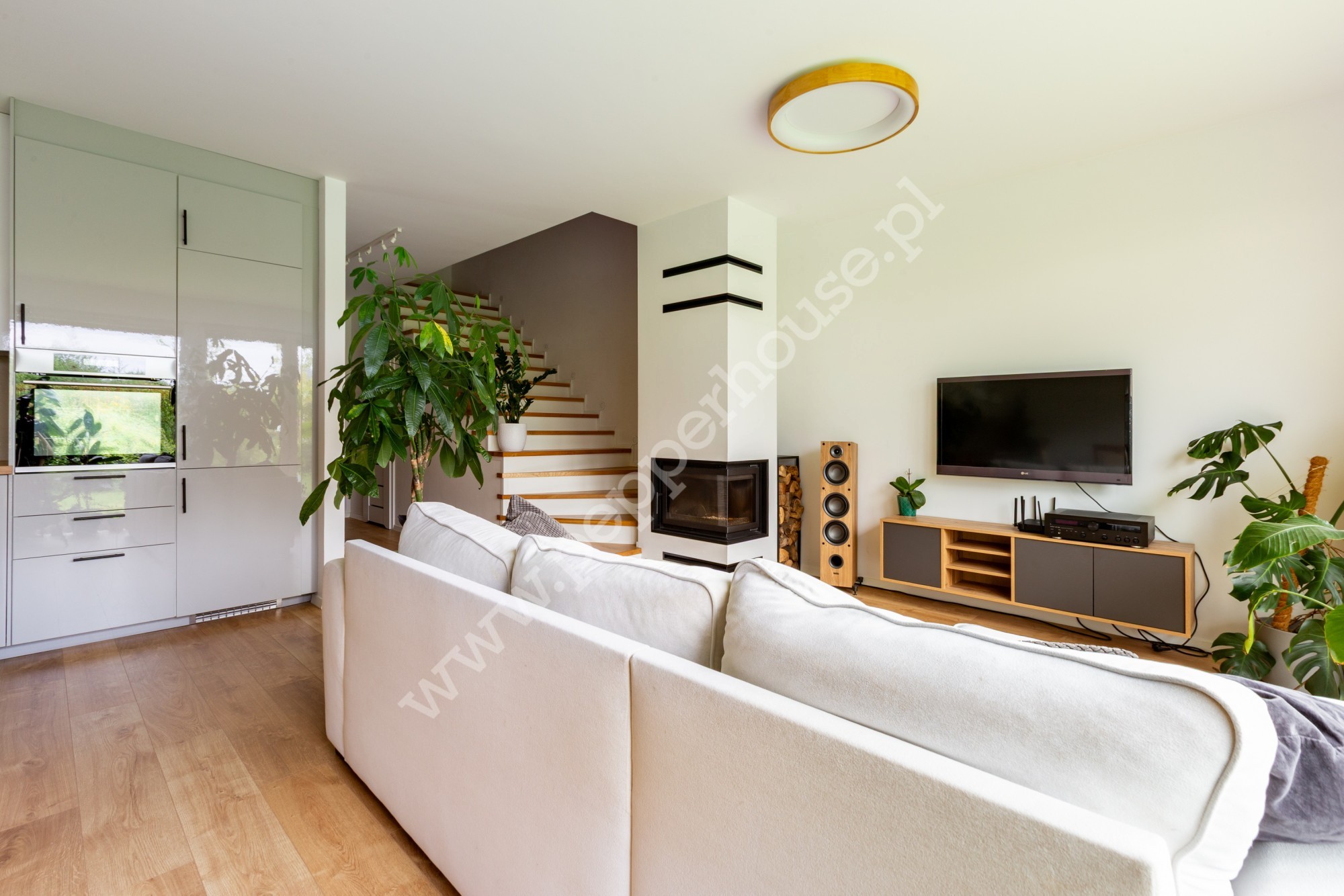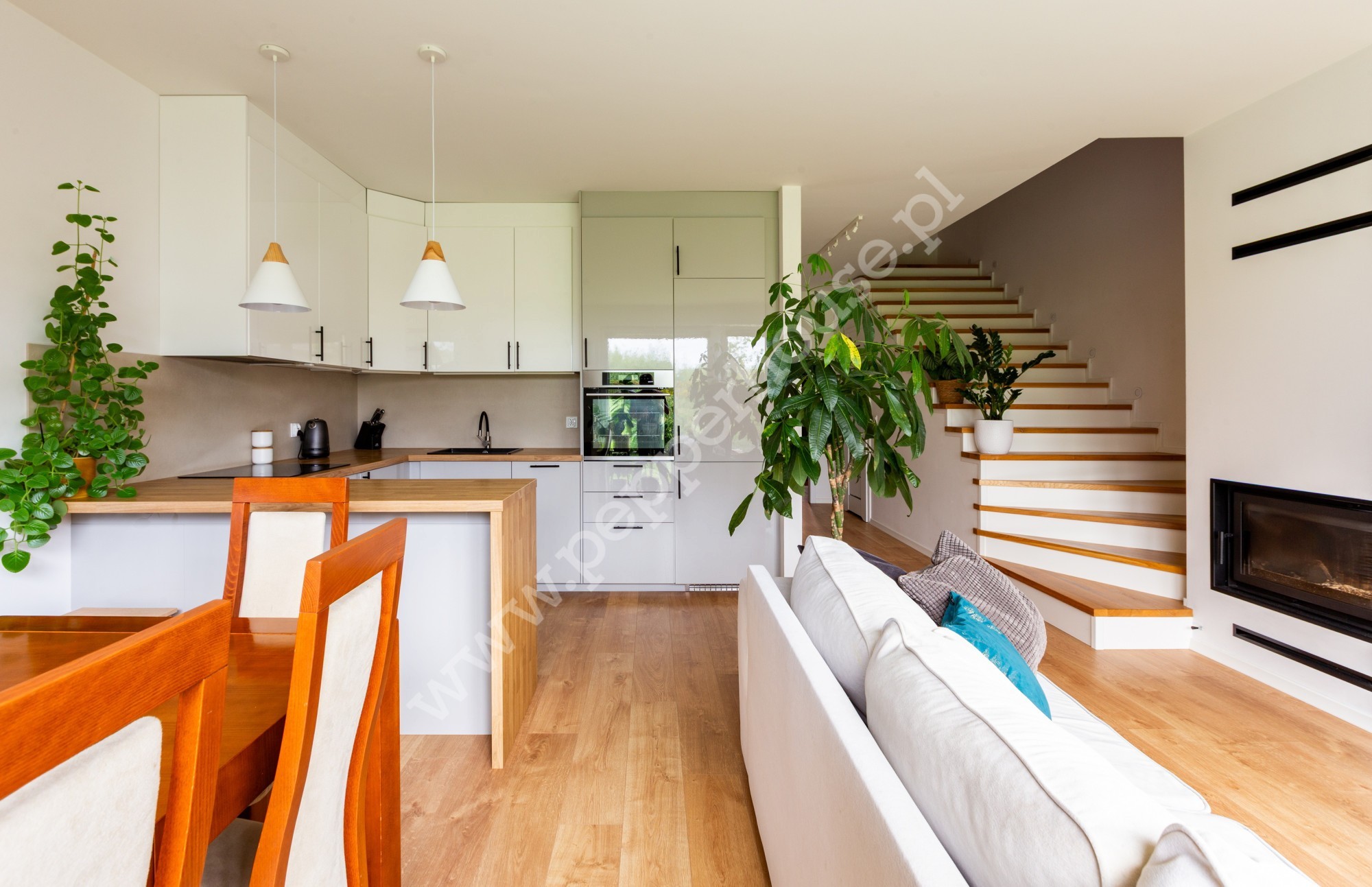 Salon z aneksem kuchennym i kominkiem – 29,93 m²
