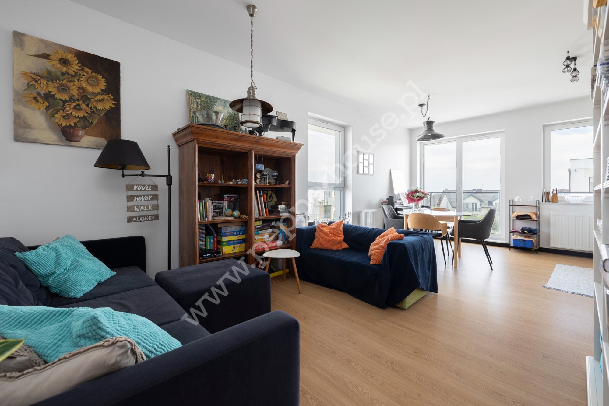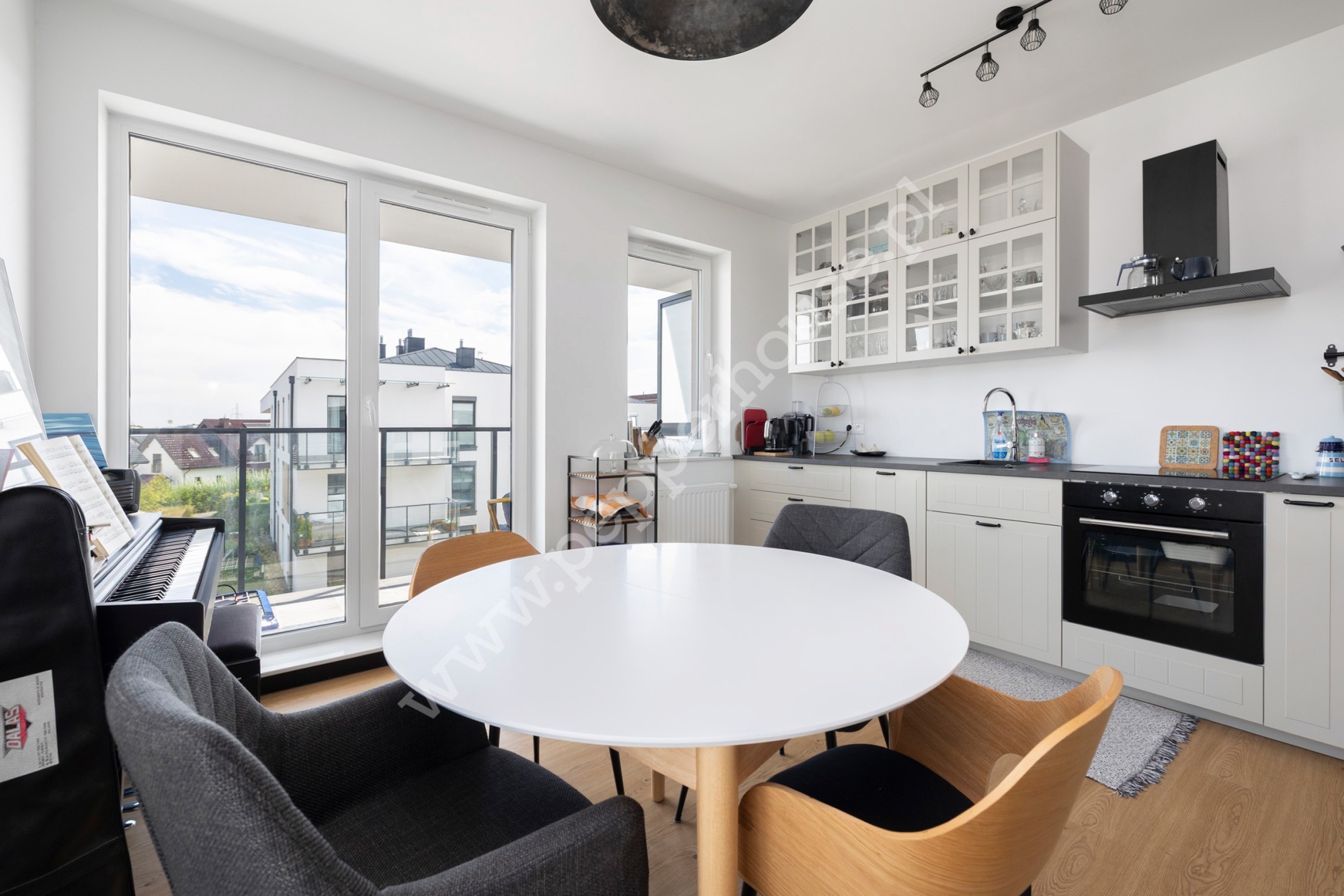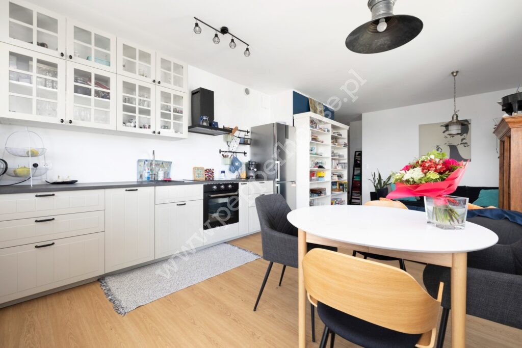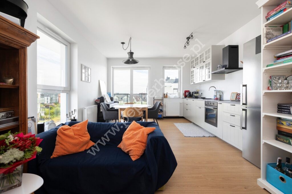 – jasny salon z aneksem kuchennym i wejściem na balkon