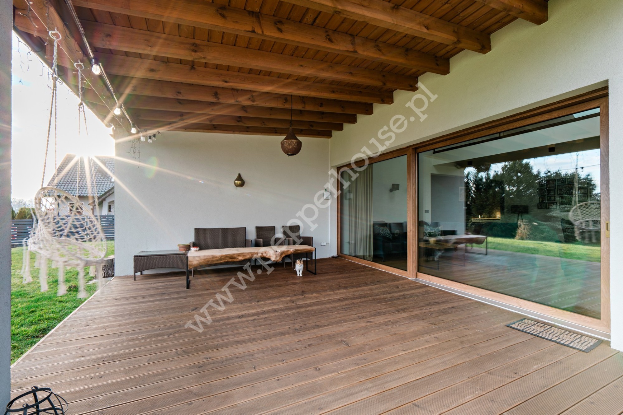- Tarasu i ogrodu: Duży taras wykończony drewnem, idealne miejsce do odpoczynku. Ogród z licznymi nasadzeniami i dużą przestrzenią do zagospodarowania według własnych potrzeb.