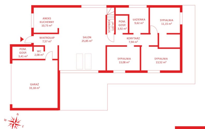 - Garażu dwustanowiskowego i 3 pomieszczeń gospodarczych: Przemyślane rozwiązania dla komfortowego użytkowania domu.