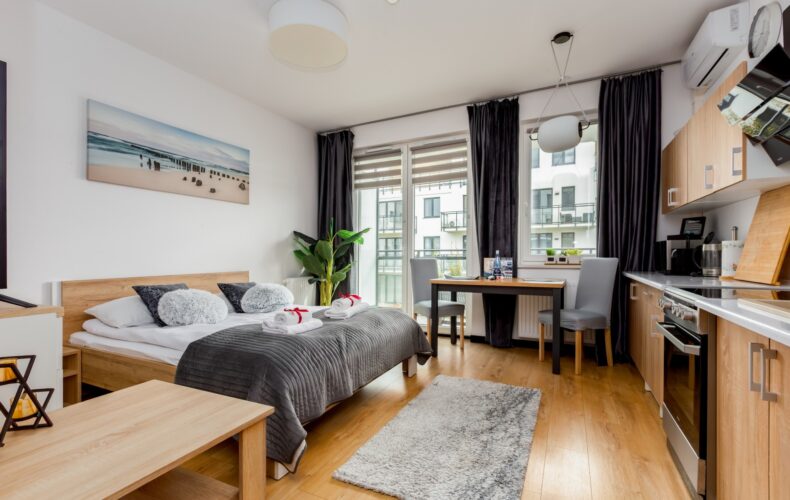 – przestronnego salonu z aneksem kuchennym (wraz ze sprzętami AGD)
