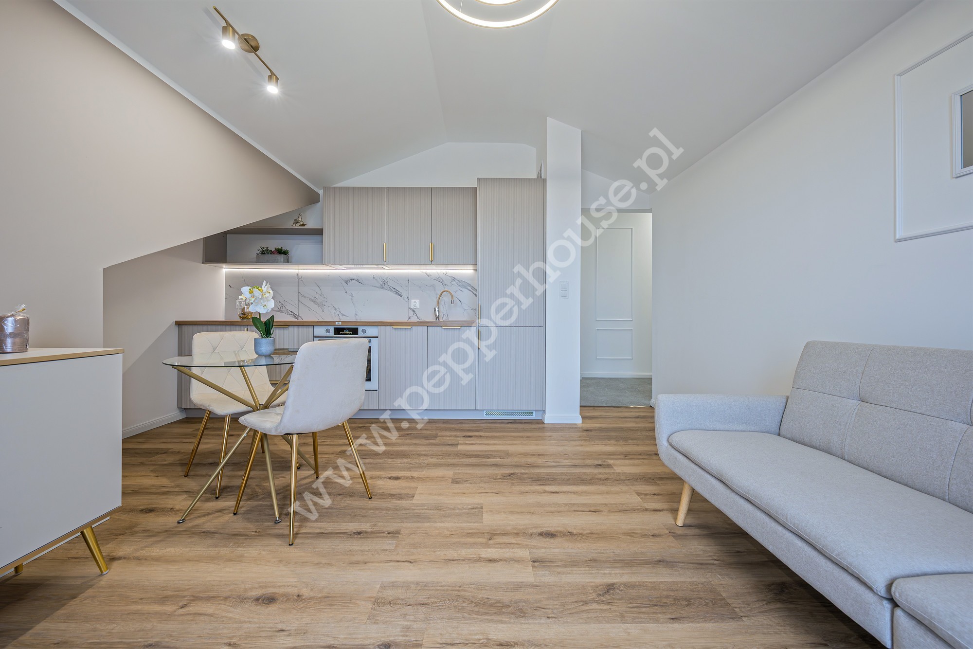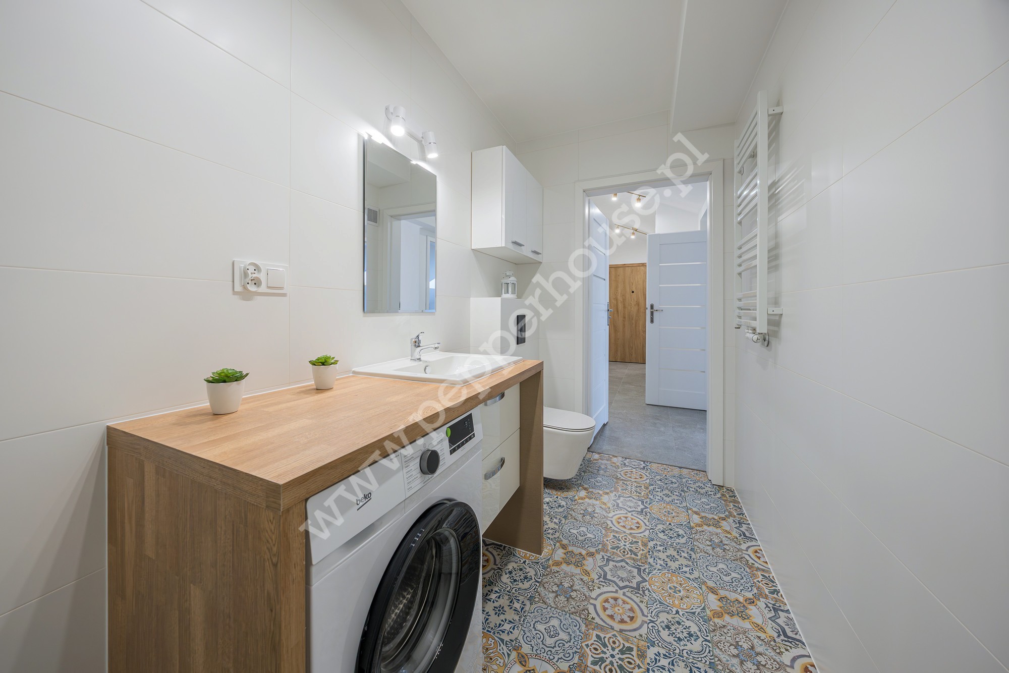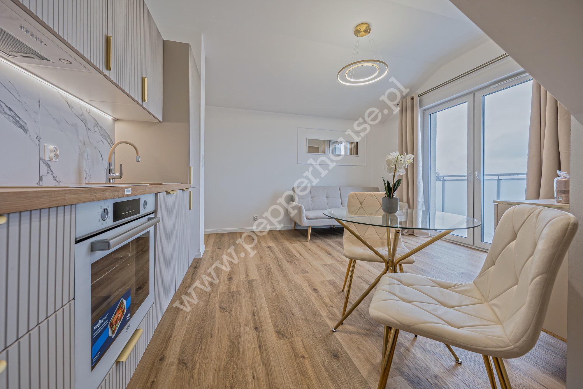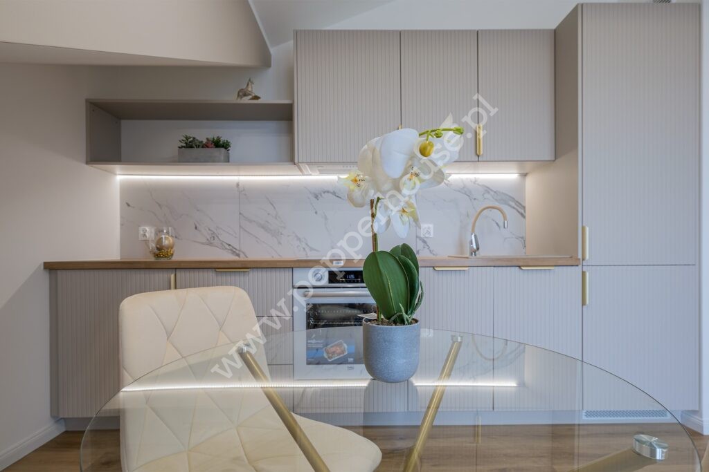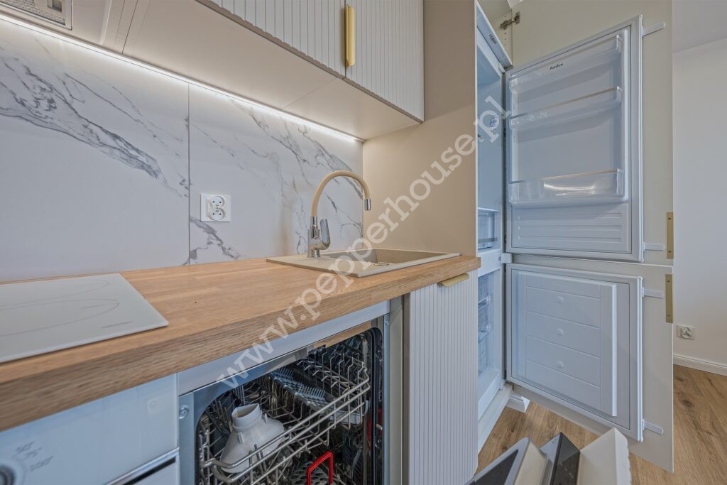 Wnętrze zostało urządzone w nowoczesnym stylu z dbałością o detale. Kuchnia wyposażona w nowe sprzęty: lodówkę, zmywarkę, płytę indukcyjną, piekarnik oraz pralkę – wszystko objęte gwarancją.