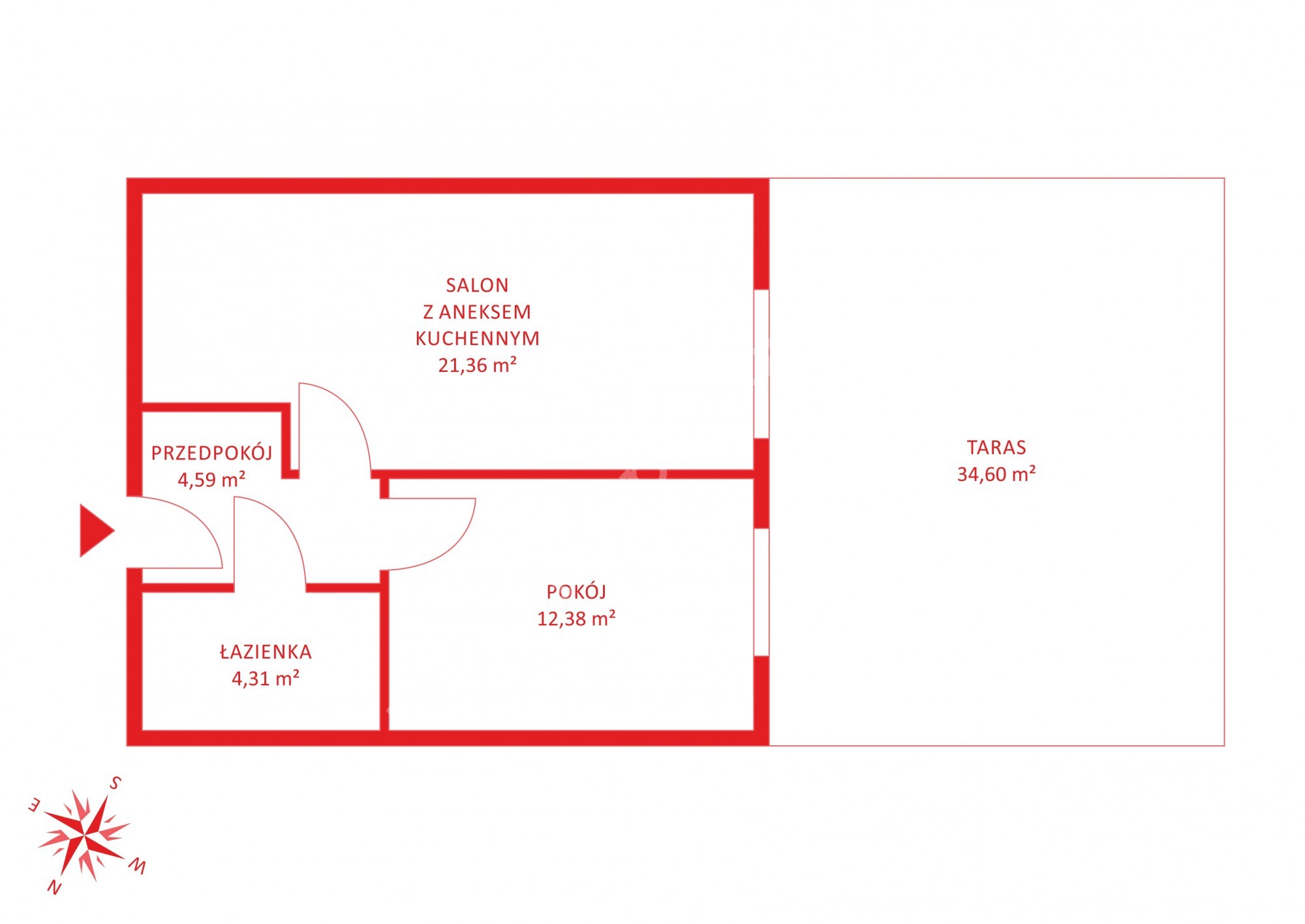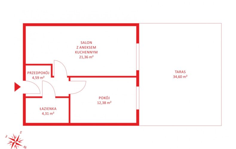 W skład mieszkania wchodzi: salon z aneksem kuchennym o powierzchni 21,36m2 oddzielna sypialnia 12,38m2 hall z wnęka na szafę pod zabudowę (4,59m2) oraz łazienki o powierzchni 4,08m2