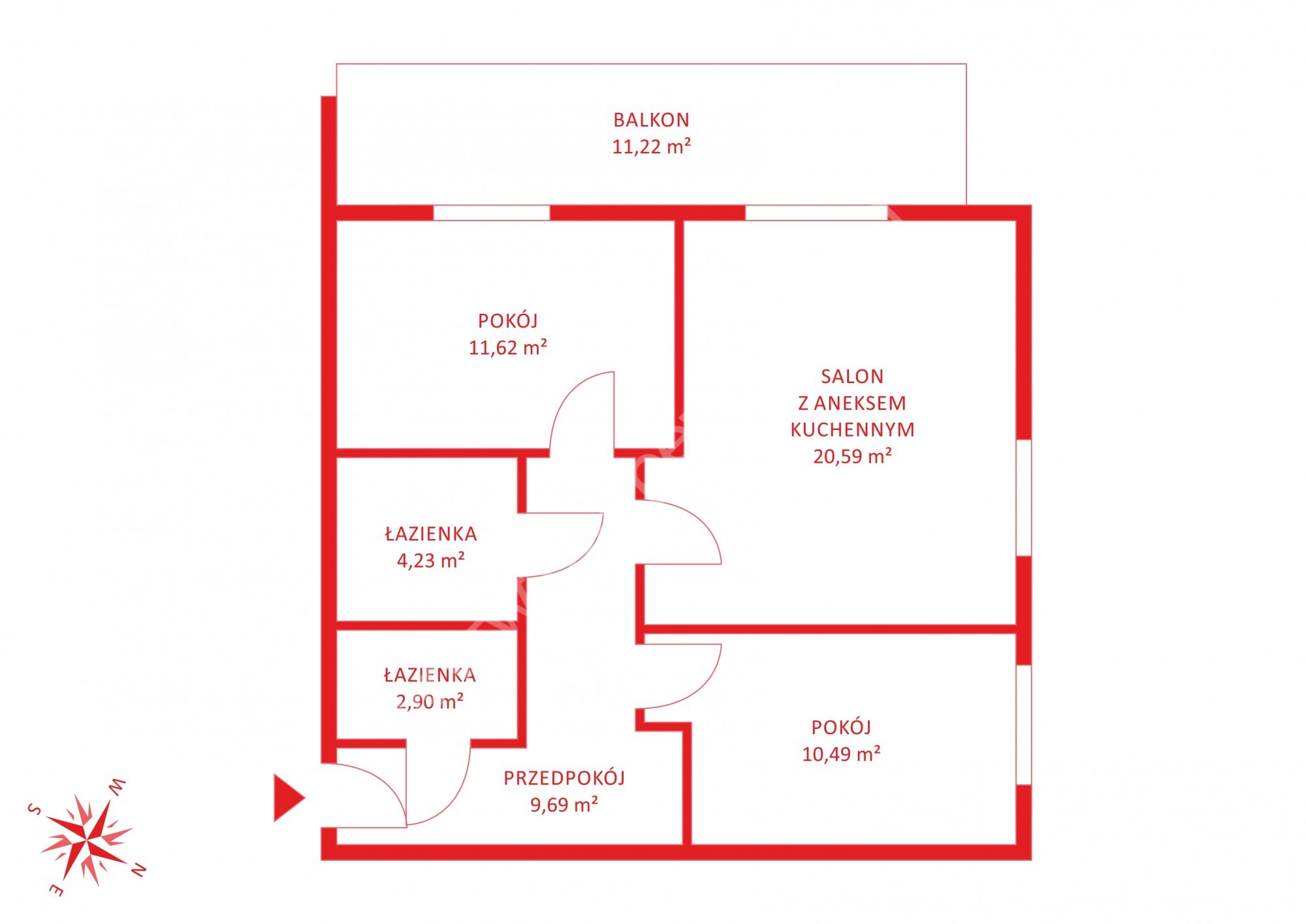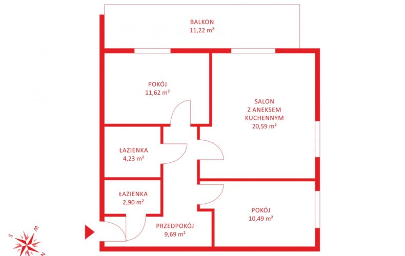 W skład mieszkania wchodzi: salon z aneksem kuchennym o powierzchni 20,59m2, oddzielnych dwóch ustawnych sypialni (11,62m2, 10,49m2),hallu z wnęka na szafę pod zabudowę (9,69m2) oraz dwóch łazienek (4,23m2 oraz 2,90m2). Istnieje możliwość zaaranżowania jednej z garderoby na pomieszczenie gospodarcze co dodatkowo podnosi wartość aranżacyjną mieszkania.