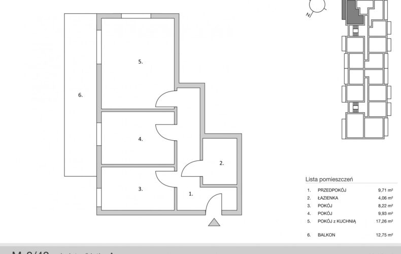 W skład mieszkania wchodzi: salon z aneksem kuchennym o powierzchni 17,26m2 oddzielnych dwóch sypialni (9,93m2, 8,22m2) z mozliwością polaczenia salonu z większą sypialnią w przestronną cześć dzienna z aneksem kuchennym, holu z wnęka na szafę pod zabudowę (9,71m2) oraz łazienka o powierzchni aż 4,06m2
