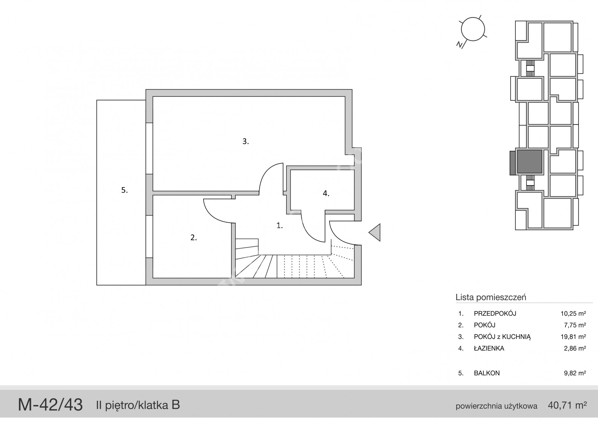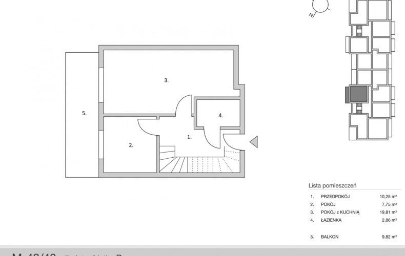 Salon z aneksem kuchennym o powierzchni 19,81m2, oddzielny pokój o powierzchni 7,75m2, hall z wnęka na szafę pod zabudowę (10,25m2) oraz łazienka o powierzchni 2,86m2.
