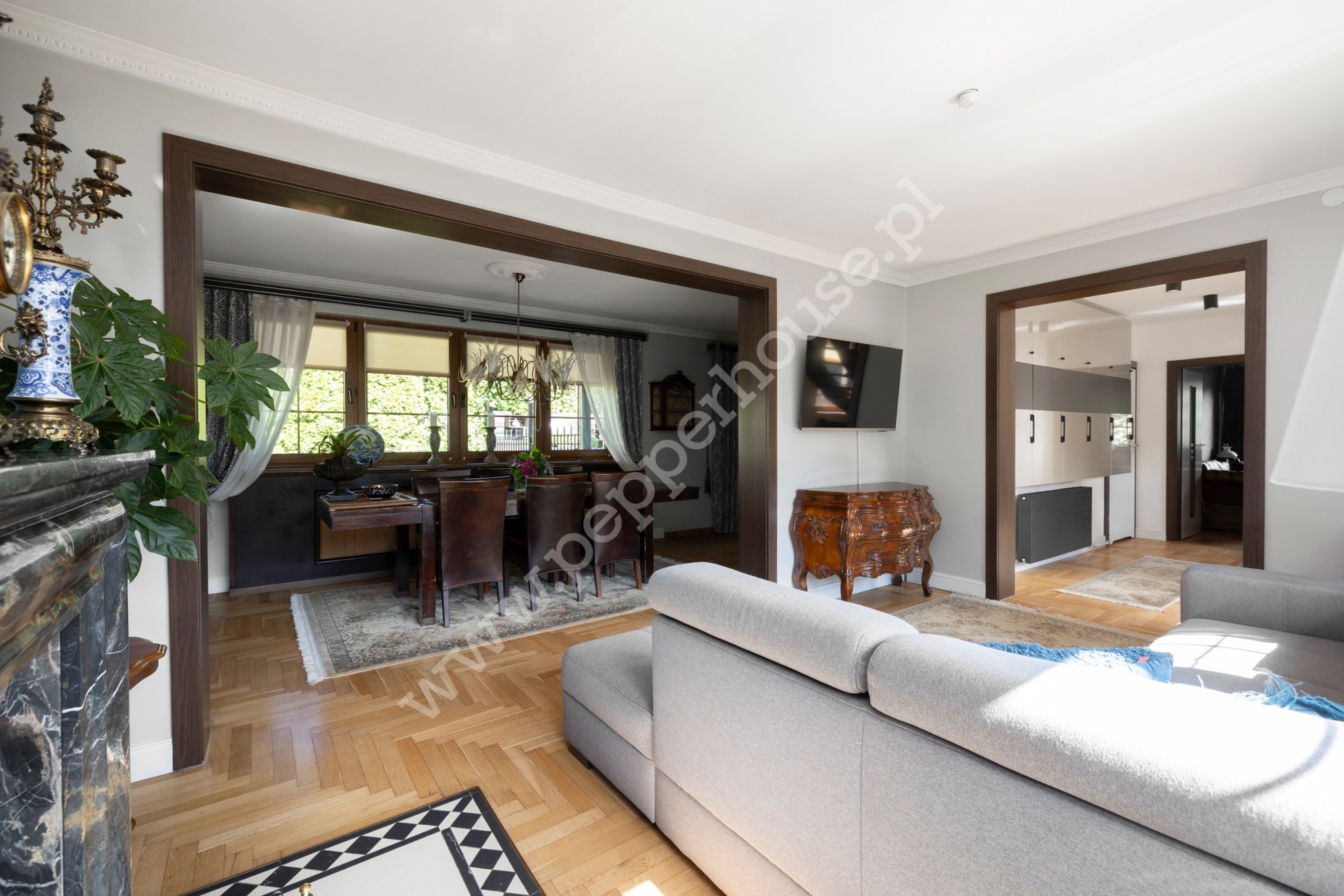 . duży salon powstały z połączenia dwóch pokoi