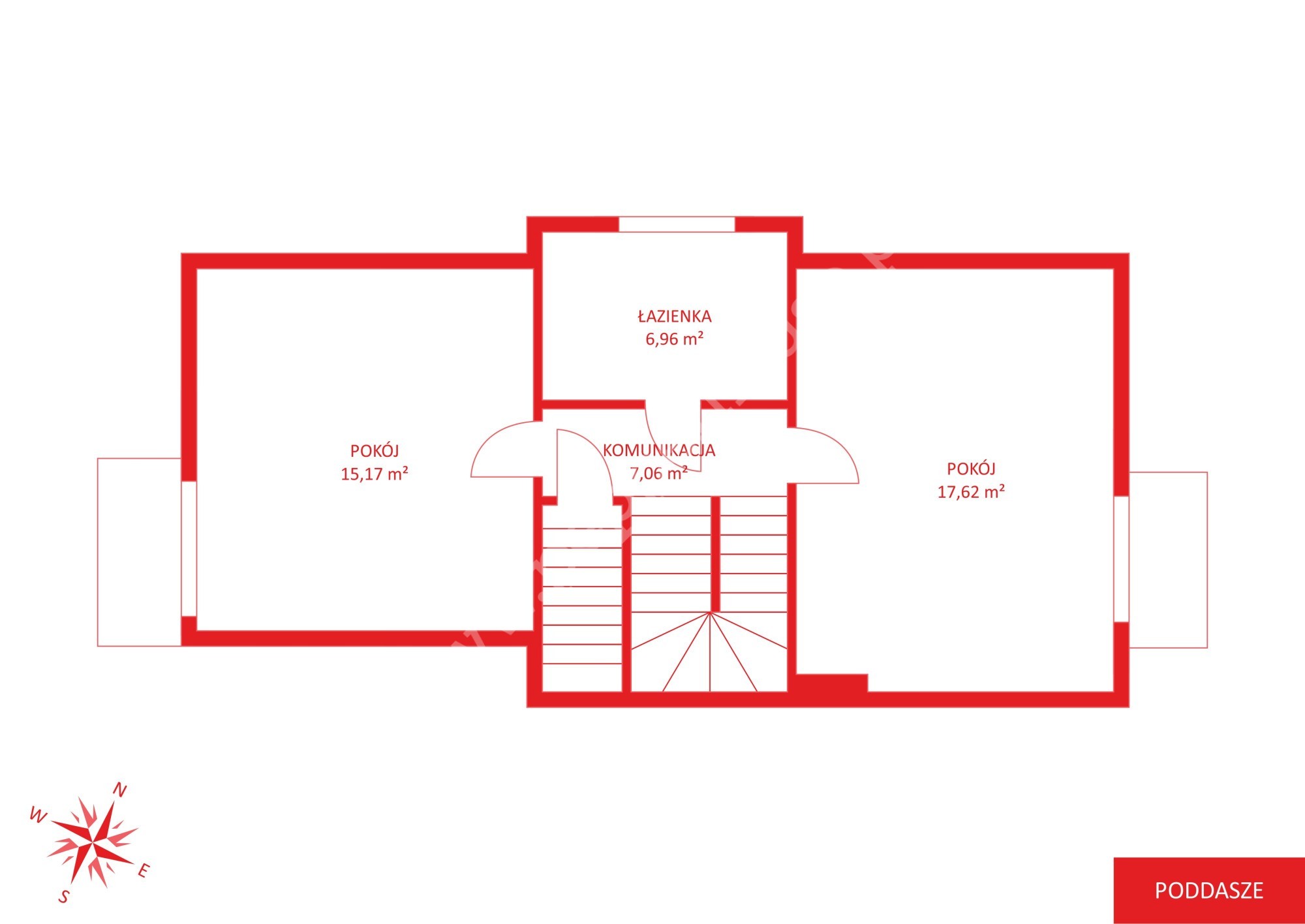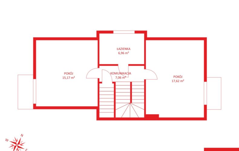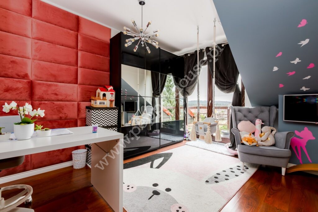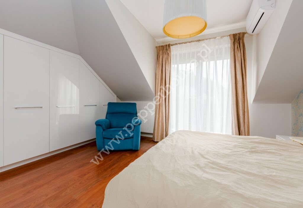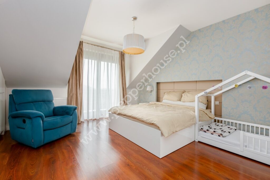 Piętro obejmuje dwie duże, dobrze doświetlone sypialnie. Każda z nich posiada wyjście na balkon, co zwiększa komfort użytkowania i daje możliwość stworzenia prywatnej strefy relaksu. Na piętrze znajduje się również funkcjonalna łazienka wykonana z kamienia. Z garderoby prowadzi wejście na poddasze, które pozostawia szerokie pole do własnej aranżacji — może służyć jako dodatkowy pokój, pracownia lub przestrzeń rekreacyjna.