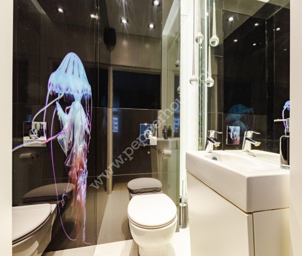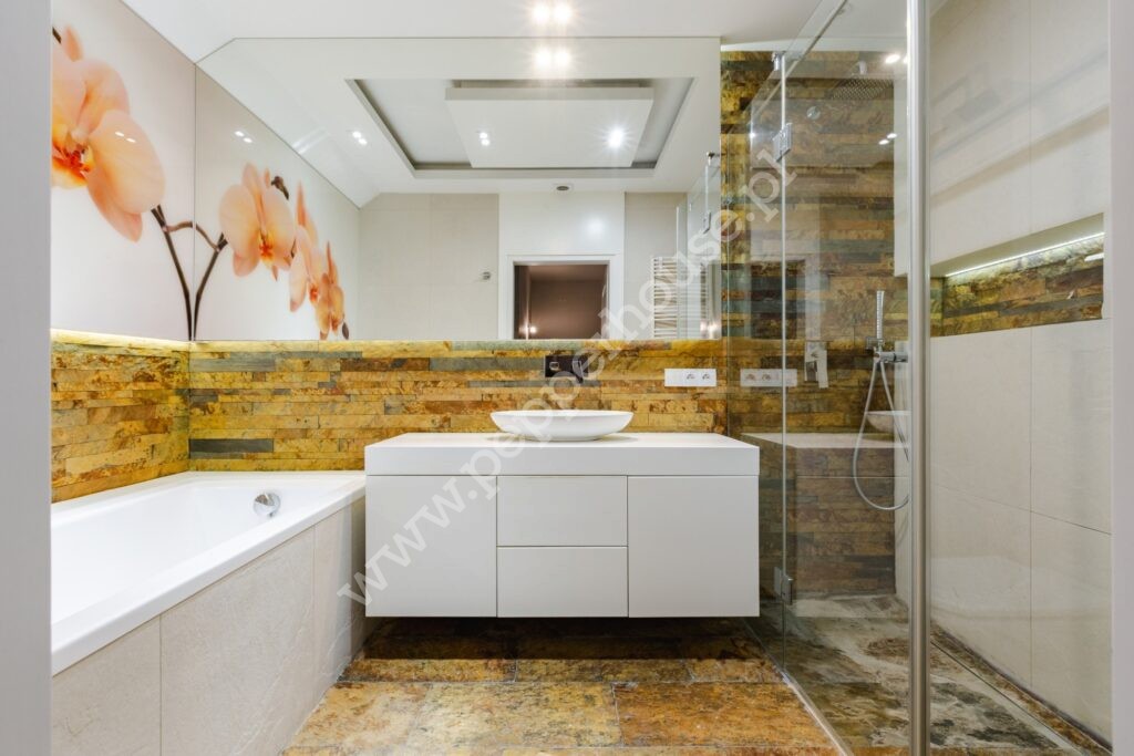 – w łazienkach eleganckie wykończenie kamieniem naturalnym.