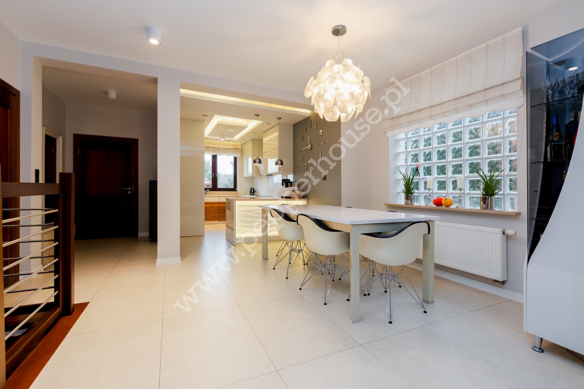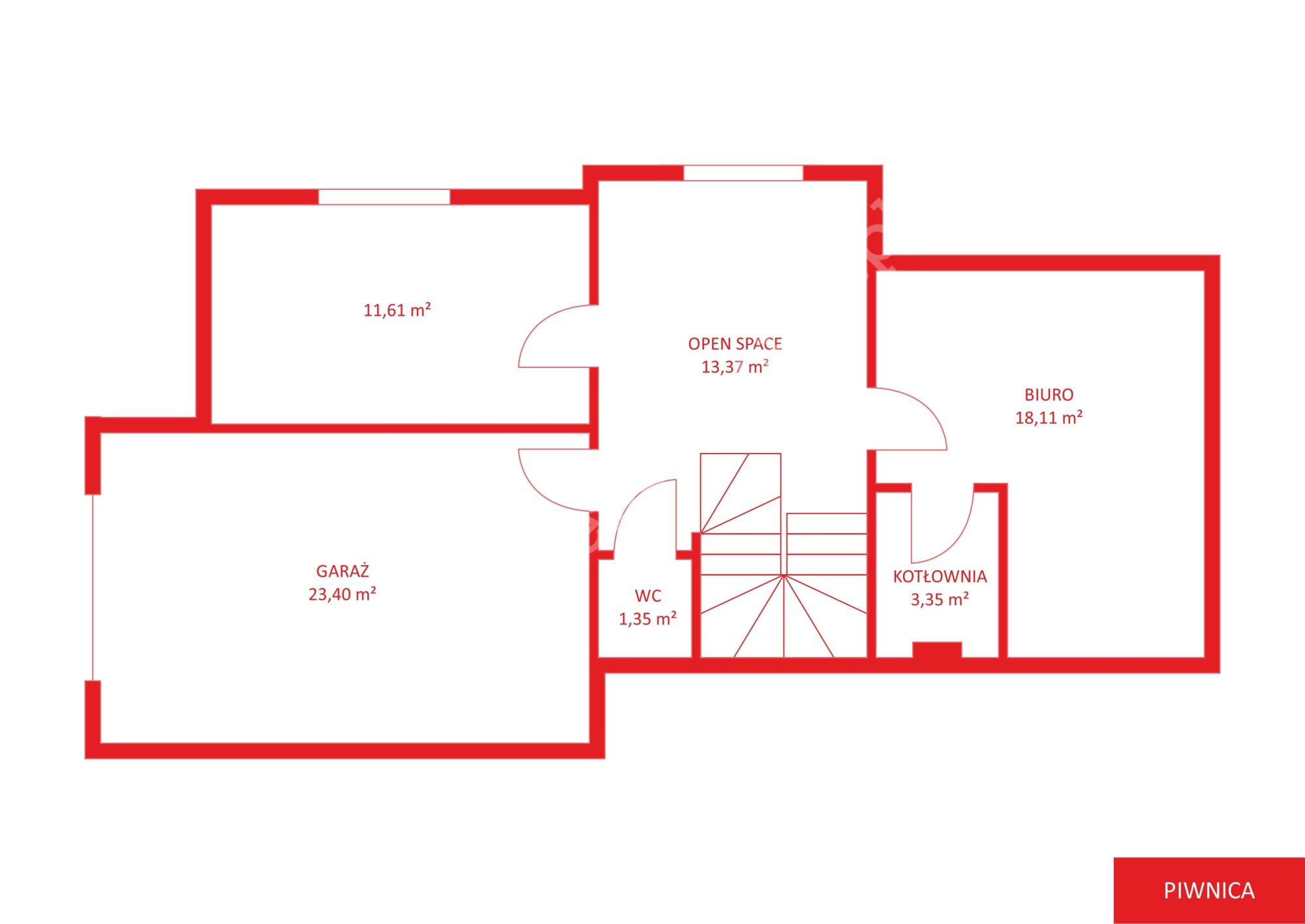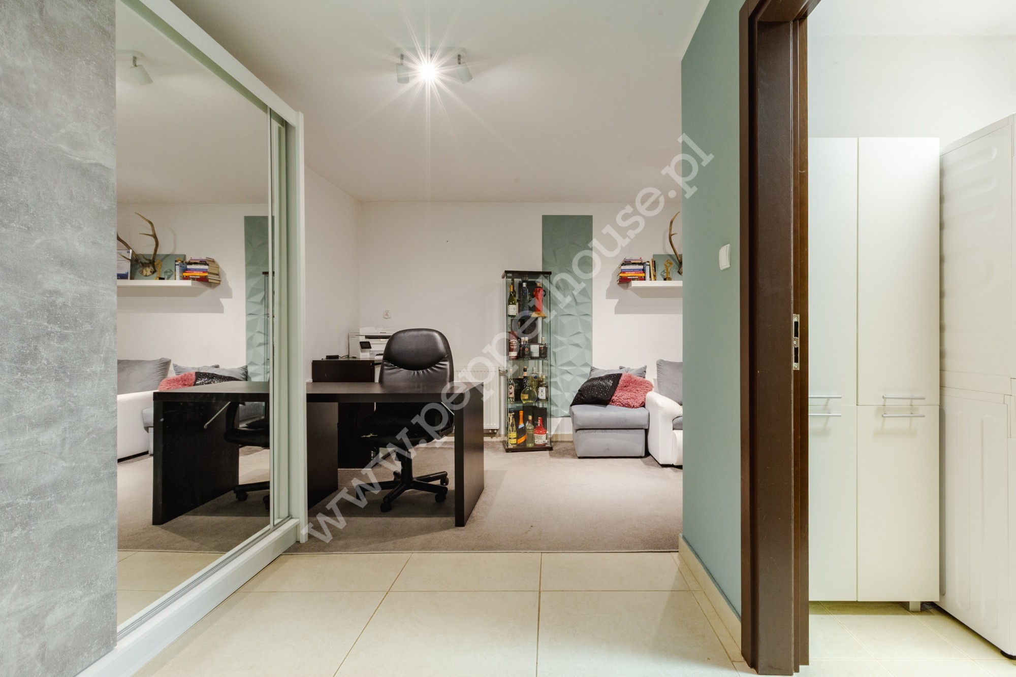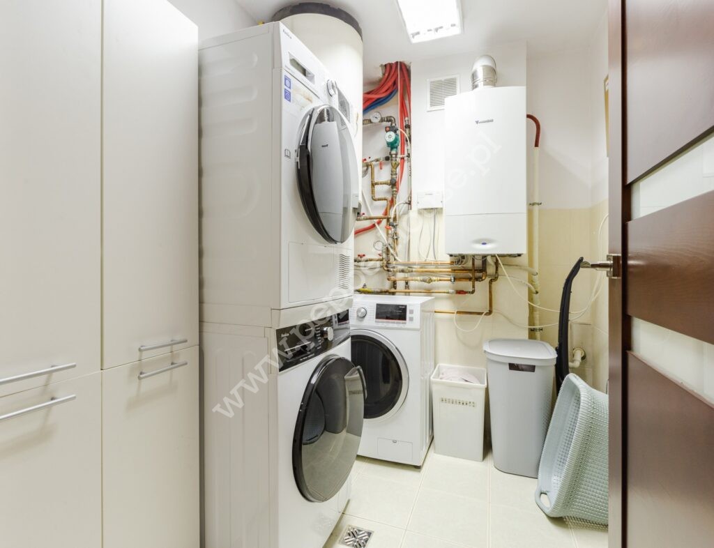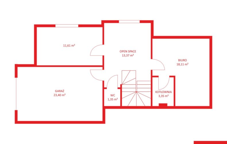 Dom jest w pełni podpiwniczony. Na tym poziomie wydzielono miejsce na gabinet połączony z pokojem dla gości, pralnię oraz kotłownię, garaż z bezpośrednim wejściem, siłownię oraz praktyczną strefę do przechowywania, co znacząco zwiększa funkcjonalność nieruchomości i pozwala dopasować przestrzeń do indywidualnych potrzeb klienta.