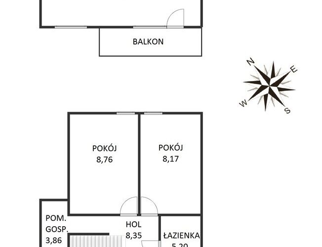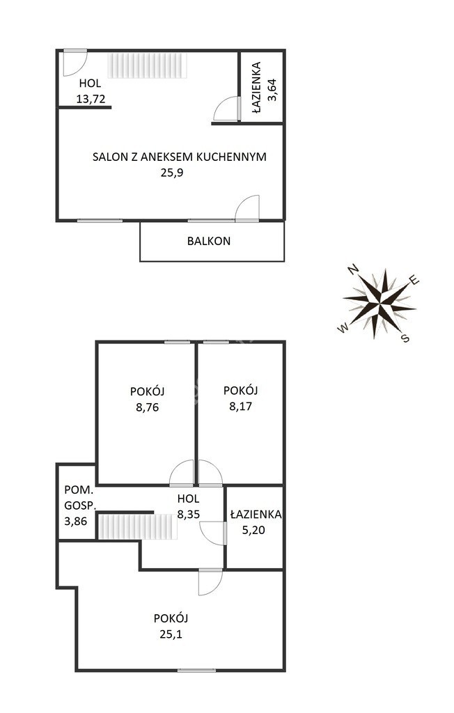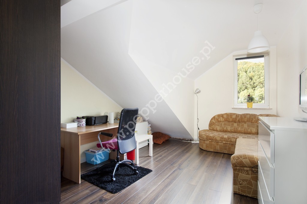 poddasze: 2 pokoje (8,76m2 + 8,17m2) , duży pokój o powierzchni ponad 25m2, łazienka (5,2m2), holu oraz pomieszczenia gospodarczego (3,86m2).