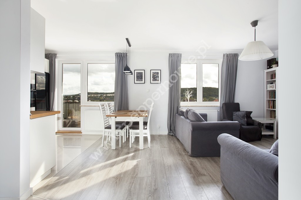 Eleganckie połączeni szarości, bieli i brązu które dominują w mieszkaniu łączą elegancje z klasyką kolorów.