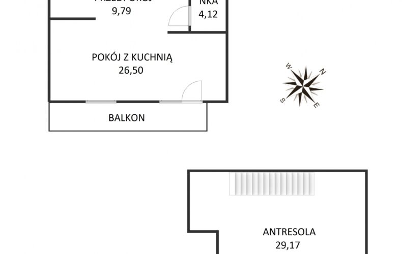 W skład mieszkania wchodzi: salon z aneksem kuchennym o powierzchni 15,22, oddzielna sypialnia (11m2) lub mozliwosc polaczenia w przestronną cześć dzienna salon z aneksem kuchennym, holu z wnęka na szafę pod zabudowę oraz łazienki o powierzchni 4,12. Oraz poddasza użytkowe o łącznej powierzchni 29,17m2. Mieszkanie posiada bardzo duży balkon. Dowolna aranżacja ścianek działowych.