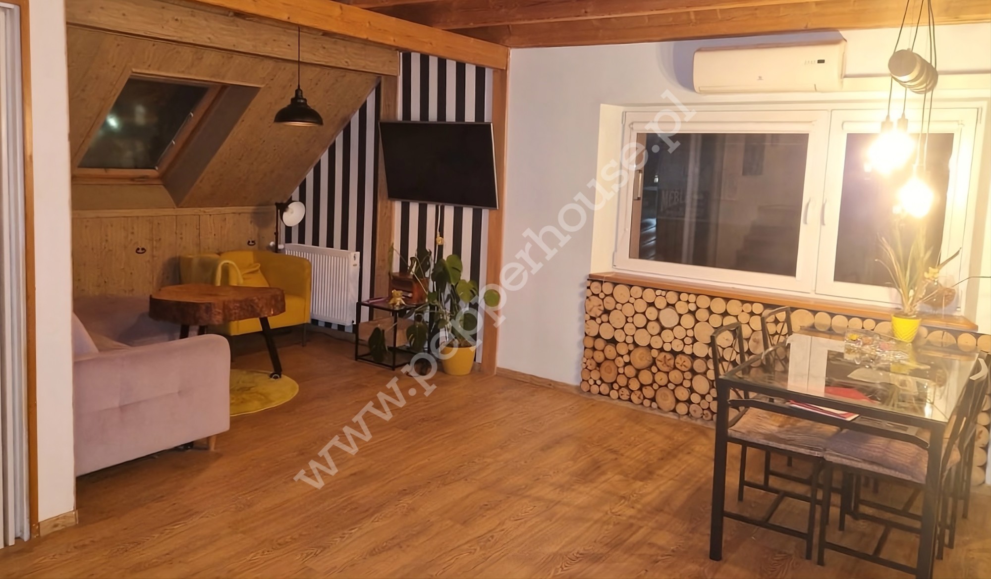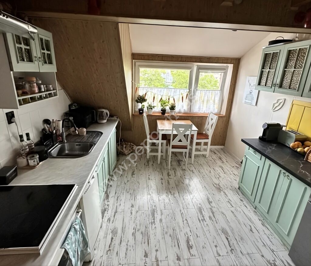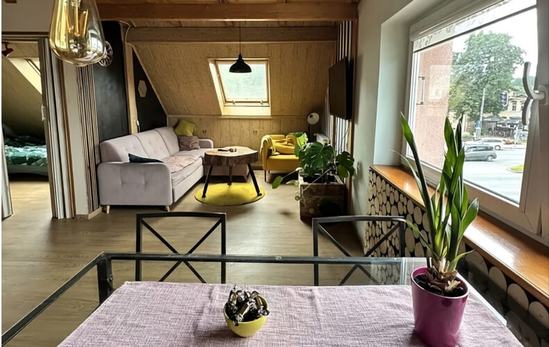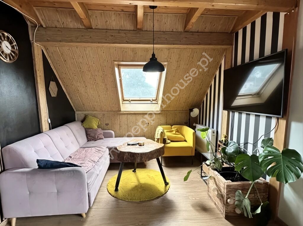 Mieszkanie o powierzchni 60 m² składa się z: salonu , dużej kuchni, sypialni, łazienki z WC oraz przedpokoju. Drugi poziom to dodatkowa przestrzeń w postaci antresoli. Mieszkanie jest umeblowane, a wszystkie podstawowe meble pozostają w cenie, co pozwala nowemu właścicielowi szybko się wprowadzić.
