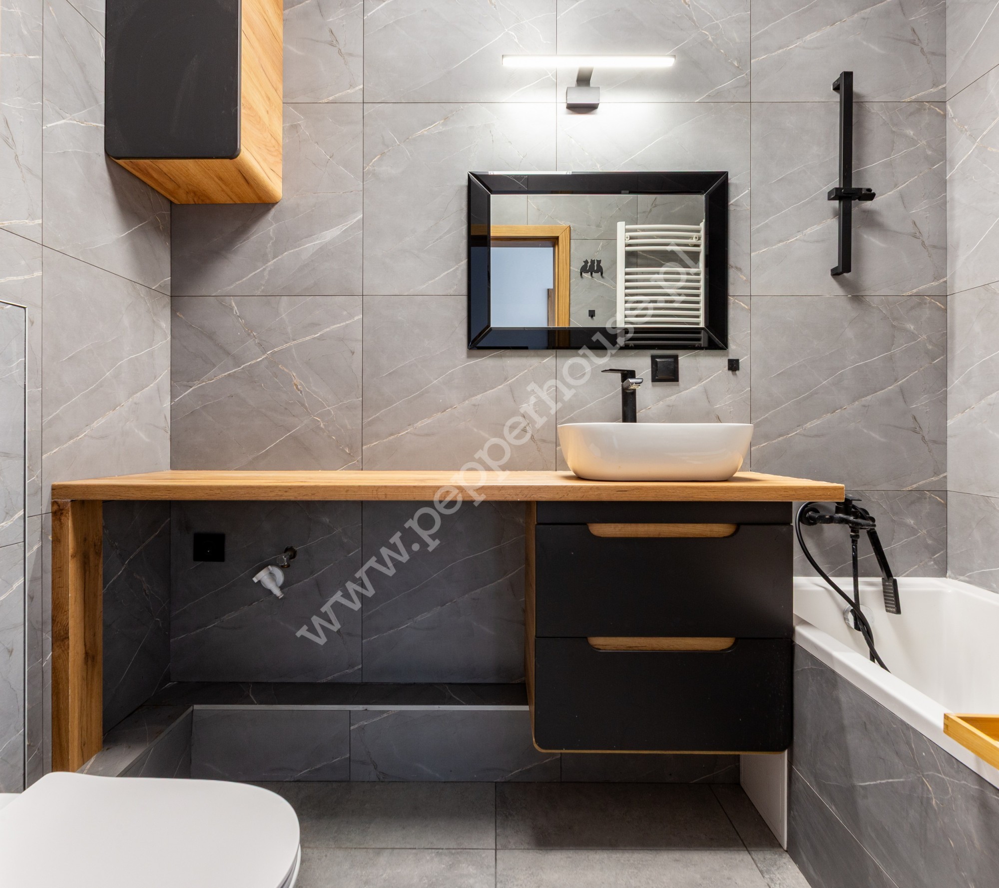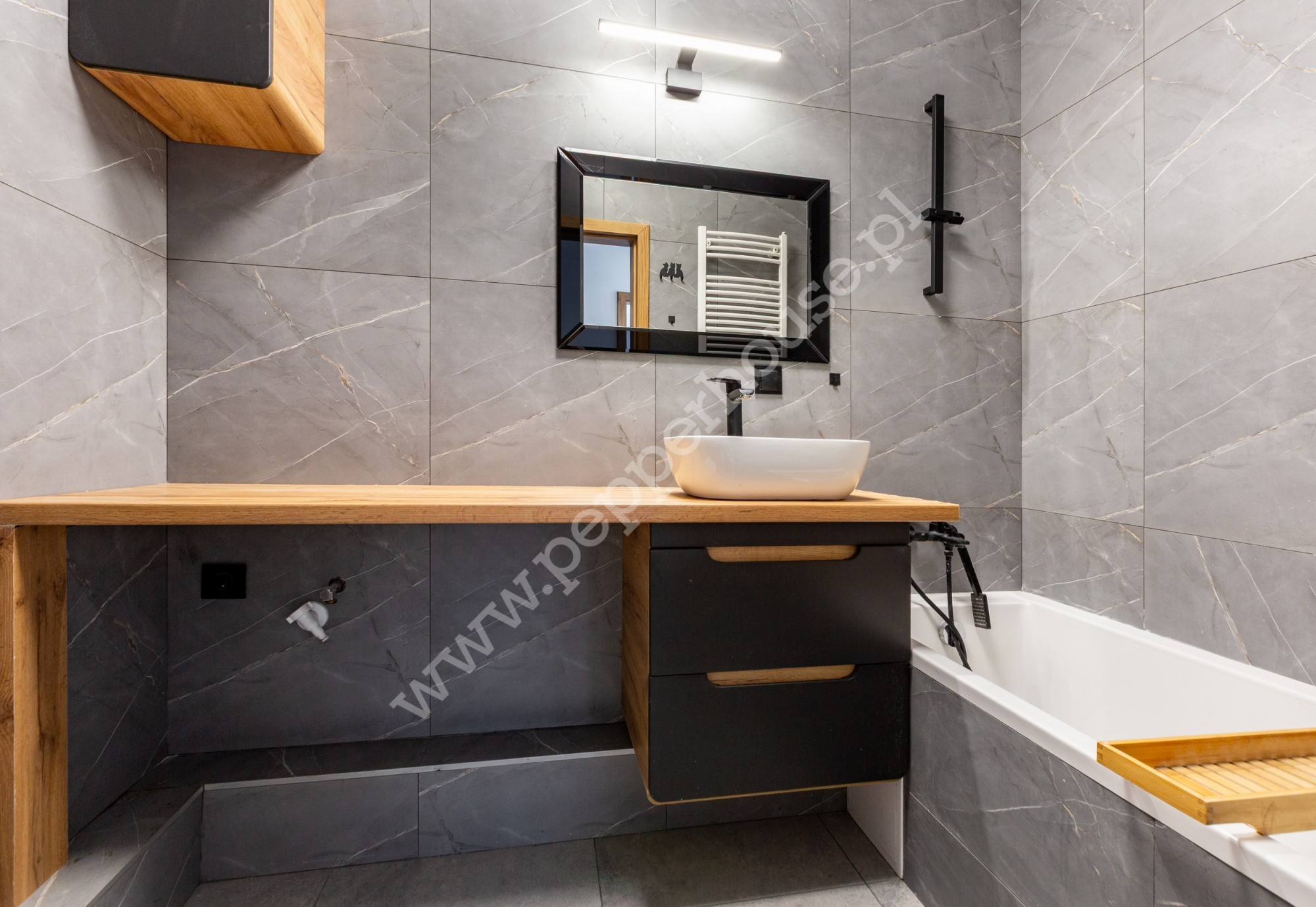 łazienka w nowoczesnych kolorach z wysokim blatem i miejscem na pralkę oraz wanna