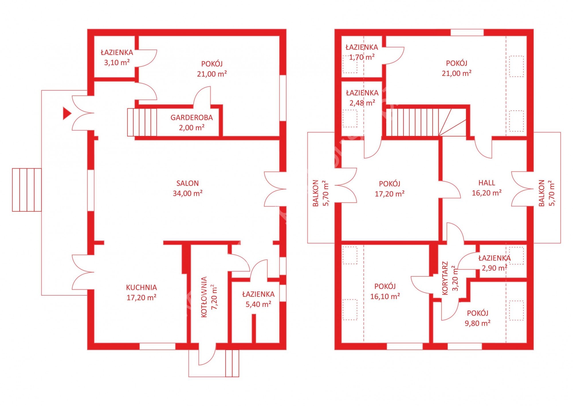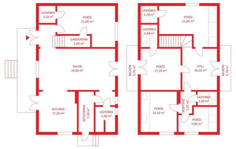 – 4 sypialnie (21 m2, 17,2 m2, 16,1 m2, 9,8 m2), każda z łazienką,