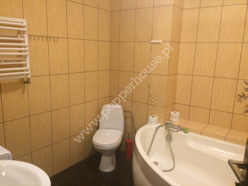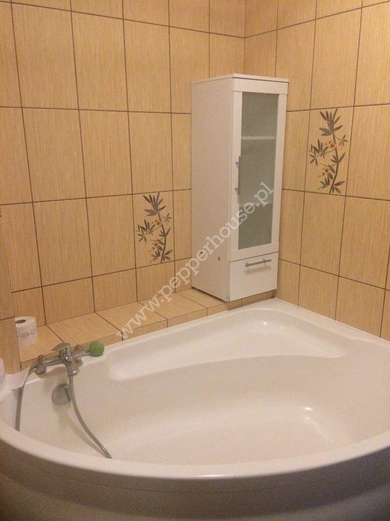 W łazience znajduje się duża wanna oraz jest połączona z WC.