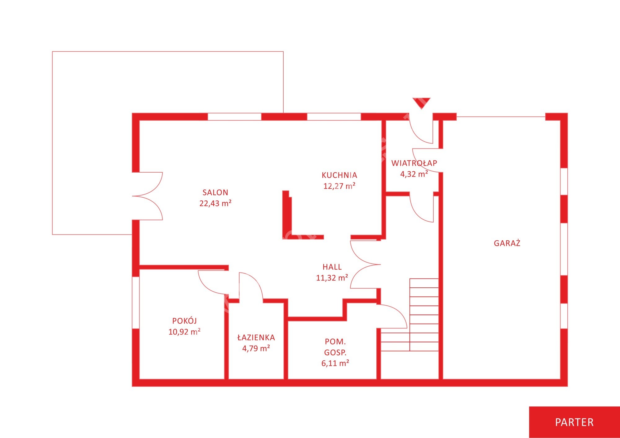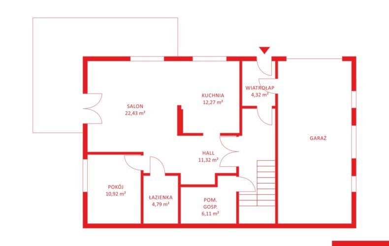 - Wiatrołap (4,32 m²) – praktyczne miejsce na szafę lub zabudowę na buty i odzież wierzchnią.