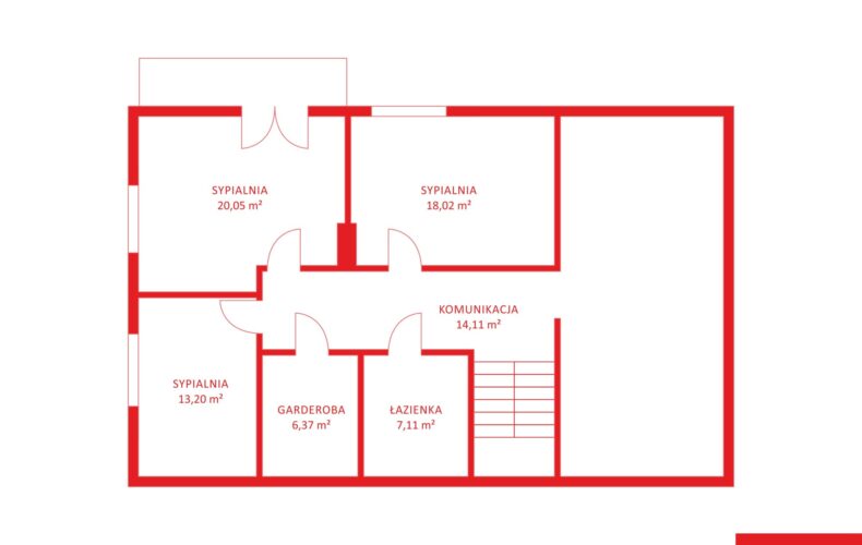 - Sypialnia 1 (20,05 m²) – największa sypialnia, idealna jako główna sypialnia właścicieli domu.