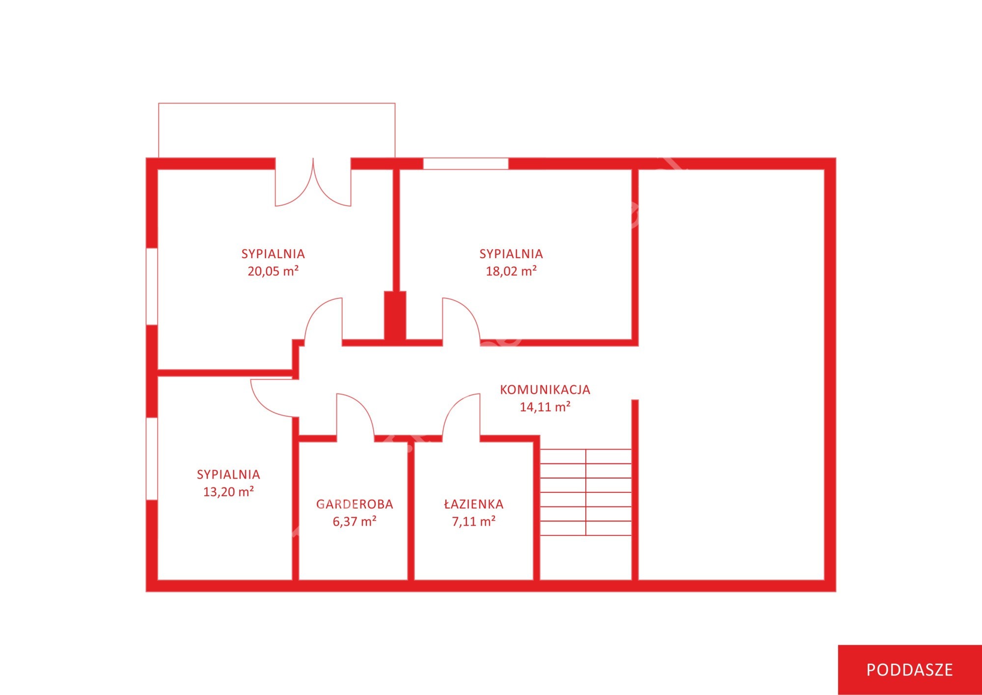 Poddasze – stan surowy do wykończenia – to część prywatna domu, przeznaczona głównie na sypialnie i strefę relaksu. Układ pomieszczeń jest następujący: