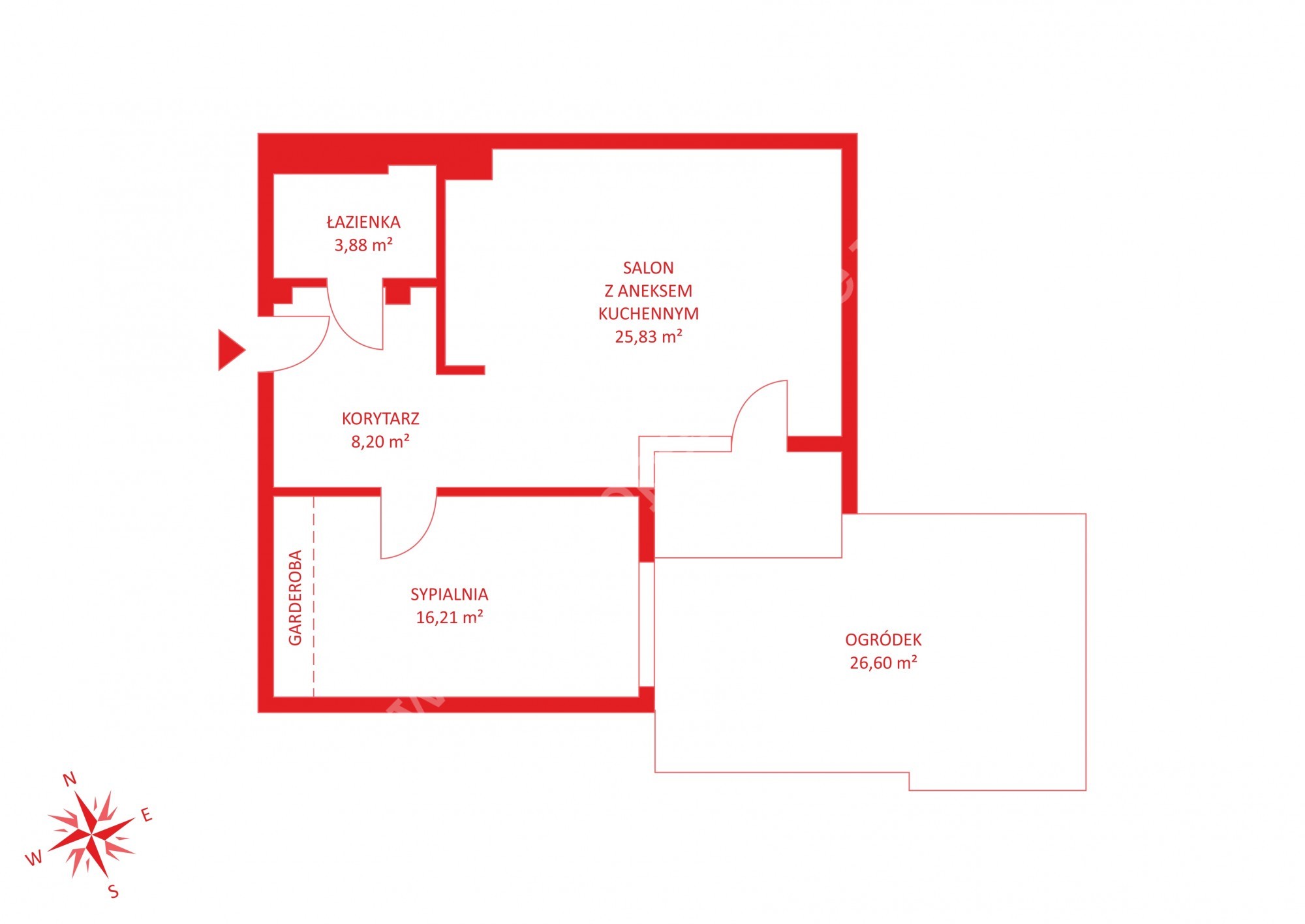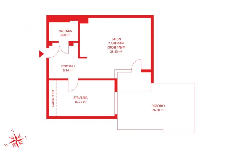* salonu z aneksem kuchennym (25,83 m2) z bezpośrednim wejściem do ogrodu o powierzchni 26,6 m2