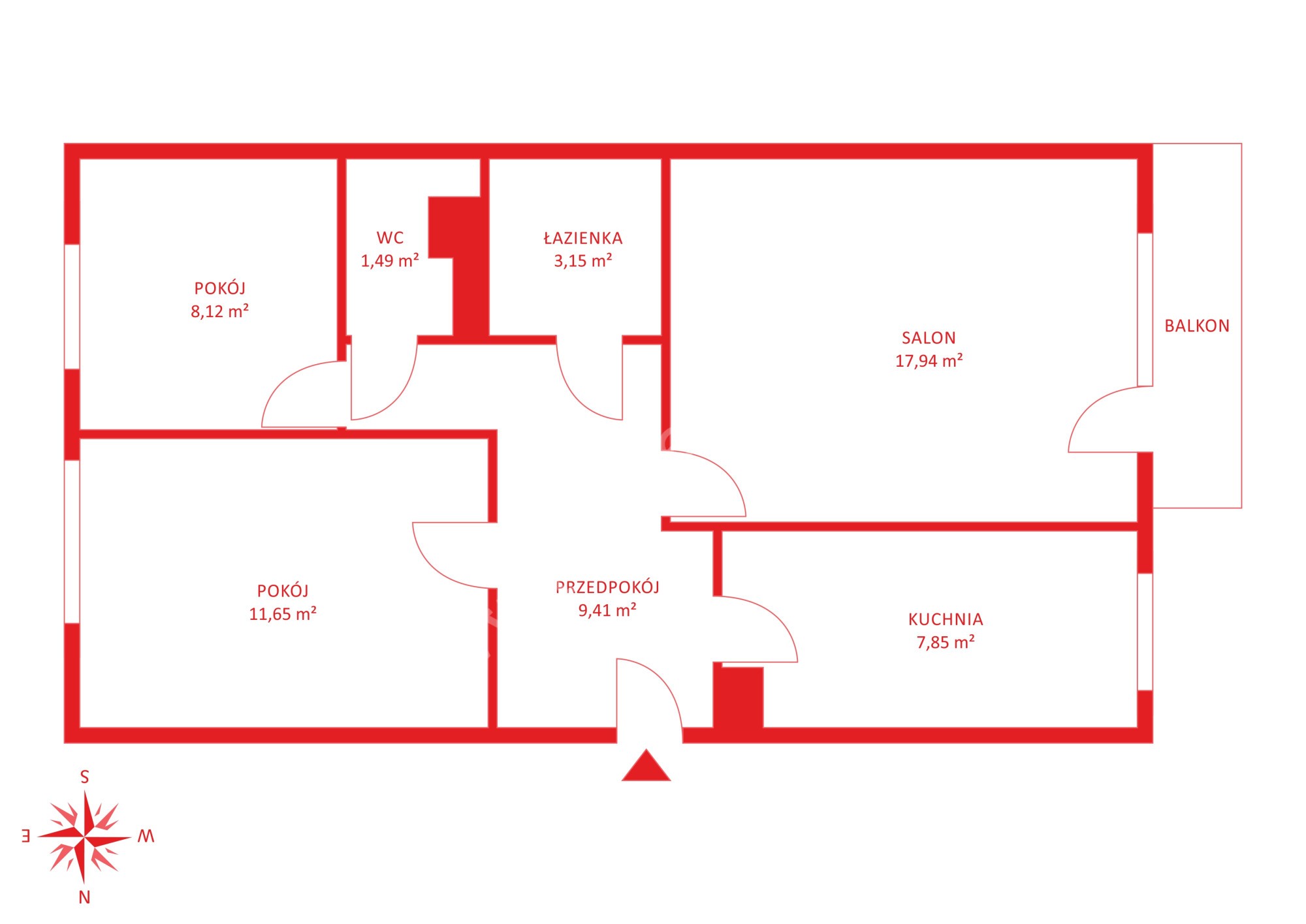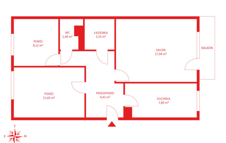trzech ustawnych pokoi; 17,49m2, 11,65m2 i 8,12m2