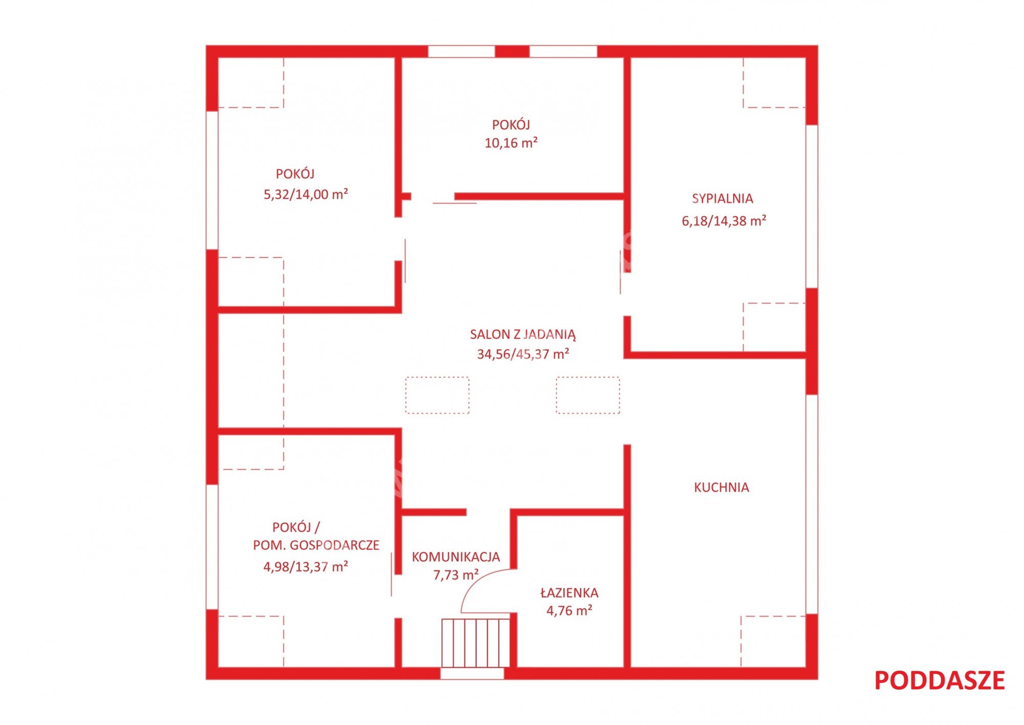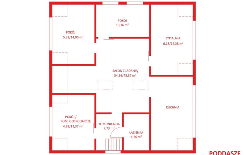 Poddasze – powierzchnia użytkowa wpisana w Księdze Wieczystej to 43,41 m2 (powierzchnia po podłodze to aż 109,77 m2).