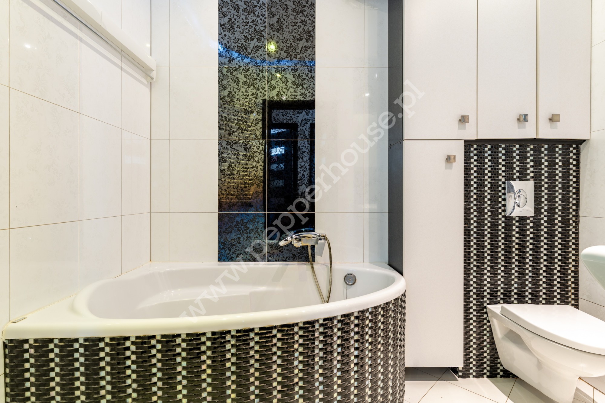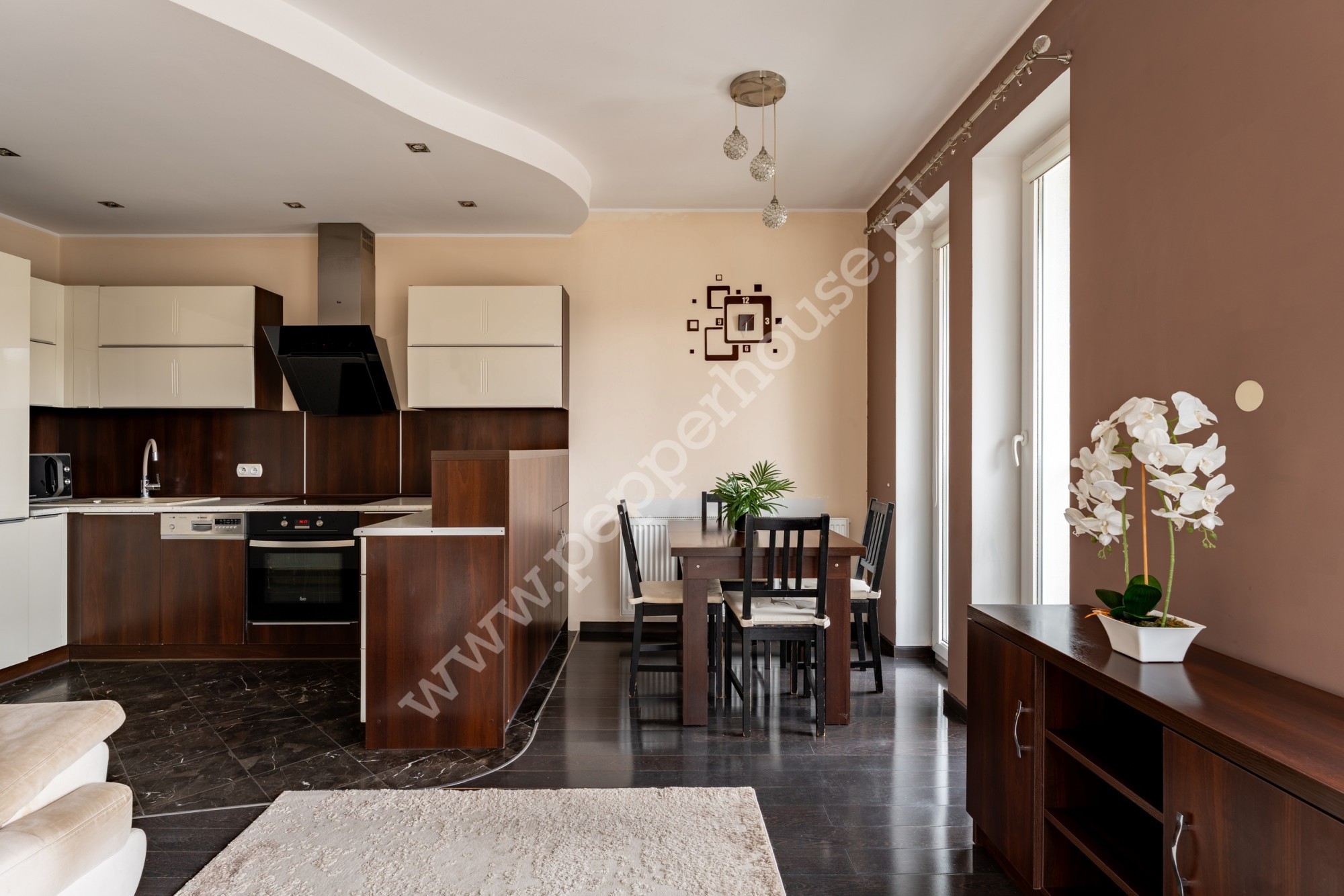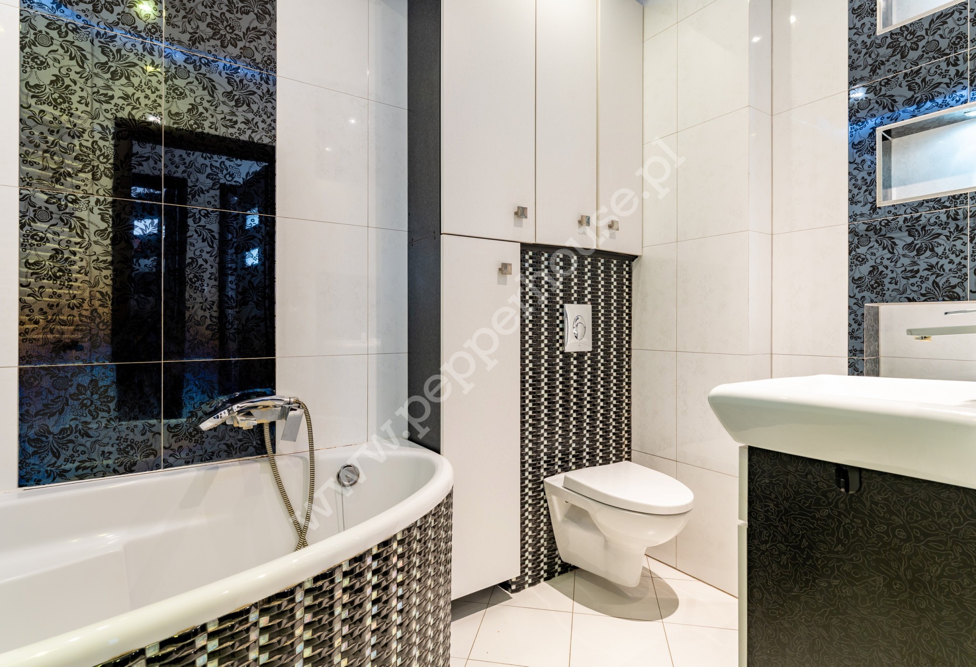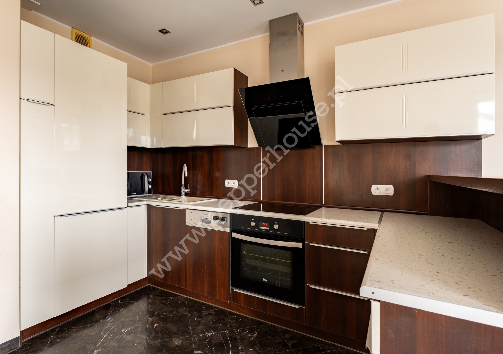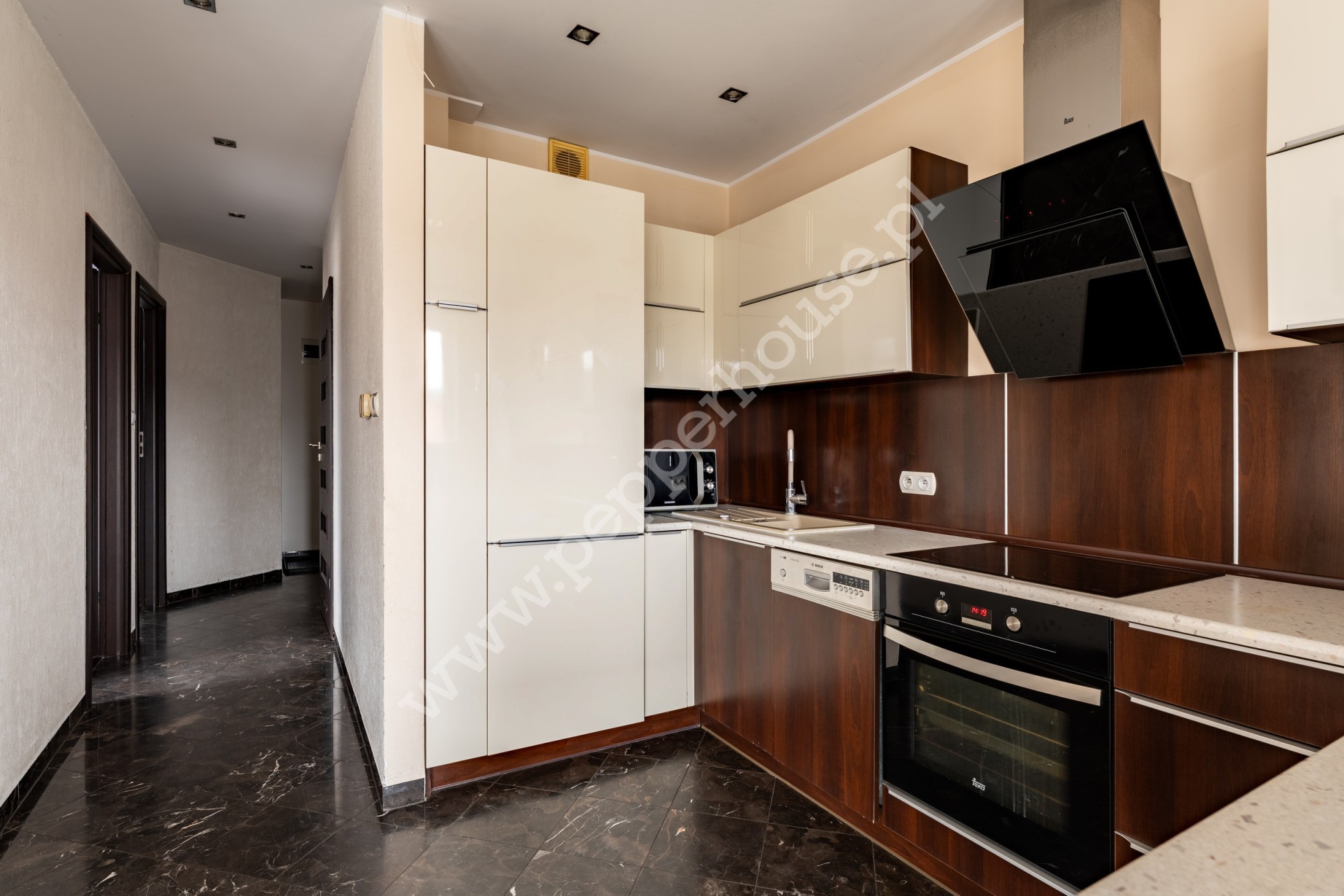 Wnętrze zostało wykończone w standardzie umożliwiającym aranżację według własnych potrzeb, z wykorzystaniem zabudowy meblowej wykonanej na wymiar. Kuchnia wyposażona jest w sprzęt AGD (lodówka, zmywarka, piekarnik, płyta grzewcza, mikrofalówka). Wszystkie meble oraz wyposażenie widoczne na zdjęciach pozostają w cenie nieruchomości.
